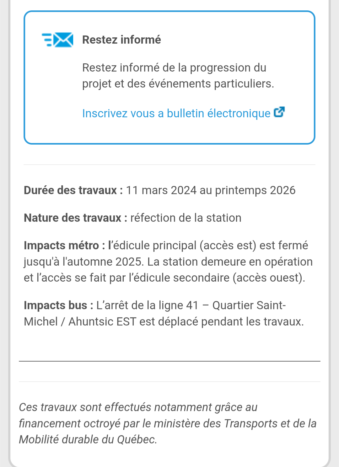 L’édicule secondaire (accès ouest) sera fermé à compter du 19 septembre 2025 jusqu’à l’été 2026. La station demeure en opération et l’accès se fait par l’édicule principal (accès est).