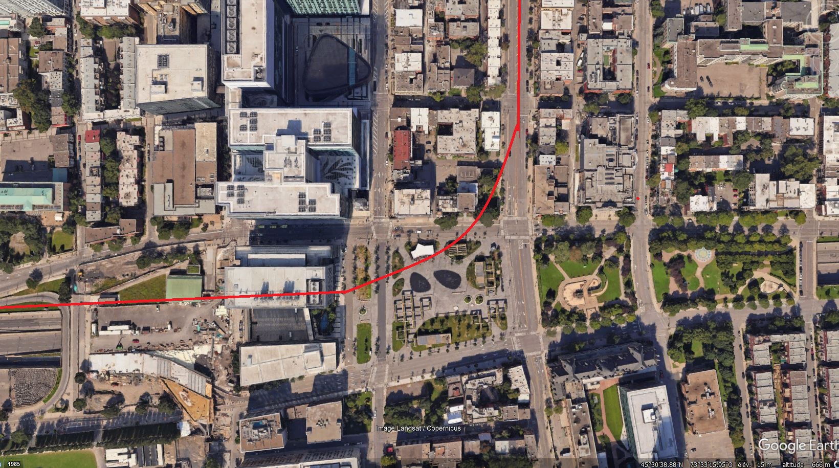 La courbe de la ligne orange faite en tranchée à Berri-Viger est très prononcée comparée aux courbes creusées par tunnelier à Snowdon.