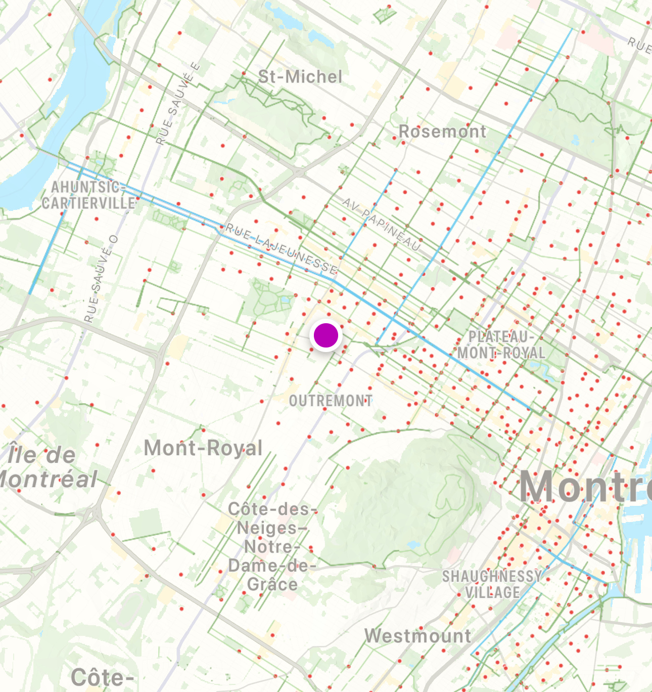 Je crois que les données pour les pistes cyclables viennent d’OpenStreetMap. J’ai ajouté parti du REV 2 récemment. (Et je vois quelques pistes près de moi qui ne sont pas visibles, et ça veut dire que je dois les régler ce soir…)