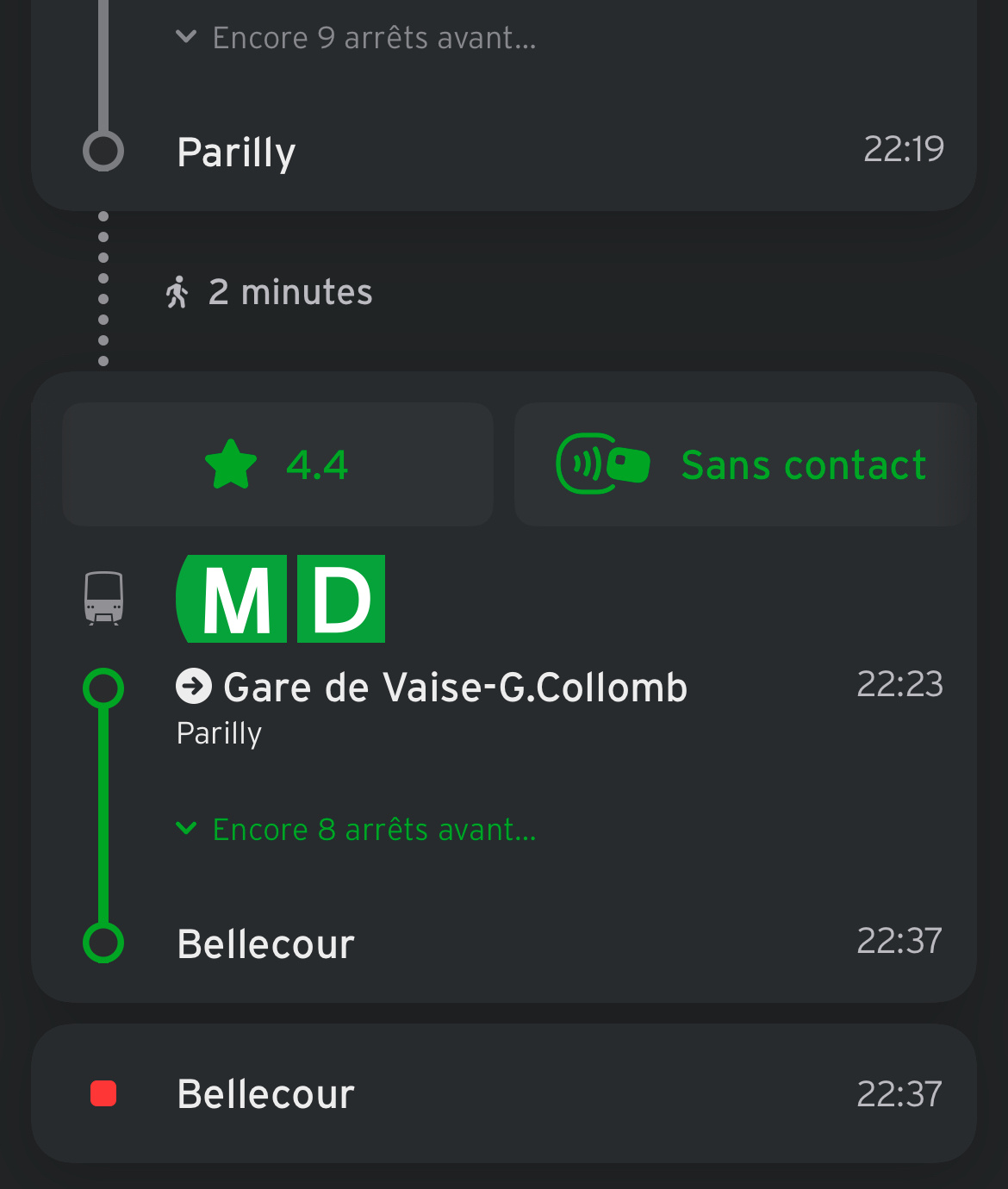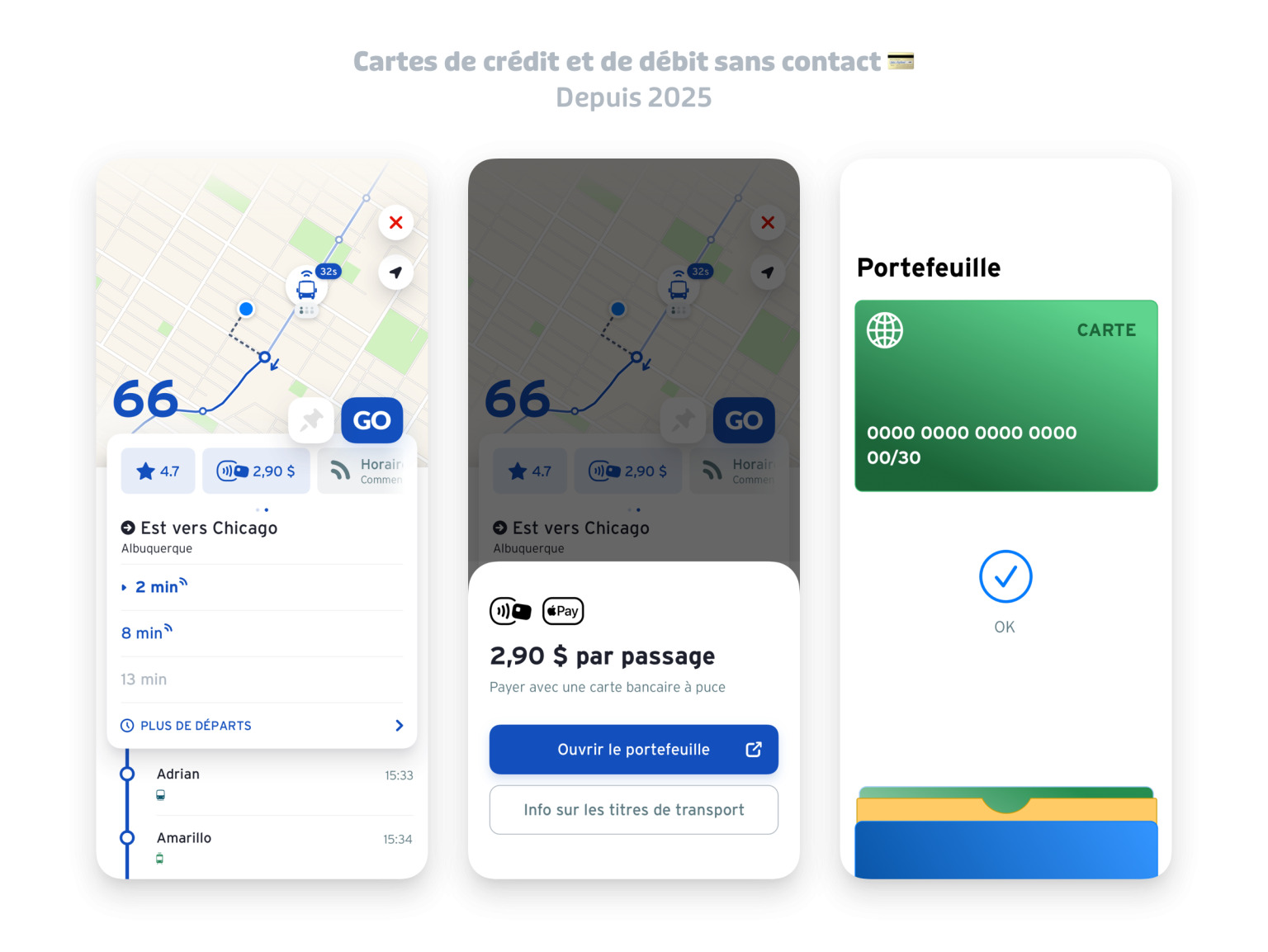 Quand vous ouvrez Transit, l’appli vous dit maintenant si votre bus ou votre métro accepte les paiements sans contact par carte de crédit ou de débit . Si c’est le cas, on vous redirige directement vers le Portefeuille Apple ou le Google Wallet pour vous permettre de payer avec votre téléphone et d’aussitôt reprendre la route.