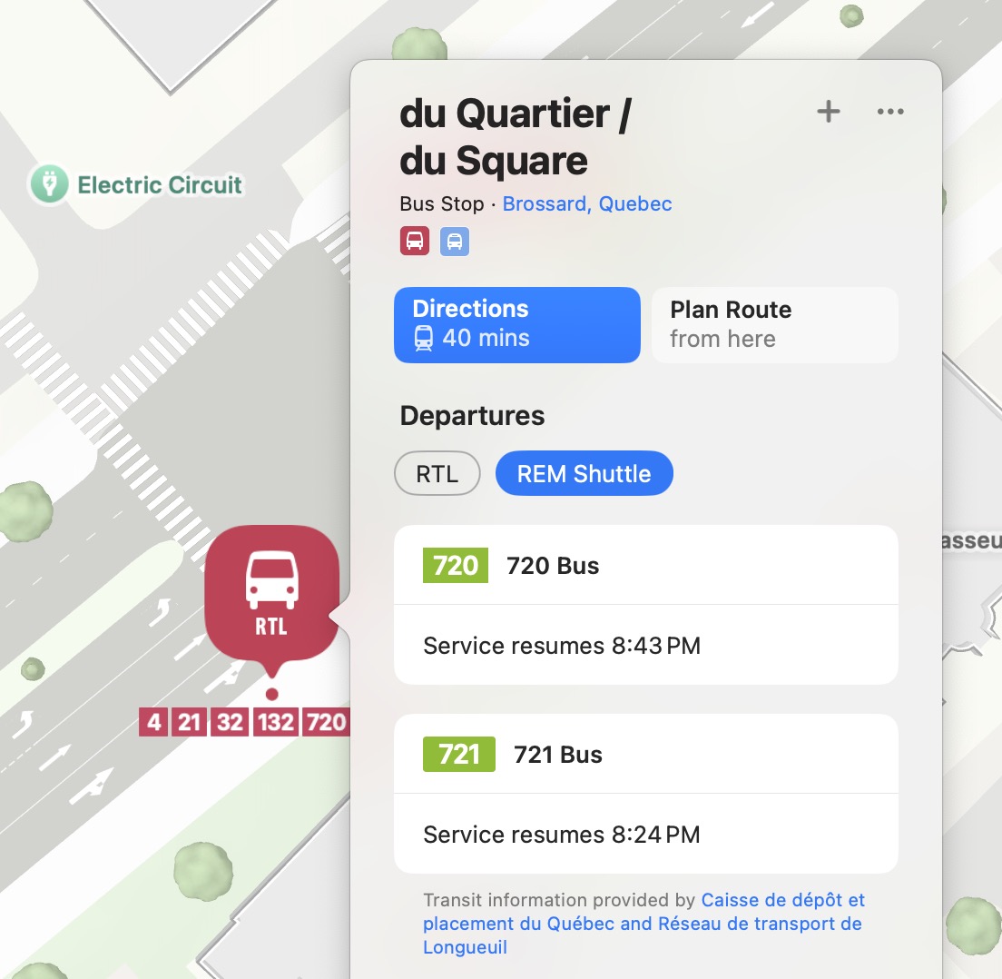As the REM Shuttles are finally having their data shared, Apple Maps has added the REM shuttles, originally part of RTL, now REM green in their own category. There’s no unique logo for them yet: