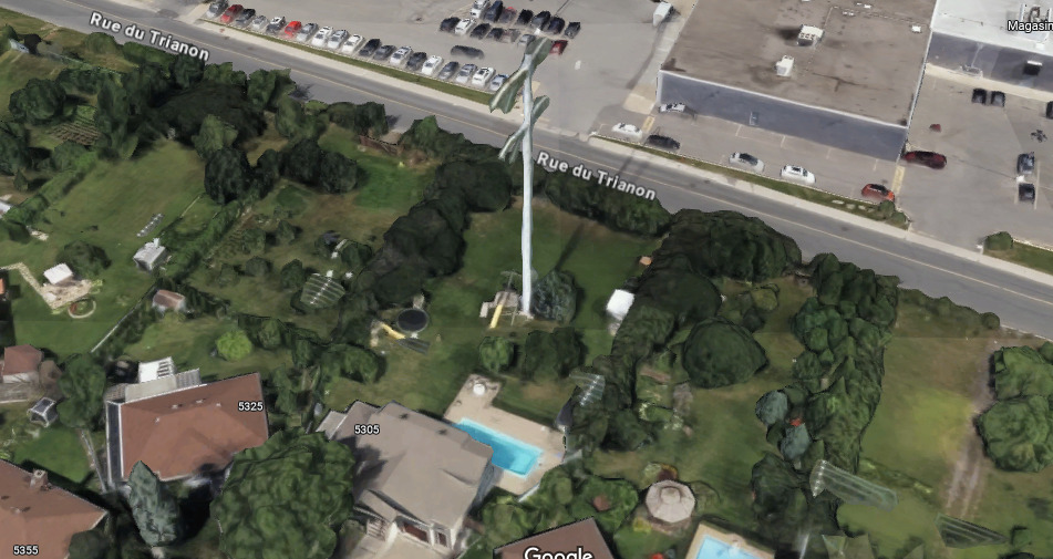 Je me disais aussi que les lignes ont du être construites par après (bien que ce n’est pas ce que la carte semble suggérer) et que les citoyens ont du garder un droit de servitude pour leur cours, mais ça me semble tellement bizarre cette cours qui a un pylône à haute tension en plein centre. Le pire je pense, ce n’est pas le pylône, mais la ligne de 6 cables à côté qui passe presque directement au dessus de la piscine creusée.