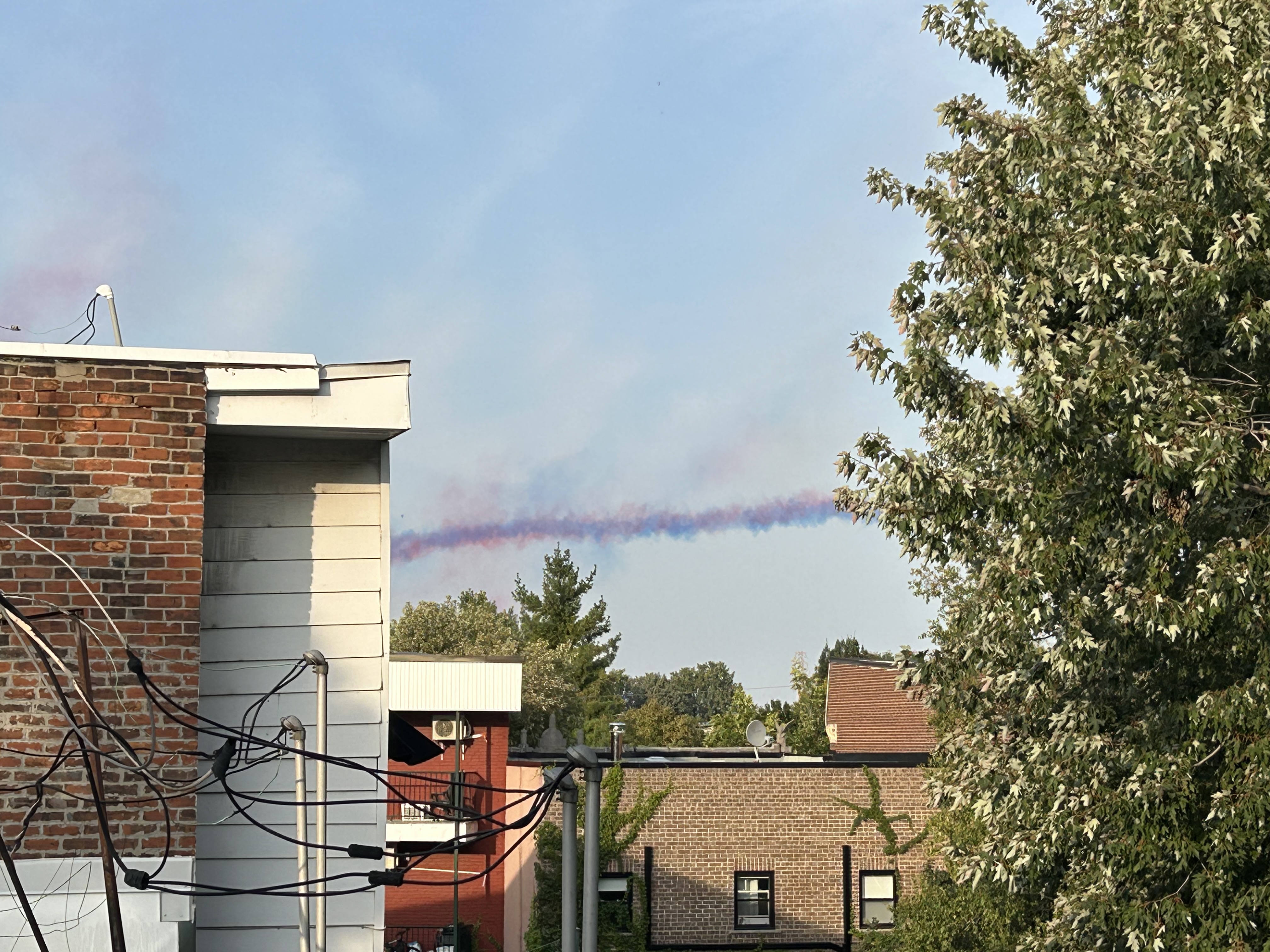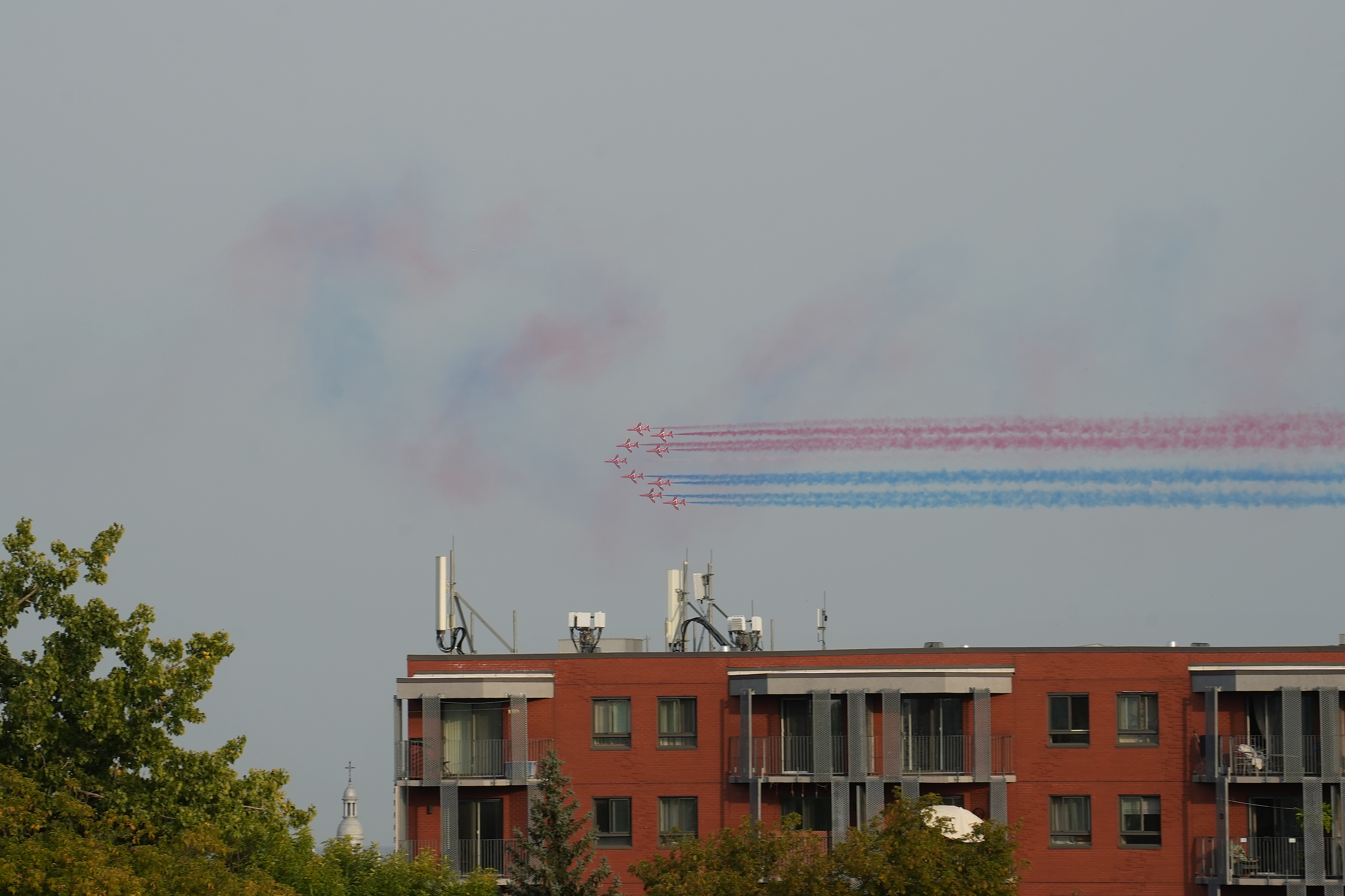Il y a des avions de l’armée qui a passé deux fois au dessus de Griffintown/Vieux-Montréal en laissant une trainée bleue et rouge. Je n’ai pas pris de photo, mais je les ai bien entendus