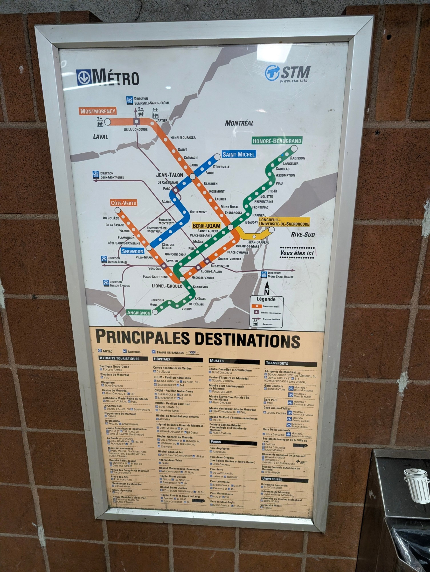 Une carte du métro à la station Henri-Bourassa est tellement pas à jour que non seulement elle a l’ancien logo de la STM dessus (donc avant 2009) mais elle montre une ligne de train qui n’existe plus (Deux-Montagnes), ne montre PAS une ligne de train qui existe (Mascouche), liste PLUSIEURS hopitaux qui ont fermé et ont été remplacés par le CHUM et le CUSM, dit aux gens d’aller prendre “L’aérobus” à Bonaventure pour se rendre à YUL, réfère encore à la ligne Vaudreuil/Dorion comme “Dorion-Rigaud”, envoie les gens à Bonaventure pour le planétarium, et Namur pour un Hypodrome qui n’existe plus.