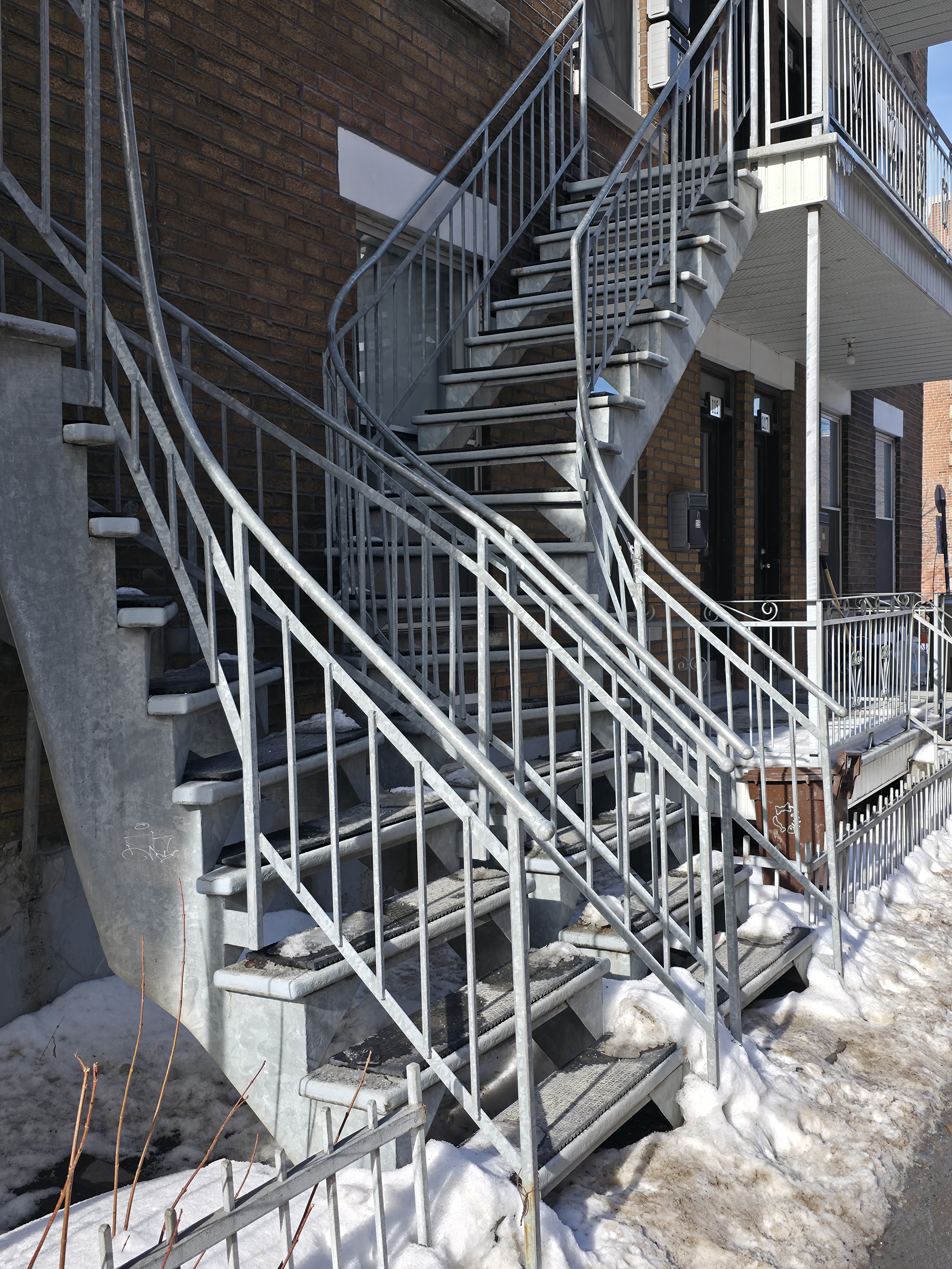 J’ai entendu que la ville de Montréal exige de remettre les escaliers en colimaçon typique du début du 20e siècle lors d’une rénovation. Exit les escaliers de style “Rona” qui “tournent” carrés à 90 degrés et qui pullulaient dans les rénos des années 80 et 90. Toutefois, je remarque qu’on ne semble pas exigeant sur la couleur. On semble, ici du moins, permettre un aluminium de base sans pigmentation, plutôt que de compléter avec une peinture noire ou blanche d’origine. Ça enlève, selon moi, au pari qualitatif de redonner l’aspect d’origine.