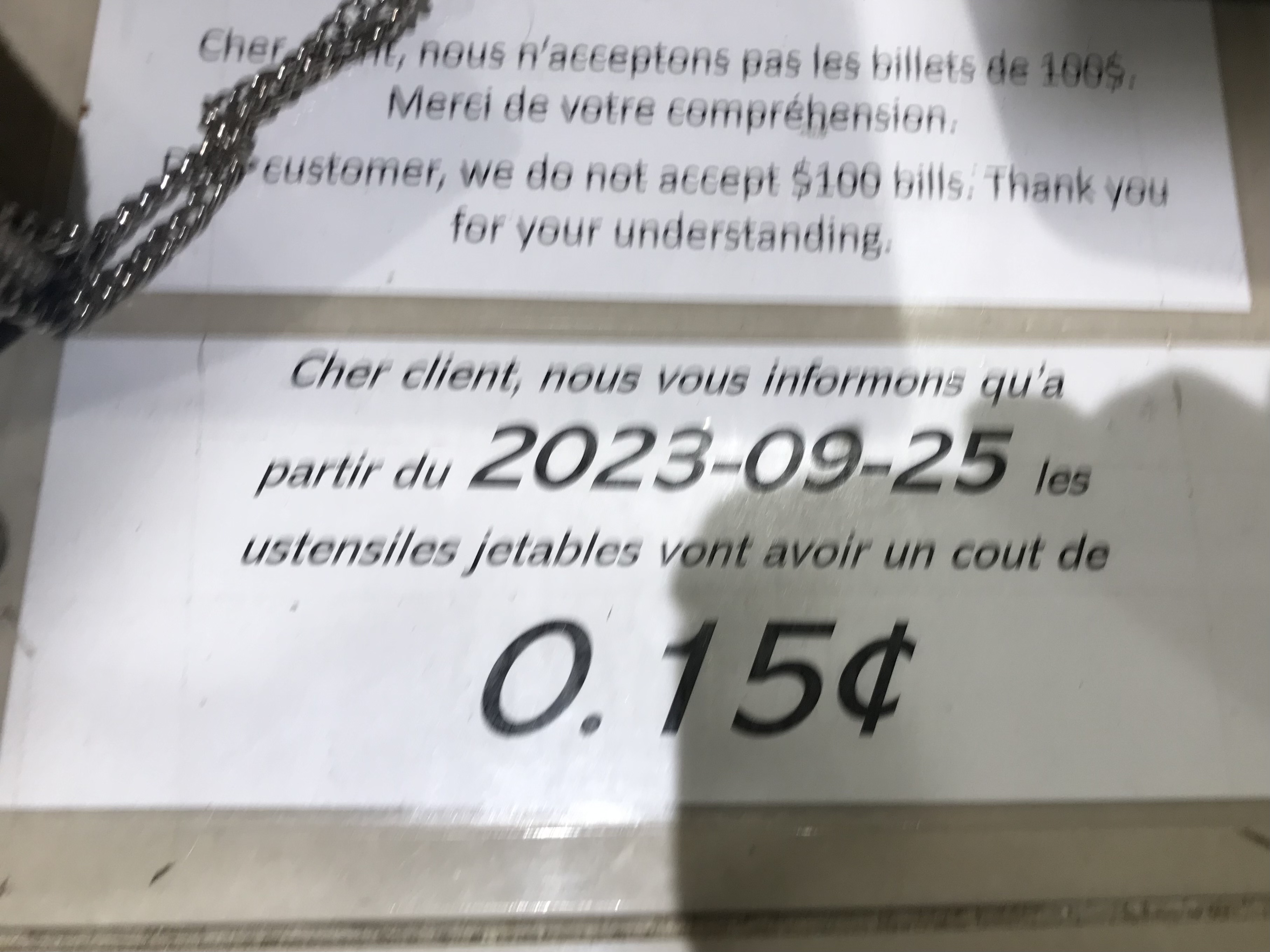 Je ne sais pas où mettre ça, mais voici: dans une boulangerie, j’ai vu une affiche qui informait que les ustensiles jetables coûtaient 0,15 ¢ (et non $ !) Ce n’est pas la première fois que ça se produit, mais ça donne l’idée de faire de l’arbitrage…