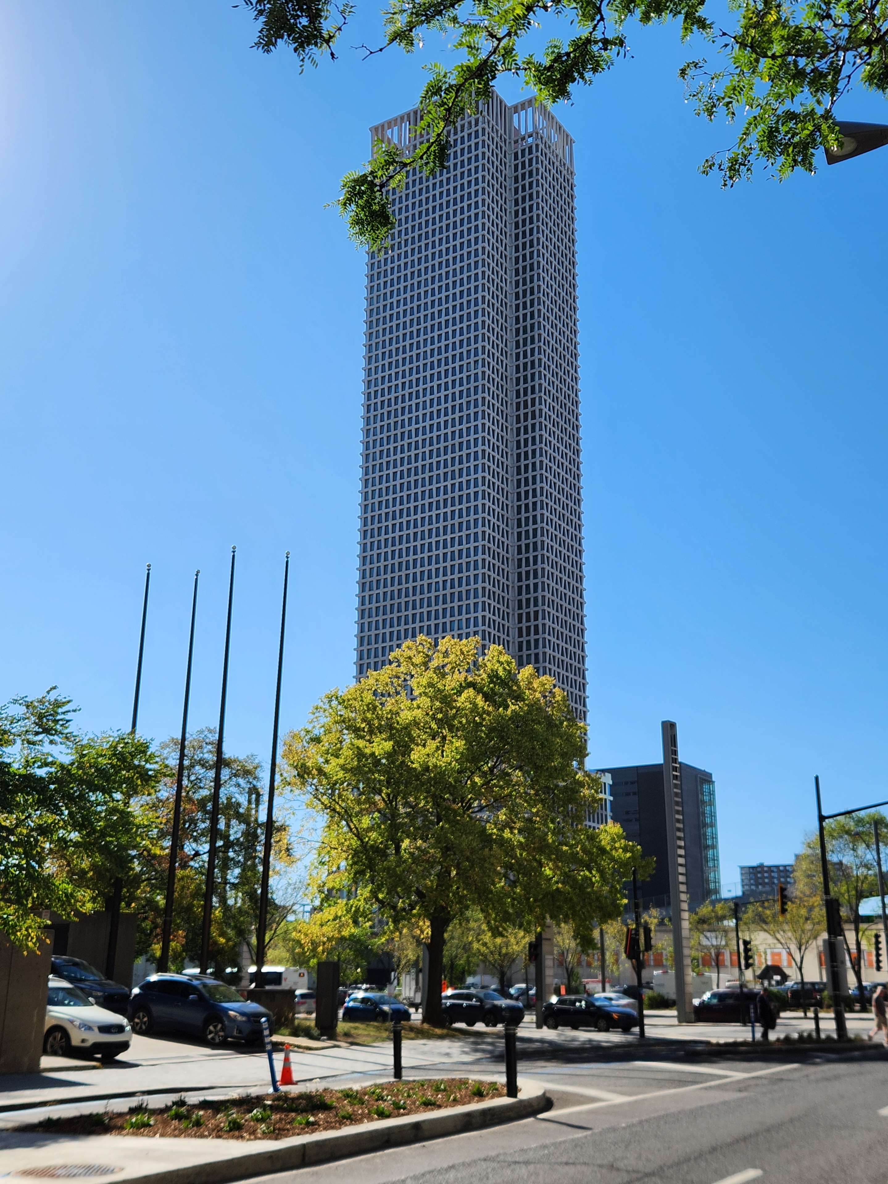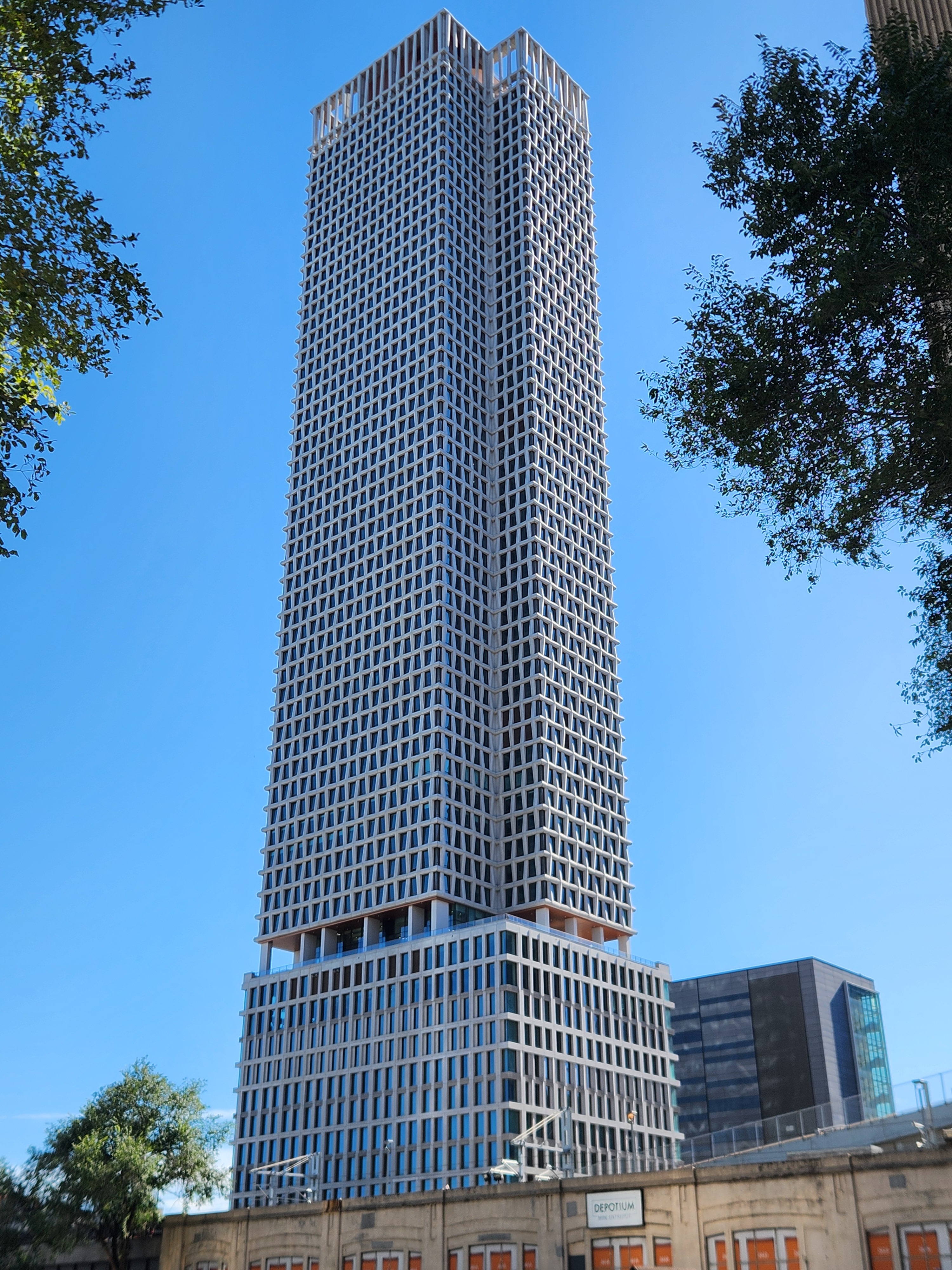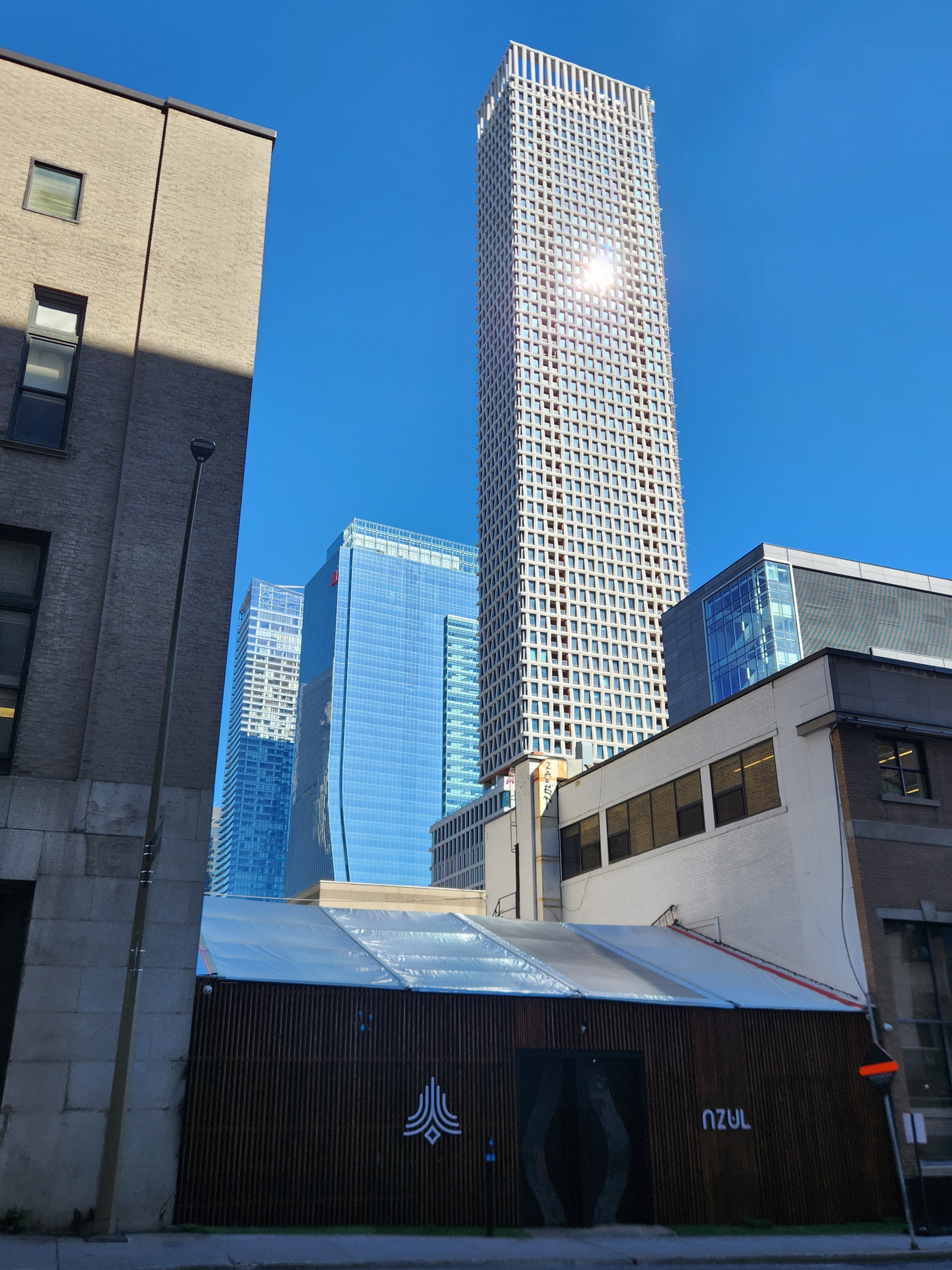 Après avoir constaté les reflets du soleil sur les parois, je peux confirmer qu’il y a des bandes LED verticales incrustées dans le revêtement de béton. Le soleil réfléchi de façon plus intensive à l’endroit où ces bandes se trouvent, au milieu de l’arrête angulaire des parois. On peut donc espérer le jeu majestueux de luminosité verticale par vague que l’on a déjà aperçu dans certains rendus passés.