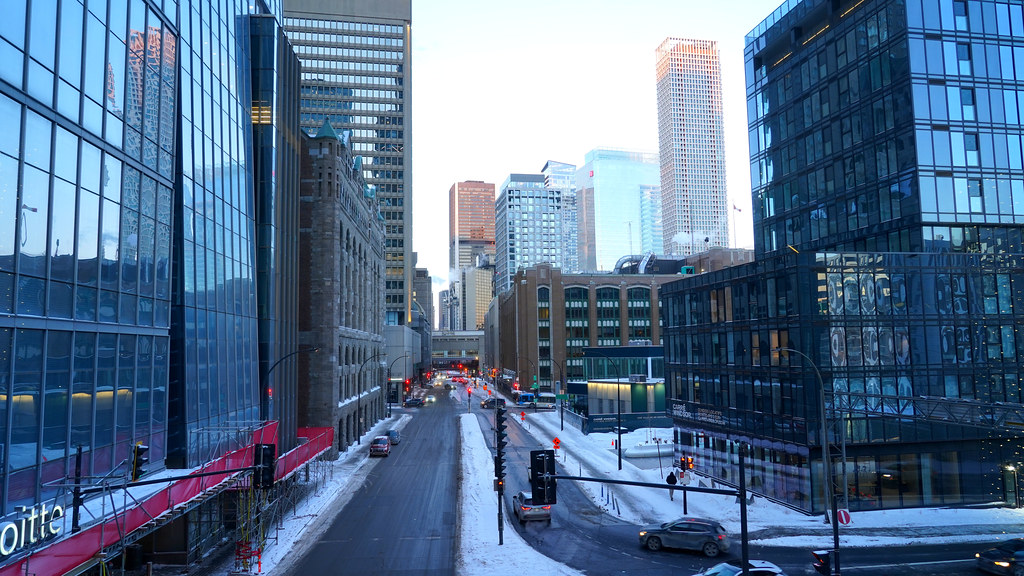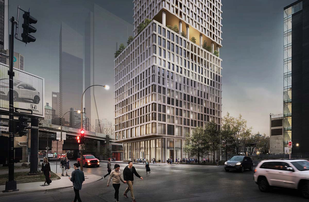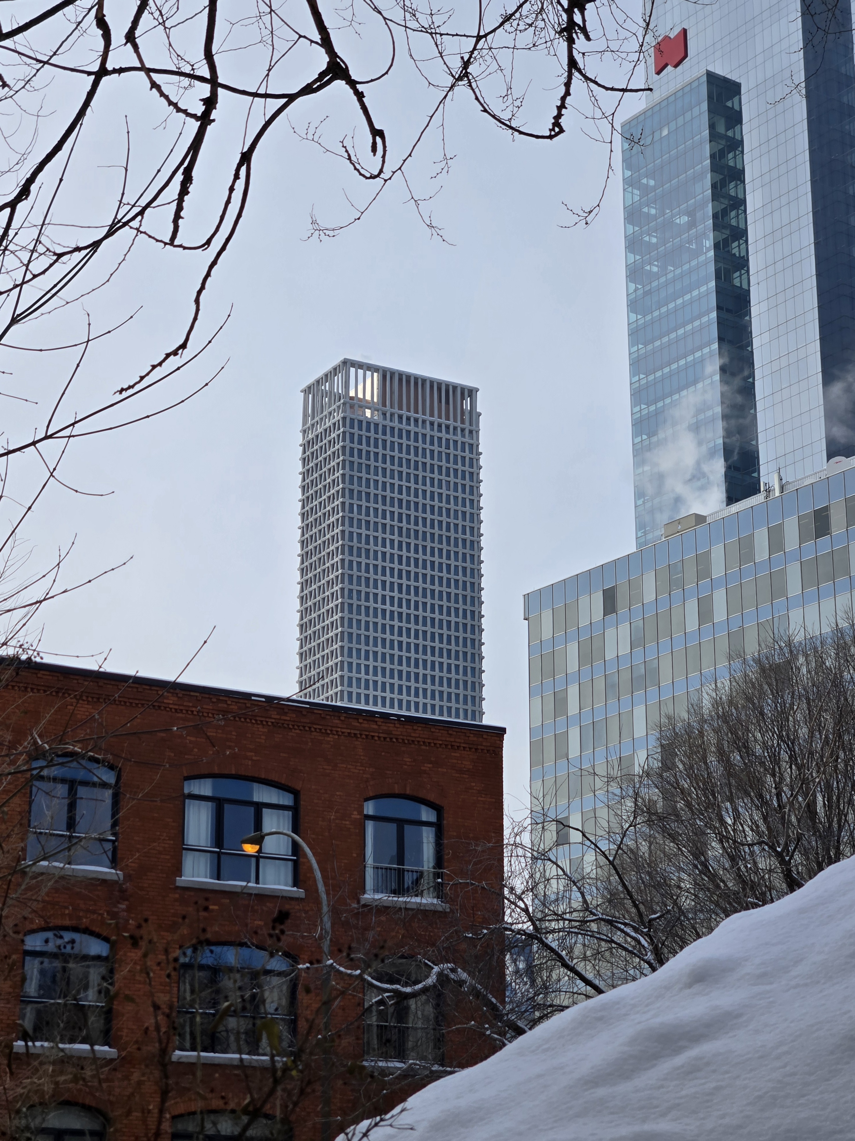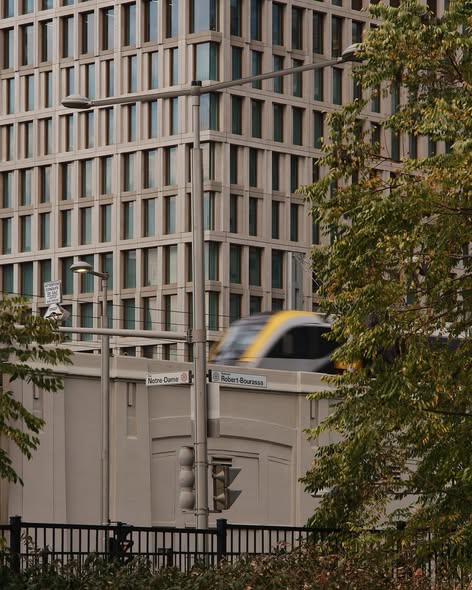 La tour du 900 Saint Jacques s’implante dans un paysage dominé par les infrastructures, rythmé par le mouvement continu des trains et des flux automobiles. Au cœur d’un Quartier des gares en profonde mutation, elle occupe un site autrefois résiduel, façonné par l’autoroute Ville Marie et les voies ferrées, aujourd’hui réinvesti comme un carrefour habité de mobilité durable.