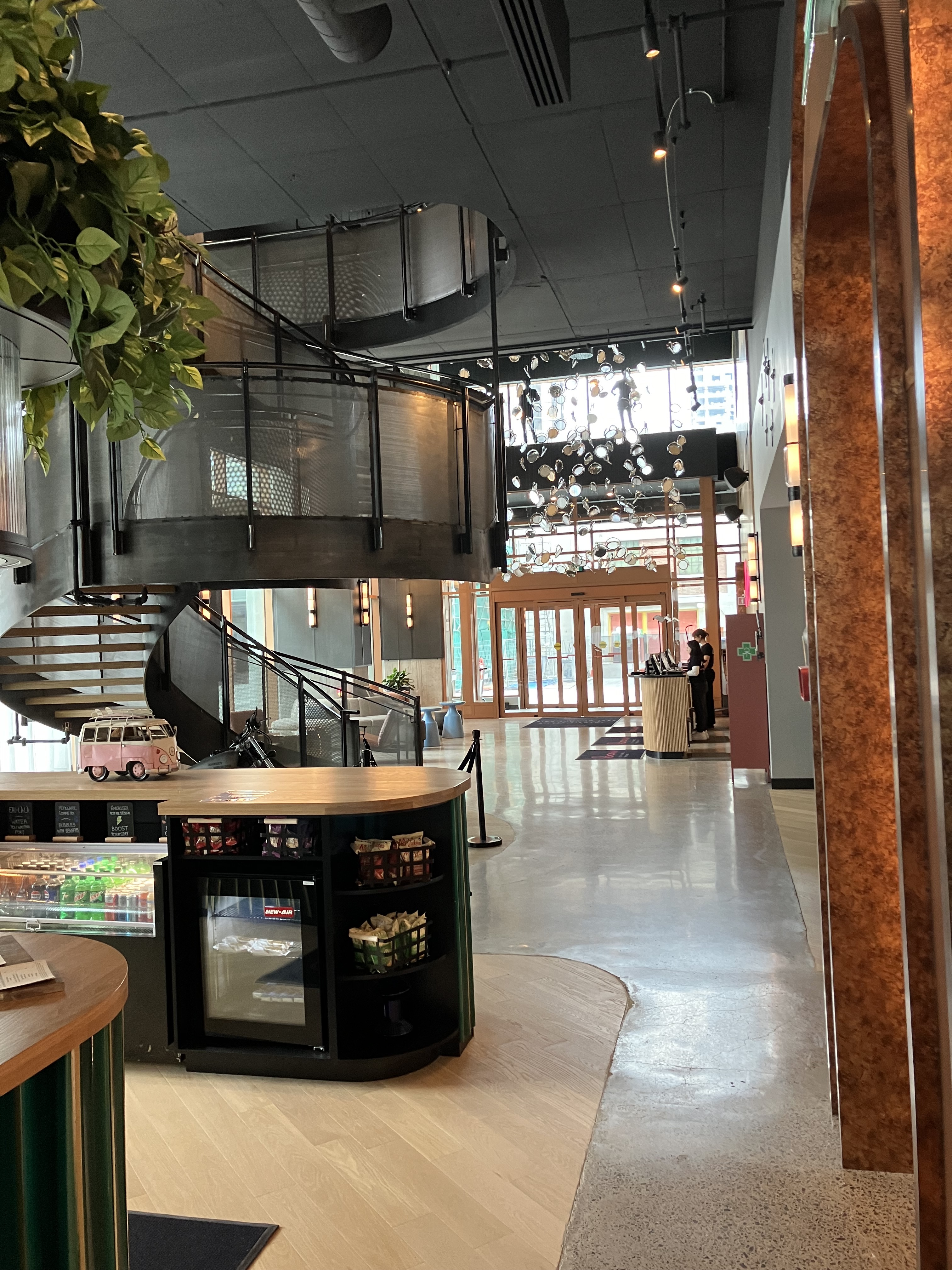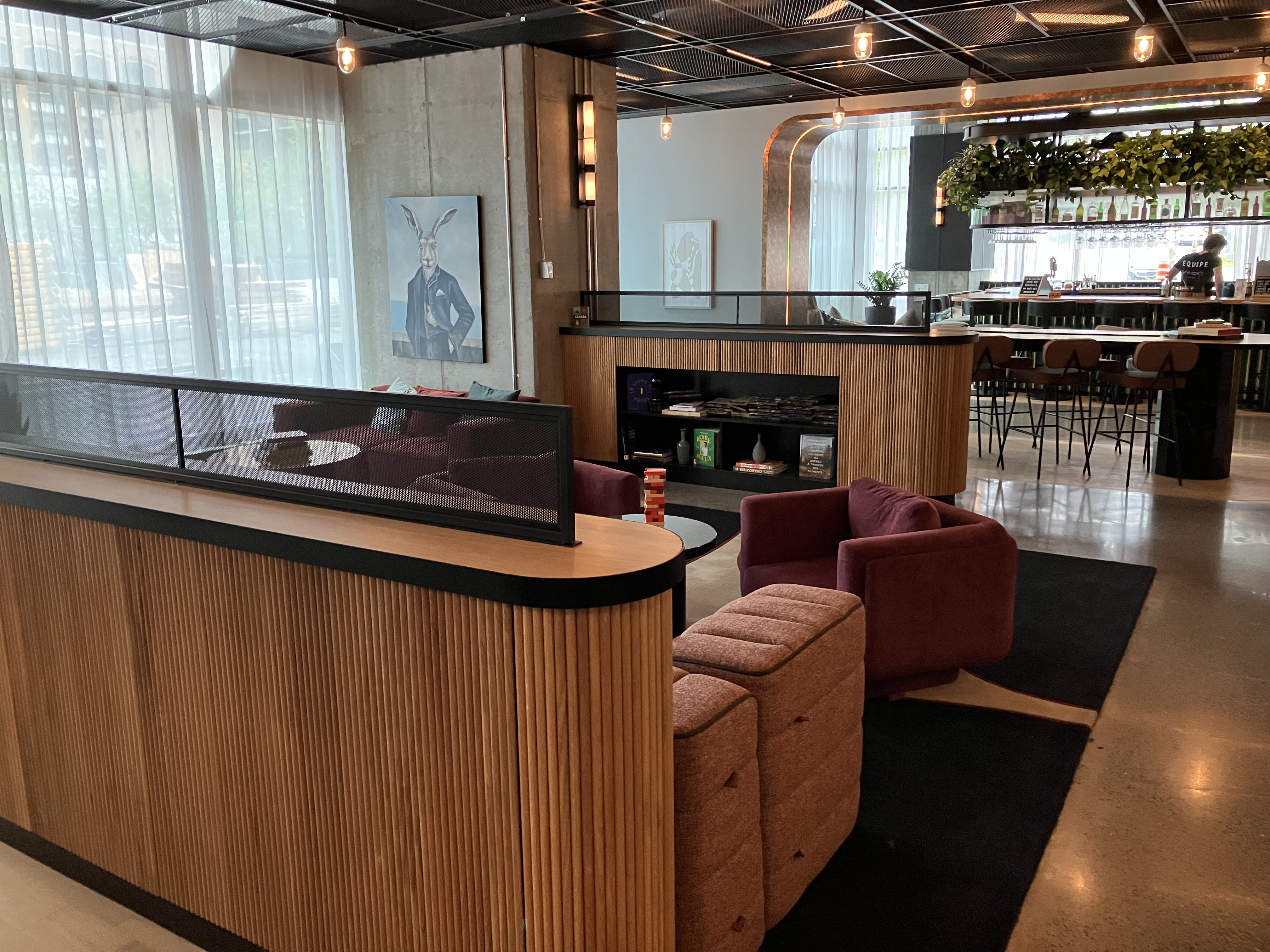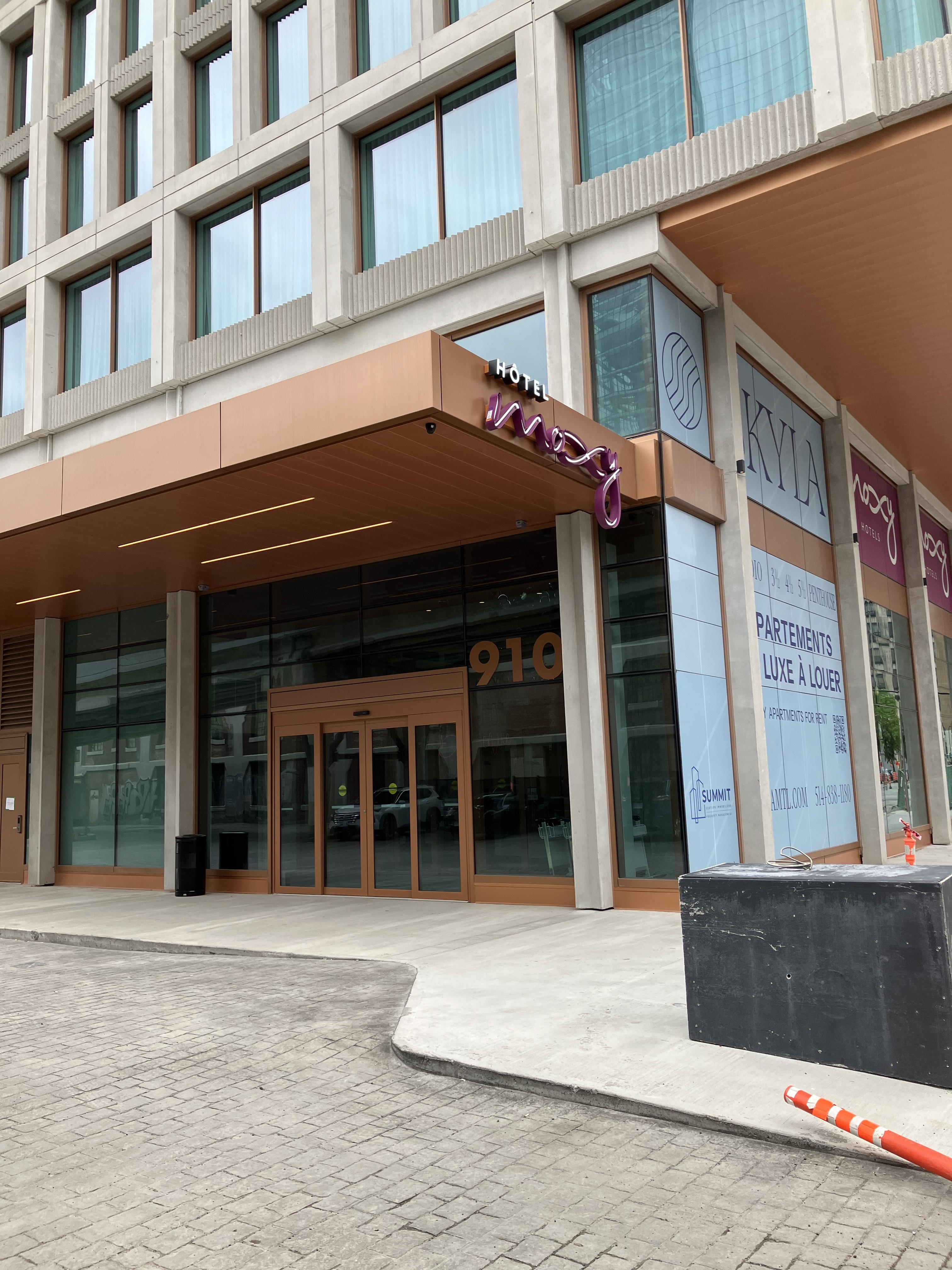 L’hôtel est bien ouvert. Le hall est vaste et chic avec des accents art déco typiques actuels. Le comptoir check-in à l’entrée est originalement divisé en 3 petits stands individuels. Au centre, l’accès aux ascenceurs de l’hôtel est caché derrière des portes coulissantes vitrées. Au fond se trouve un bar-restaurant de facture chic qui aura probablement une terrasse sur le terrain côté ouest, car il y a une porte vers l’extérieur. L’accès à la tour d’appartements se fera au fond du stationnement, avec une 2e porte d’entrée séparée de l’hôtel le long du trottoir. Le hall des apartements est actuellement en construction, avec quelques meubles intégrés aux murs déjà montés.