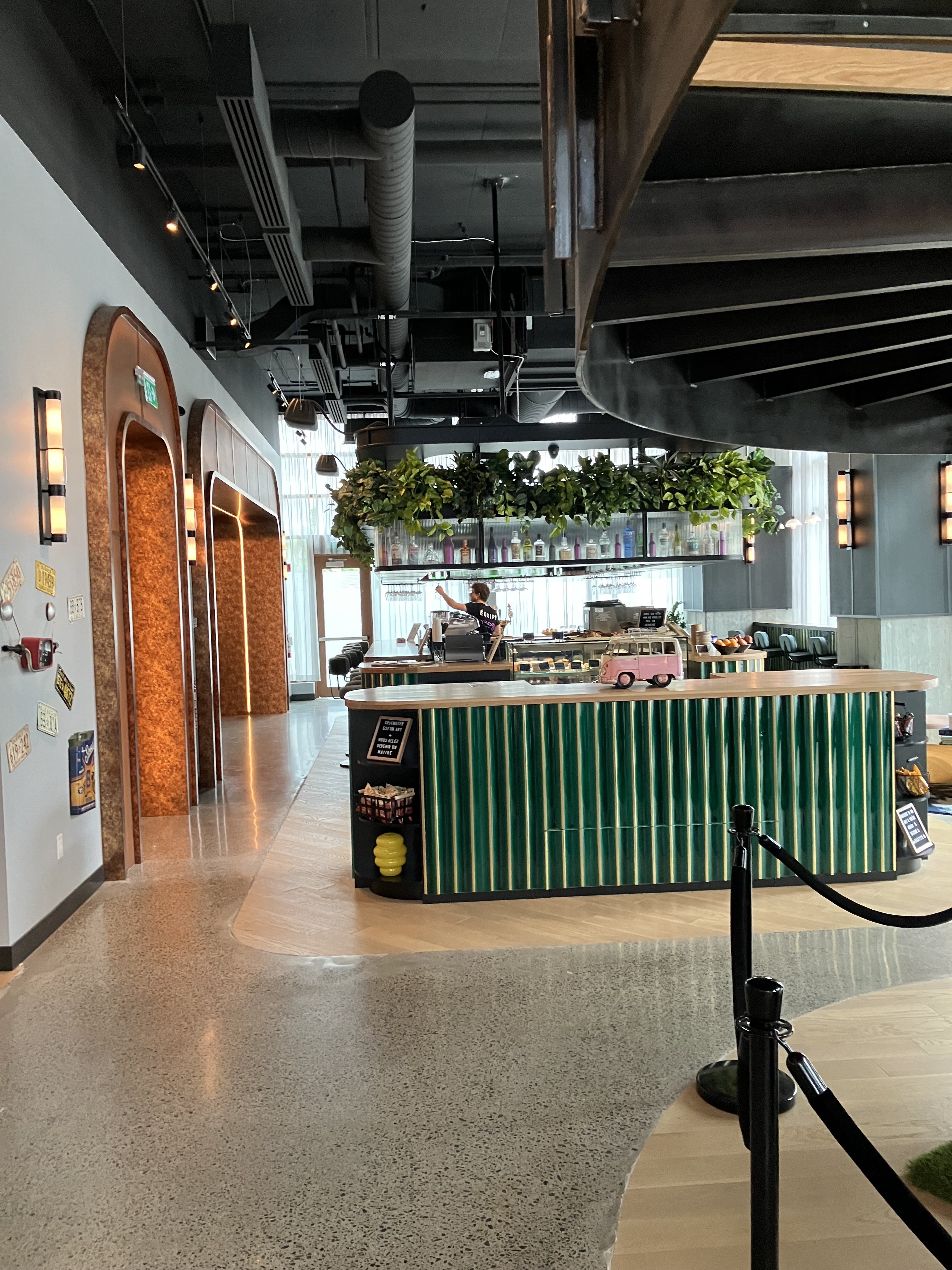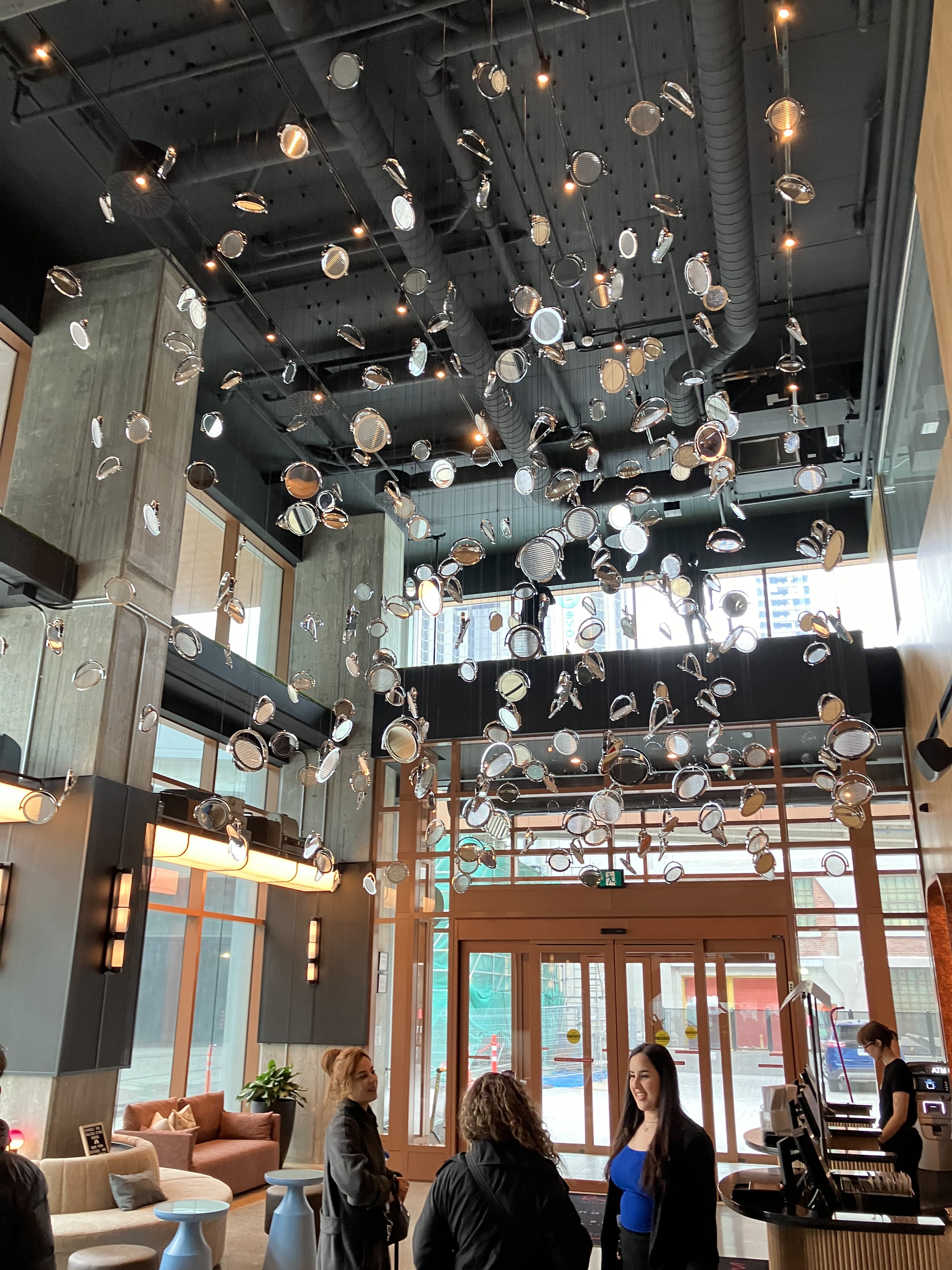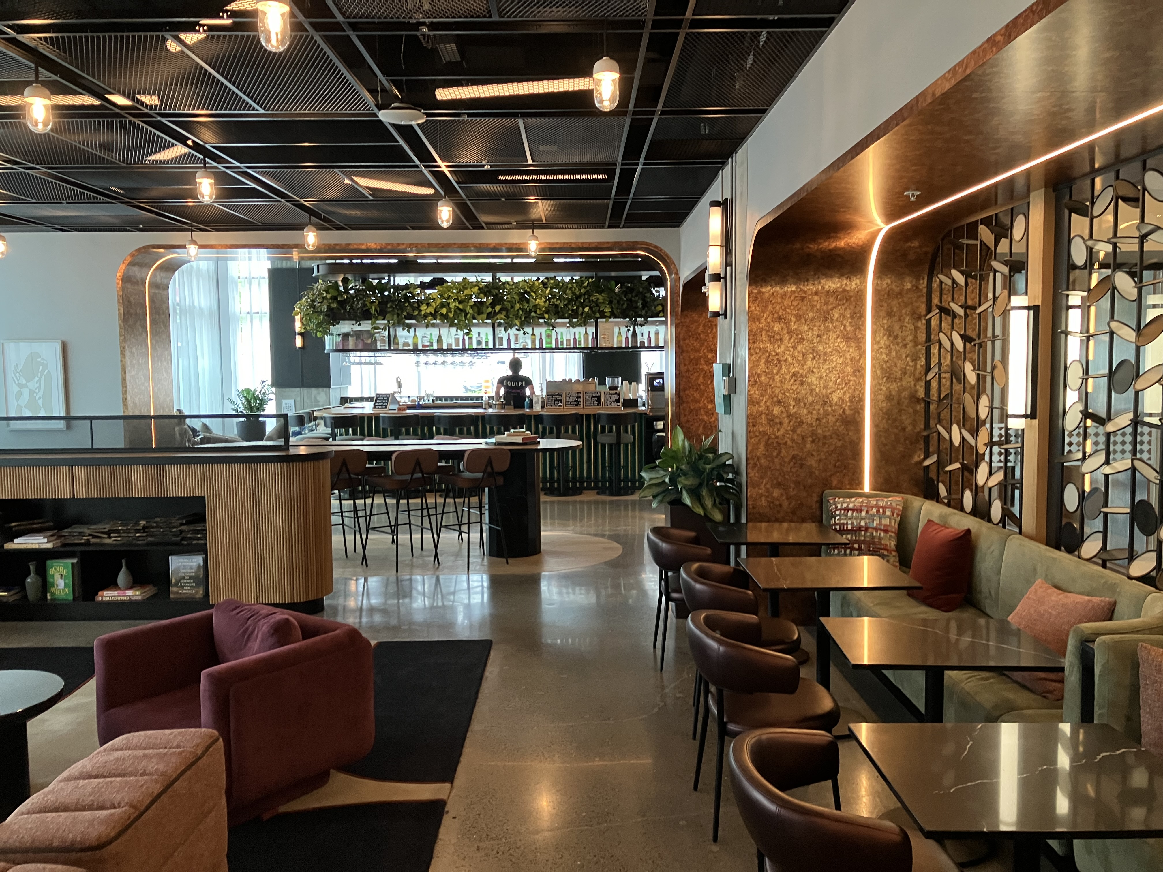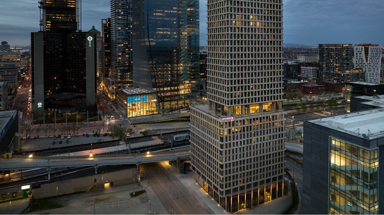 L’hôtel est bien ouvert. Le hall est vaste et chic avec des accents art déco typiques actuels. Le comptoir check-in à l’entrée est originalement divisé en 3 petits stands individuels. Au centre, l’accès aux ascenceurs de l’hôtel est caché derrière des portes coulissantes vitrées. Au fond se trouve un bar-restaurant de facture chic qui aura probablement une terrasse sur le terrain côté ouest, car il y a une porte vers l’extérieur. L’accès à la tour d’appartements se fera au fond du stationnement, avec une 2e porte d’entrée séparée de l’hôtel le long du trottoir. Le hall des apartements est actuellement en construction, avec quelques meubles intégrés aux murs déjà montés.