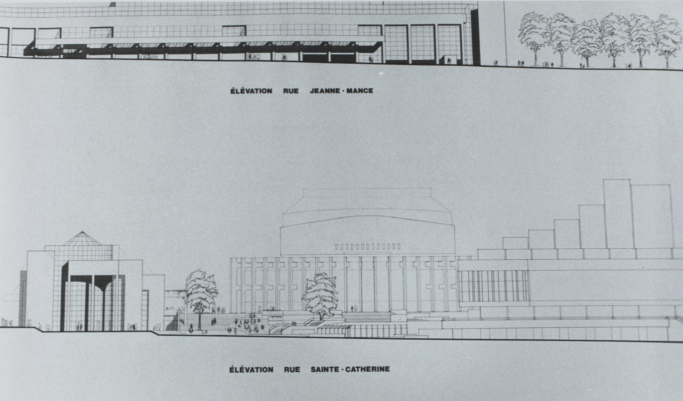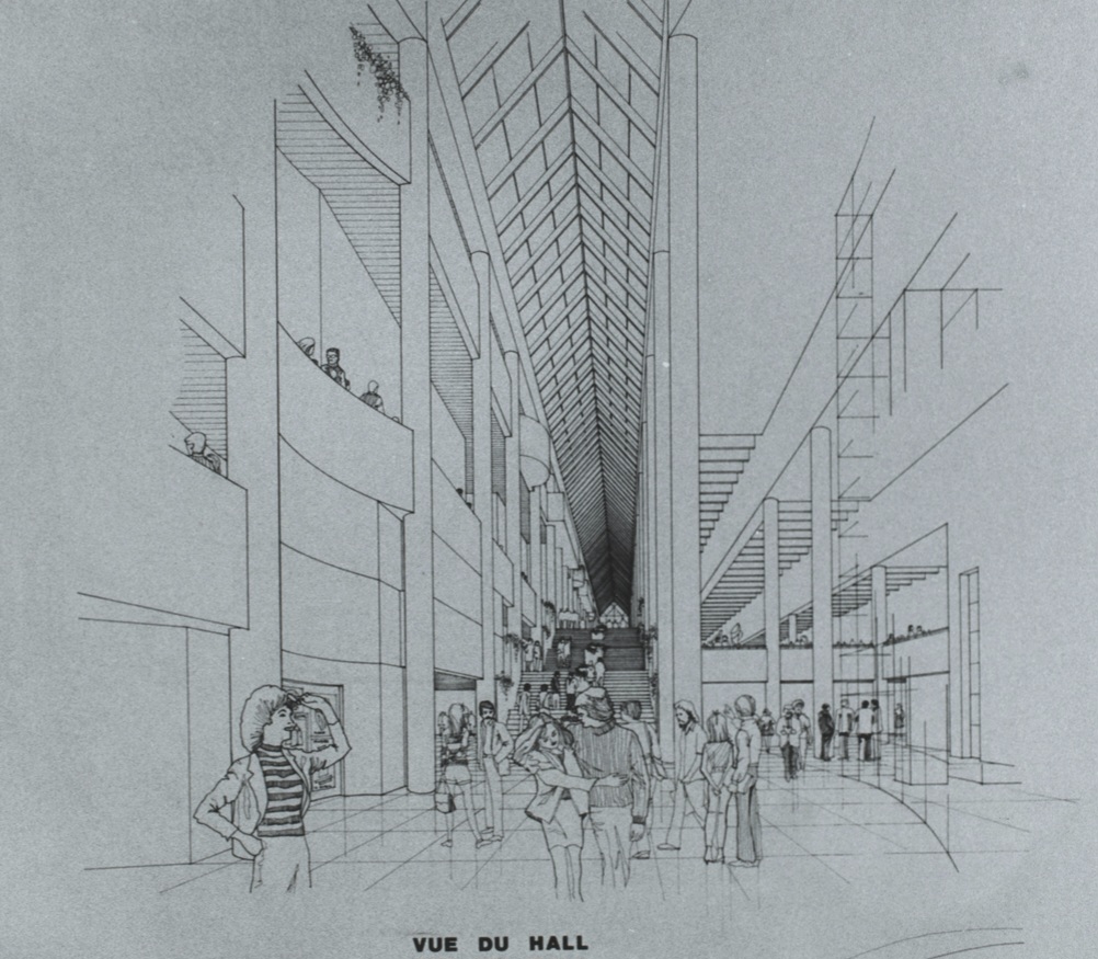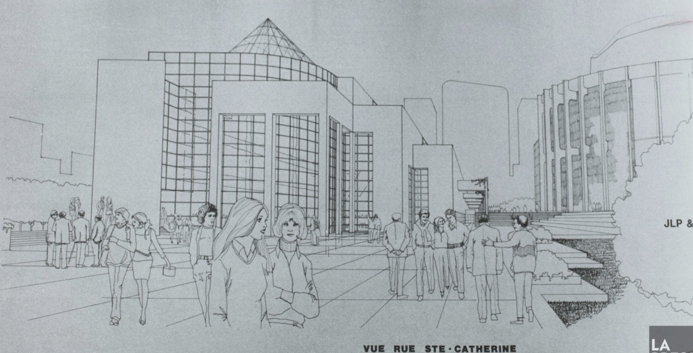 Première version du Musée d’Art Contemporain sur le site de la Place des Arts présenté le 24 avril 1984 par le gouvernement de René Lévesque. Les travaux ont débuté à l’été 1985.