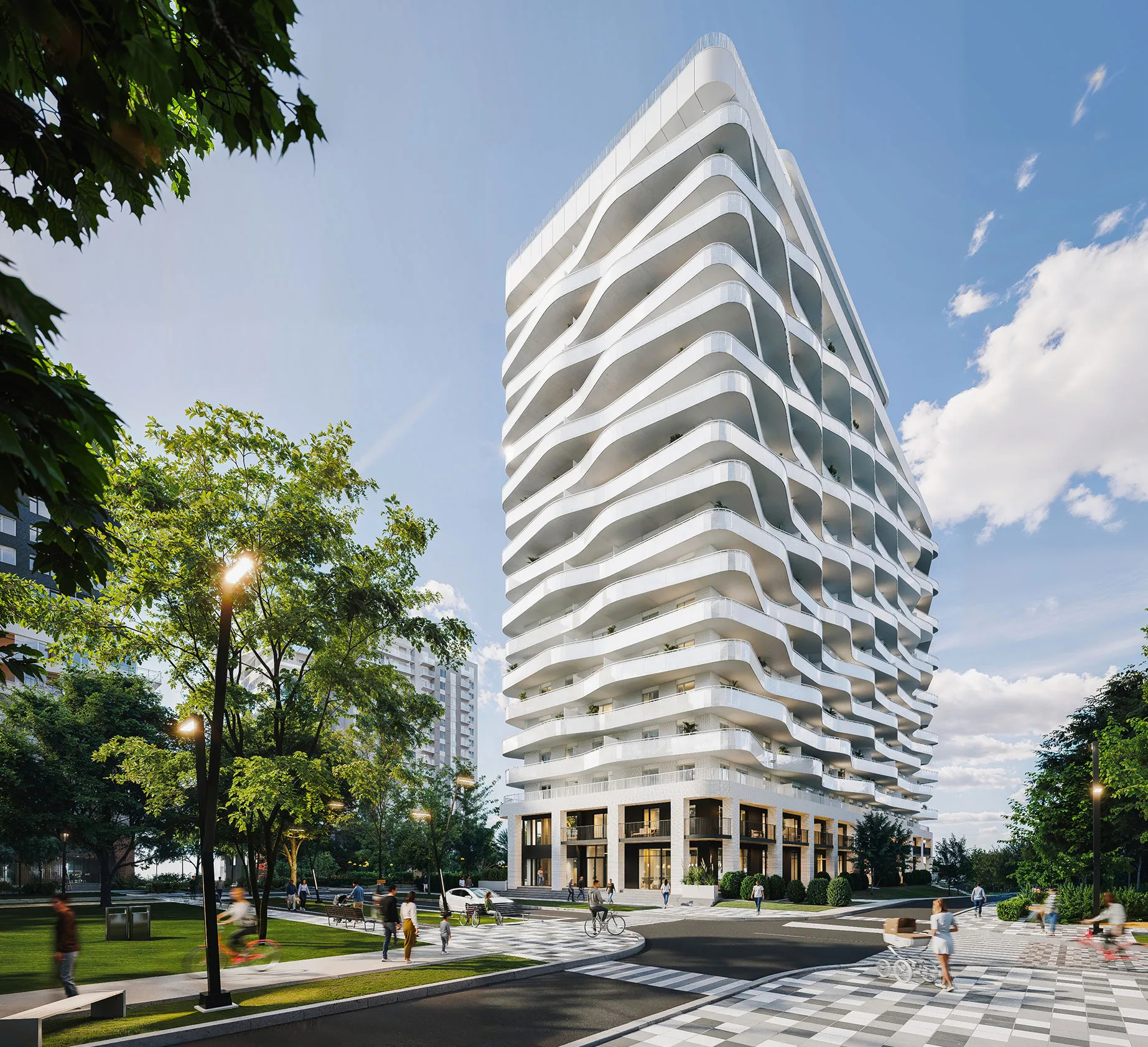 D’apparence moderne, le bâtiment blanc comporte une esthétique peu commune, avec des balcons ondulés sur les quatre façades de l’immeuble. Le projet comporte, au total, 313 unités réparties sur 19 étages – des studios, des condos d’une à trois chambres et des penthouses.