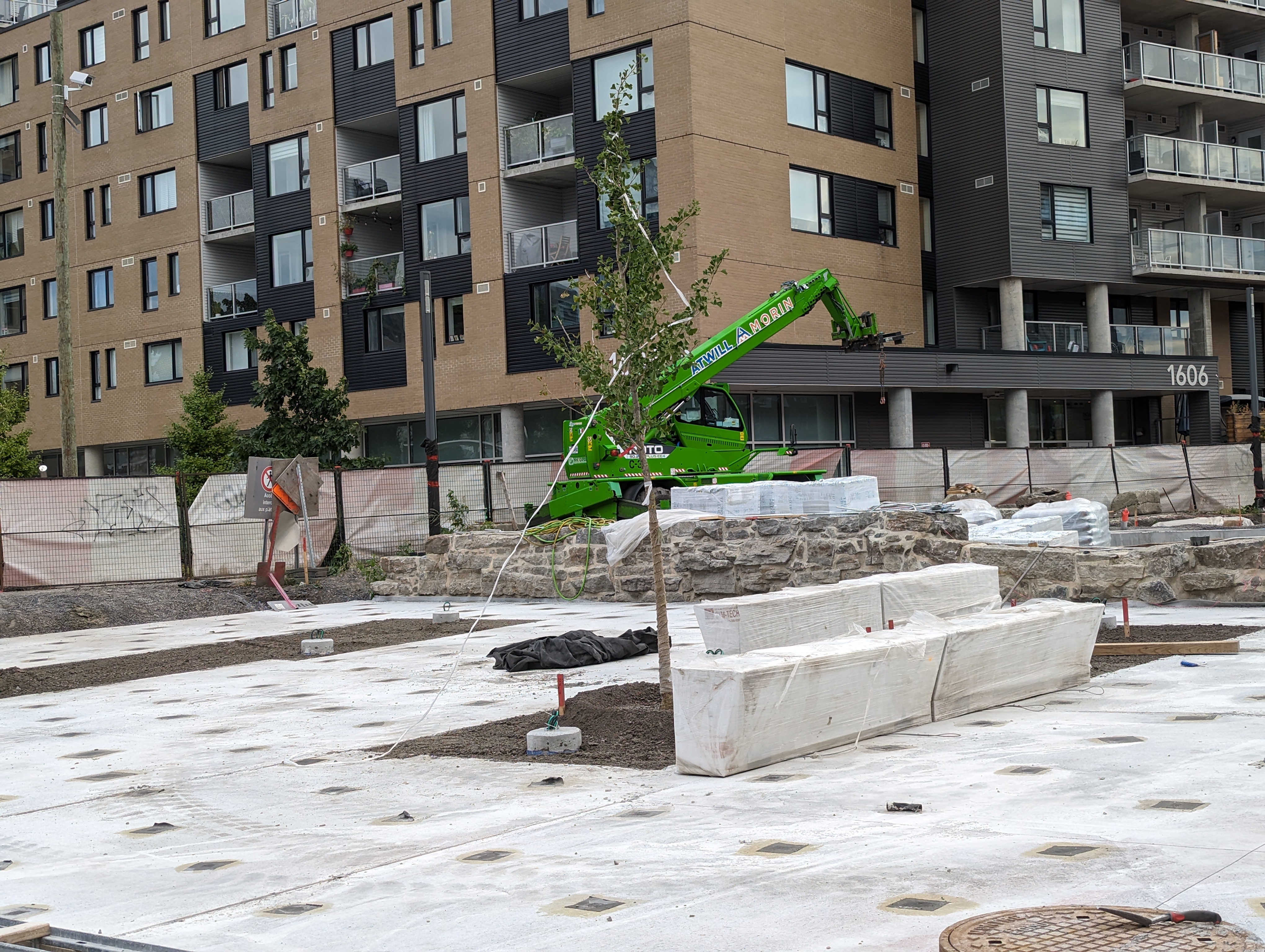 On installe les rigoles au sol pour les eaux de pluie. C’est vrai que les cheminées sont quand même massives. La couleur noire n’aide pas à en minimiser la présence. Une couleur plus claire aurait certainement mieux aidé. Le mur de pierre naturelle est très sympa et ajoute un côté ludique.