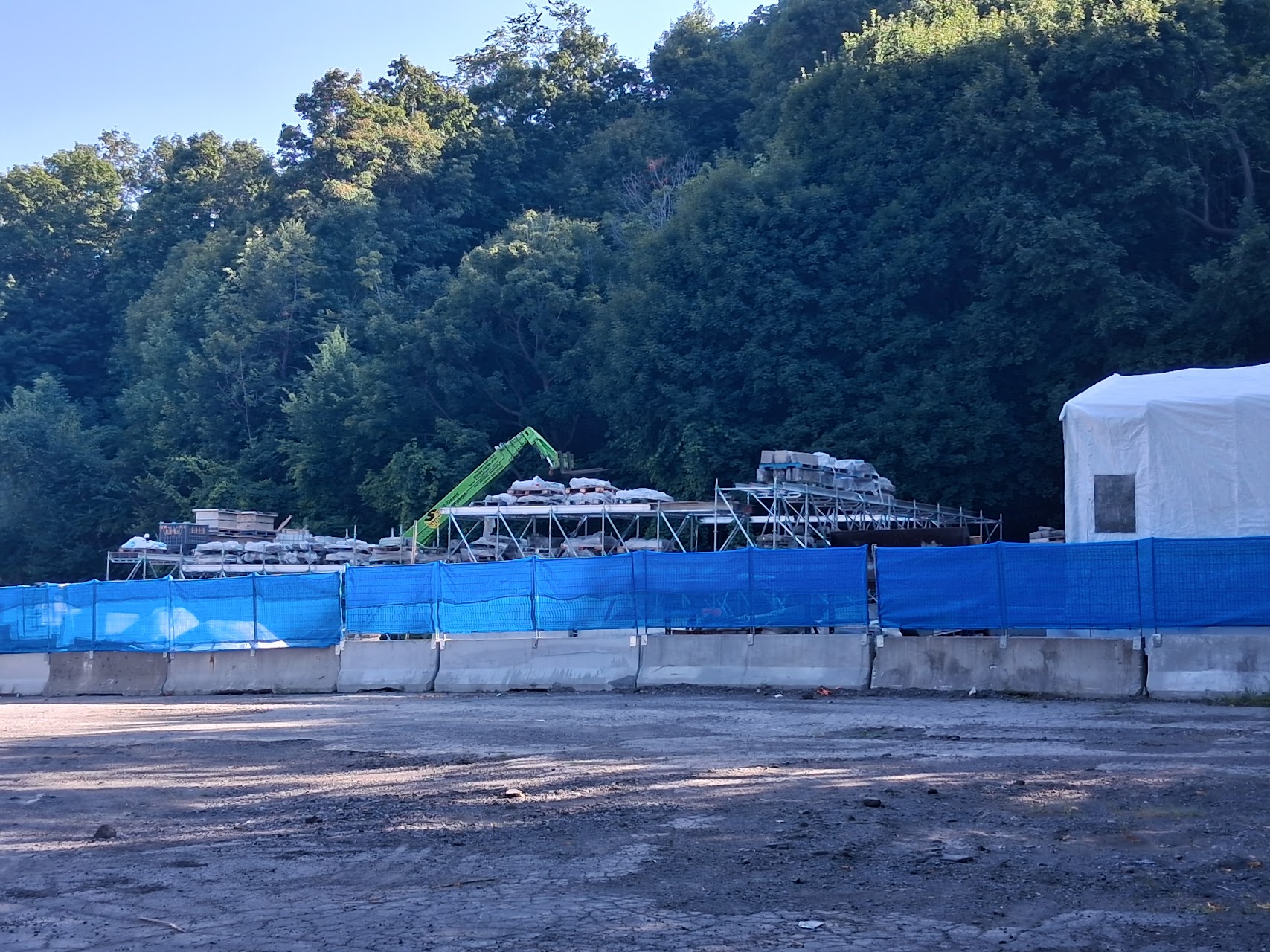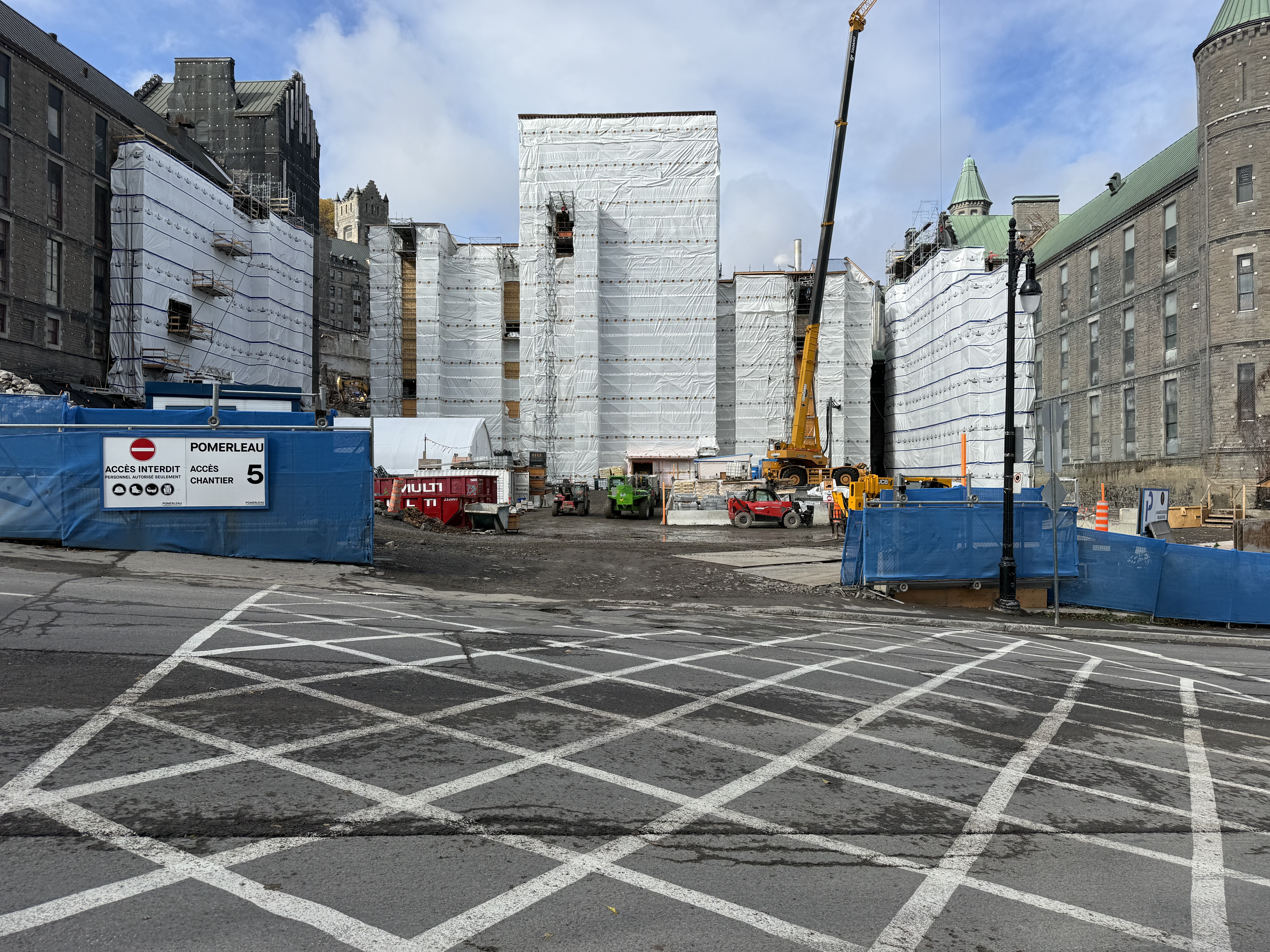 Progrès impressionnant en arrière de l’hôpital avec l’ancien pavillon disparu. Beaucoup d’activité sur l’intégralité du chantier (yay).