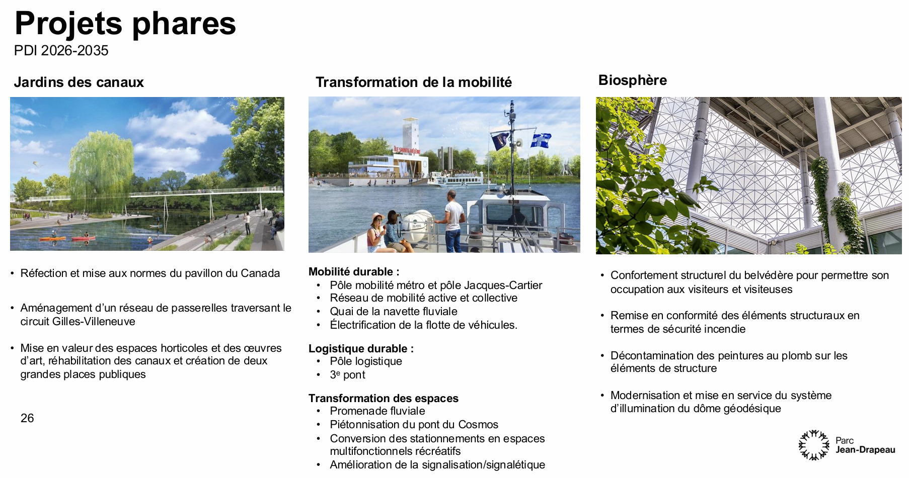 Projets phares Budget requis PDI 2025 (Ville de Montréal) PDI 2026-2035 (Ville de Montréal) Financement requis (SPJD) Mobilité 400 000 $ 84 $ 111 141 $ 288 775 $ Jardins des canaux 150 000 $ 1 850 $ 94 647 $ 53 503 $ Hélène-de-Champlain 25 000 $ - 7 100 $ 17 900 $ Place des Nations 85 000 $ 3 526 $ 73 010 $ 8 464 $ Mont Boullé 26 472 $ 9 785 $ 12 266 $ 3 820 $ Sous-total - Projets phares 686 472 $ 15 245 $ 298 765 $ 372 462 $