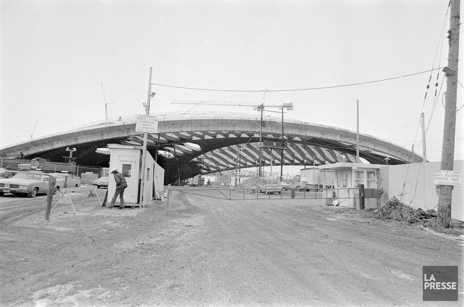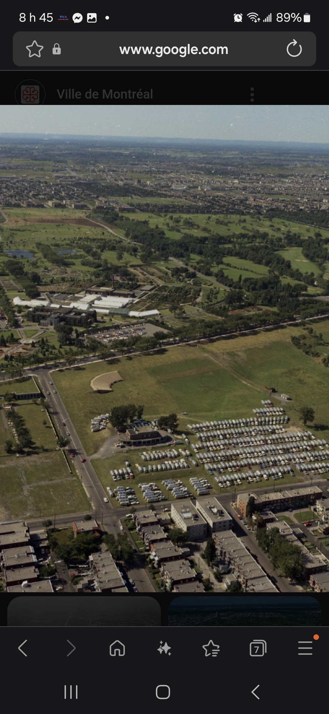 Dans cette image, il n’y a pas de terrain de sport à la base… Il y a un bâtiment en brique qui, j’ai entendu dire, était une école de danse ! Et une quantité ASTRONOMIQUE de voiture tirant des roulotte d’un autre temps, donc je suposse un camping à roulotte en plein Montréal !