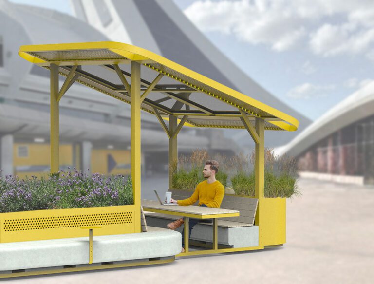 Situé au pied de la tour du stade, entre le Biodôme et le Centre sportif, le lieu se trouvera en retrait de la rue, offrant une nouvelle option pour le travail ou la détente en plein air. L’objectif était de le rendre accessible autant aux locaux qu’aux touristes et aux travailleurs des environs. Il comptera environ 80 places réparties dans du mobilier urbain en béton, en acier et en bois. Des panneaux solaires fourniront l’électricité nécessaire pour les prises électriques intégrées au mobilier, permettant ainsi aux utilisateurs de brancher leurs appareils électroniques.