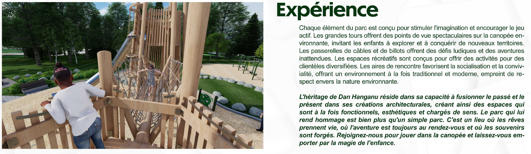 - La modernisation des espaces de détentes, des espaces de jeu et du chalet de parc.