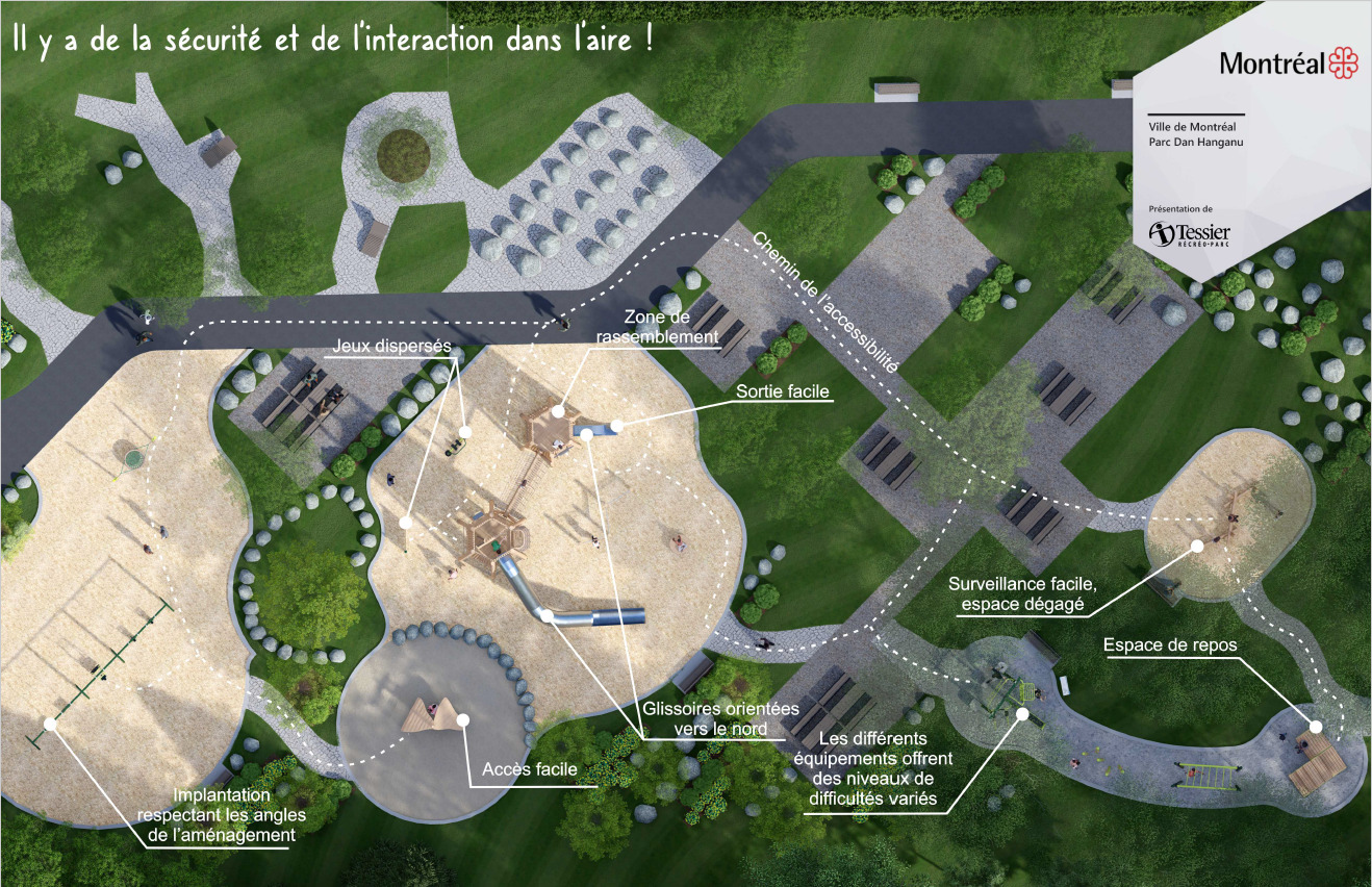 Concrètement, le premier contrat pour les travaux permettra de réaliser la démolition et l’enlèvement des modules de jeu actuels, le terrassement, la plantation d’arbres, d’arbustes et graminées, mais aussi la construction d’ouvrages de béton, la fourniture et la mise en place d’infrastructure de drainage ainsi que d’un jardin de pluie et l’aménagement d’espaces commémoratifs à la mémoire de Dan Hanganu.