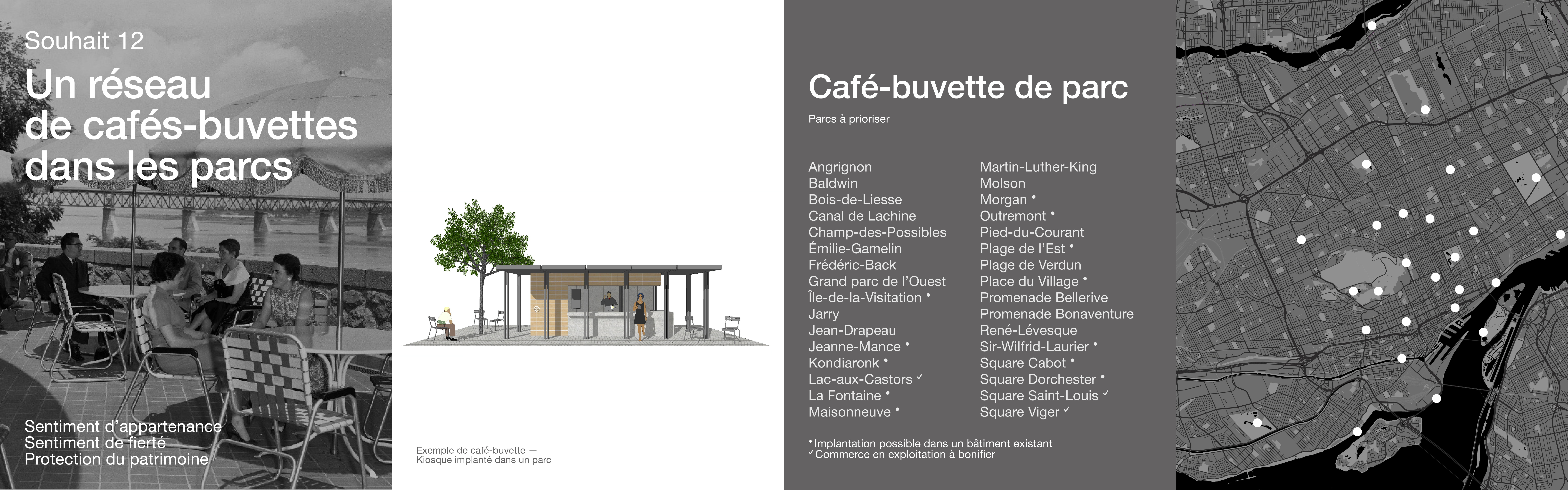 Les parcs montréalais sont des lieux de rencontre, de rassemblement et de détente. L’implantation de cafés-buvettes permettrait de renforcer ces vocations et de favoriser un plus grand sentiment d’appartenance aux espaces publics. Dans certains cas, ce serait aussi l’occasion de redonner vie à des bâtiments patrimoniaux sous-utilisés ou laissés à l’abandon. Dans d’autres, il s’agirait de construire de petits pavillons conçus pour structurer et animer l’espace public.