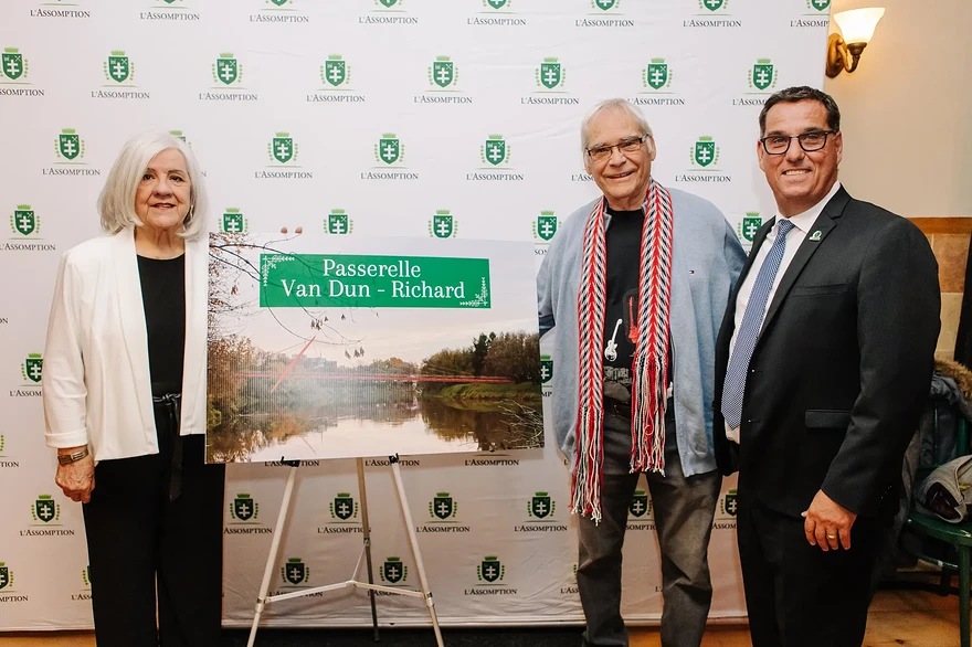 Le conseil municipal a procédé au dévoilement de son choix à l’occasion d’une soirée tenue au Vieux Palais le 23 novembre. « C’est avec plaisir et énormément de respect que nous allons graver à tout jamais le nom de ces deux grands Assomptionnistes dans l’histoire de L’Assomption. Nommer une passerelle à leurs noms est pour nous très symbolique. Une passerelle, ça permet de connecter deux rives, ça facilite le rapprochement des citoyens. Tant monsieur Richard que monsieur Van Dun ont permis à notre communauté d’être encore plus tissée serrée, et de rayonner sous ses plus beaux jours. Messieurs Richard et Van Dun sont des leaders de notre communauté qui ont donné envie à d’autres de suivre leurs traces. » a mentionné le maire, Sébastien Nadeau.