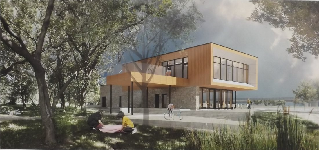 - Le projet sert principalement de halte, offrant des espaces de repos, café, salle polyvalente, bureau d’organisme communautaire, des toilettes et des services de location/réparation d’équipements sportifs, dépôts pour matériel et entretien, ainsi que des espaces extérieurs, terrasse abritée avec vues sur le parc et la rivière, amphithéâtre – gradins extérieurs végétalisés, toiture végétalisée accessible, ainsi qu’une grande terrasse surélevée permettant d’apprécier la canopée des arbres matures.