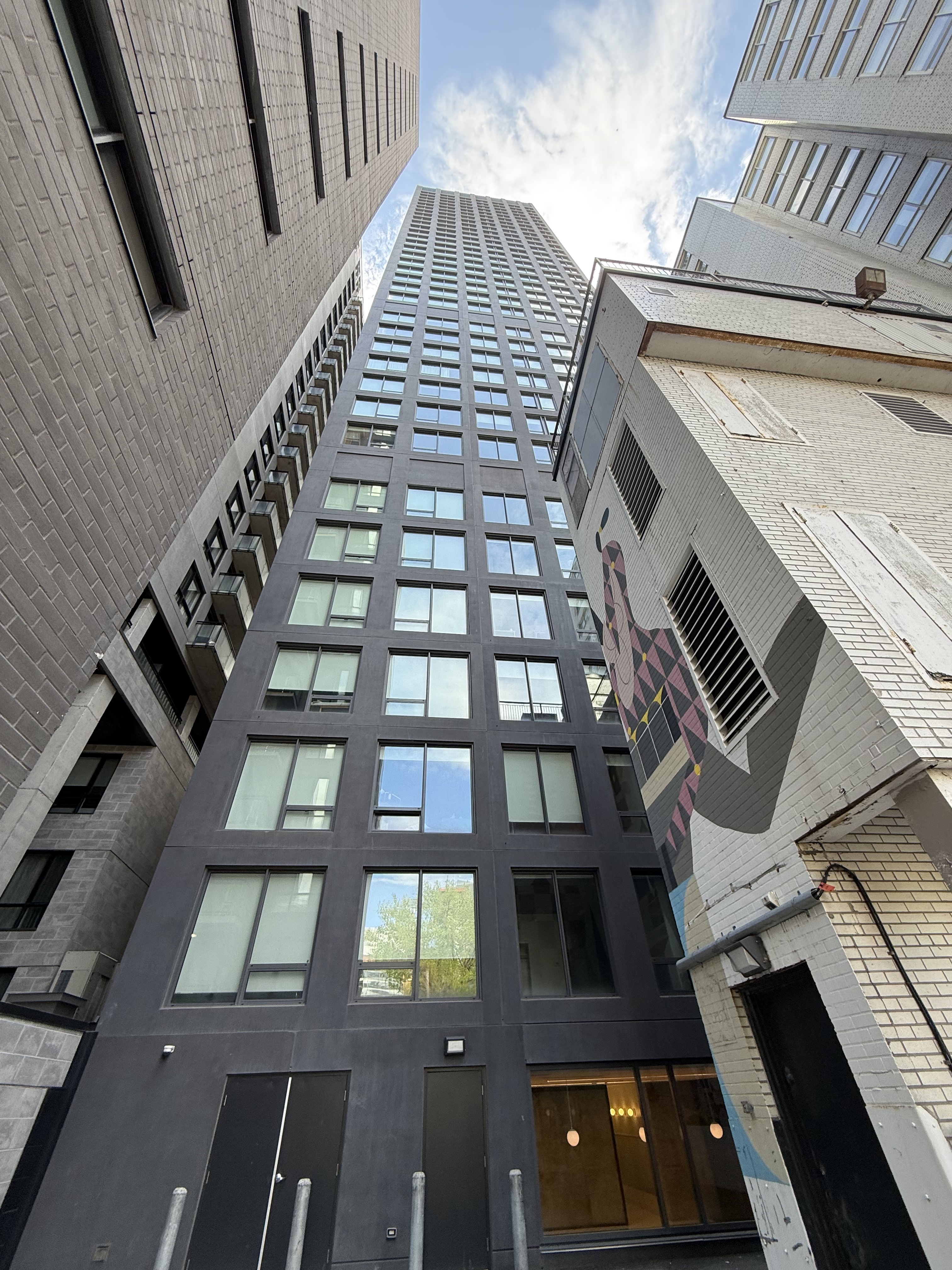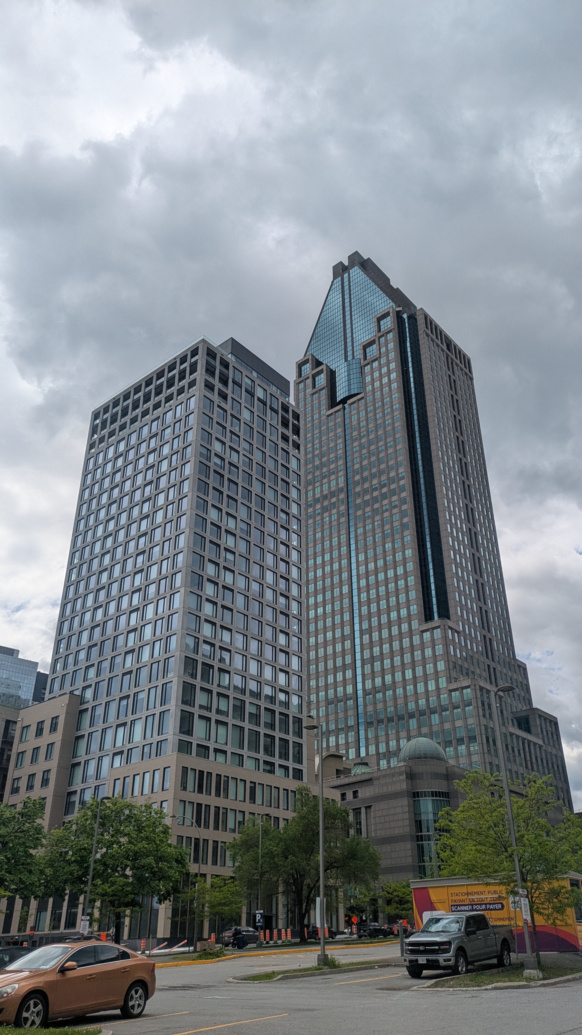 Deux tours des années 70 en béton sur le boulevard De Maisonneuve.