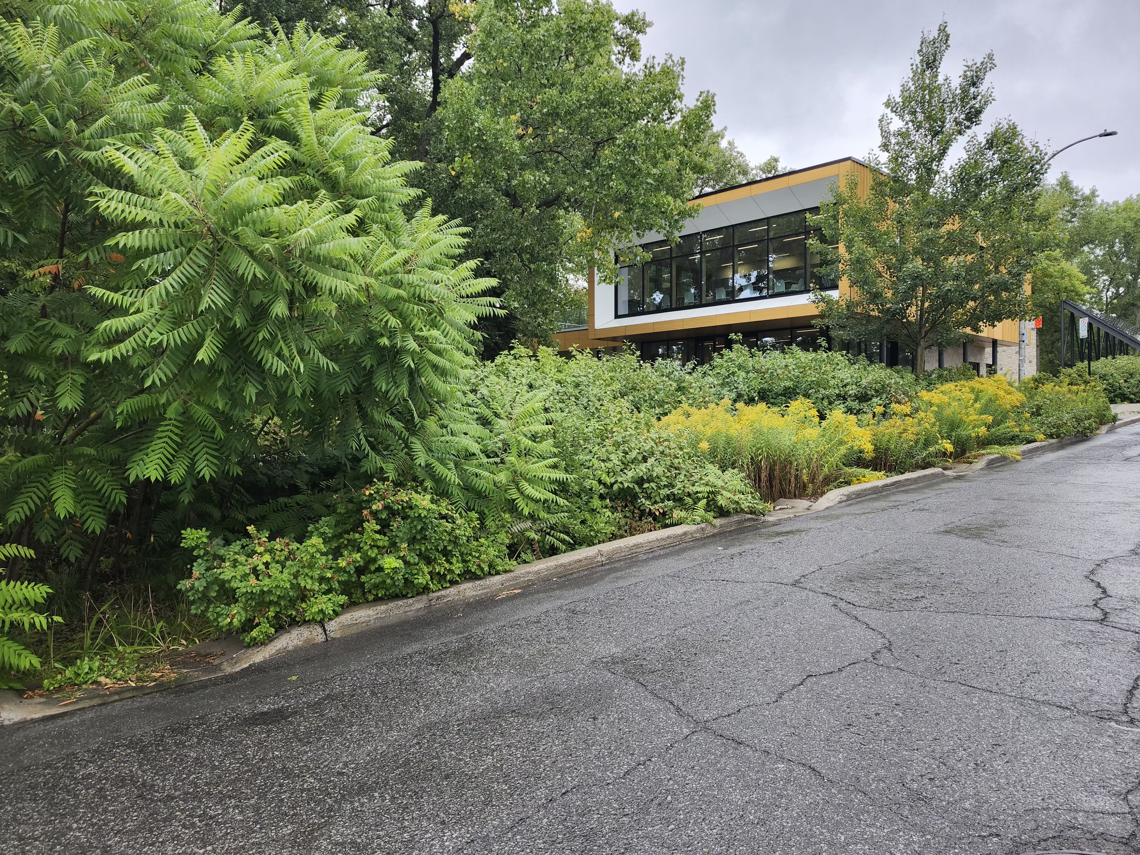 Ce n’est pas le même angle, exactement, mais ça représente l’évolution de ce la saillie drainante à côté du pavillon d’accueil du parcours Gouin, dans Ahuntsic, de 2017 à aujourd’hui: