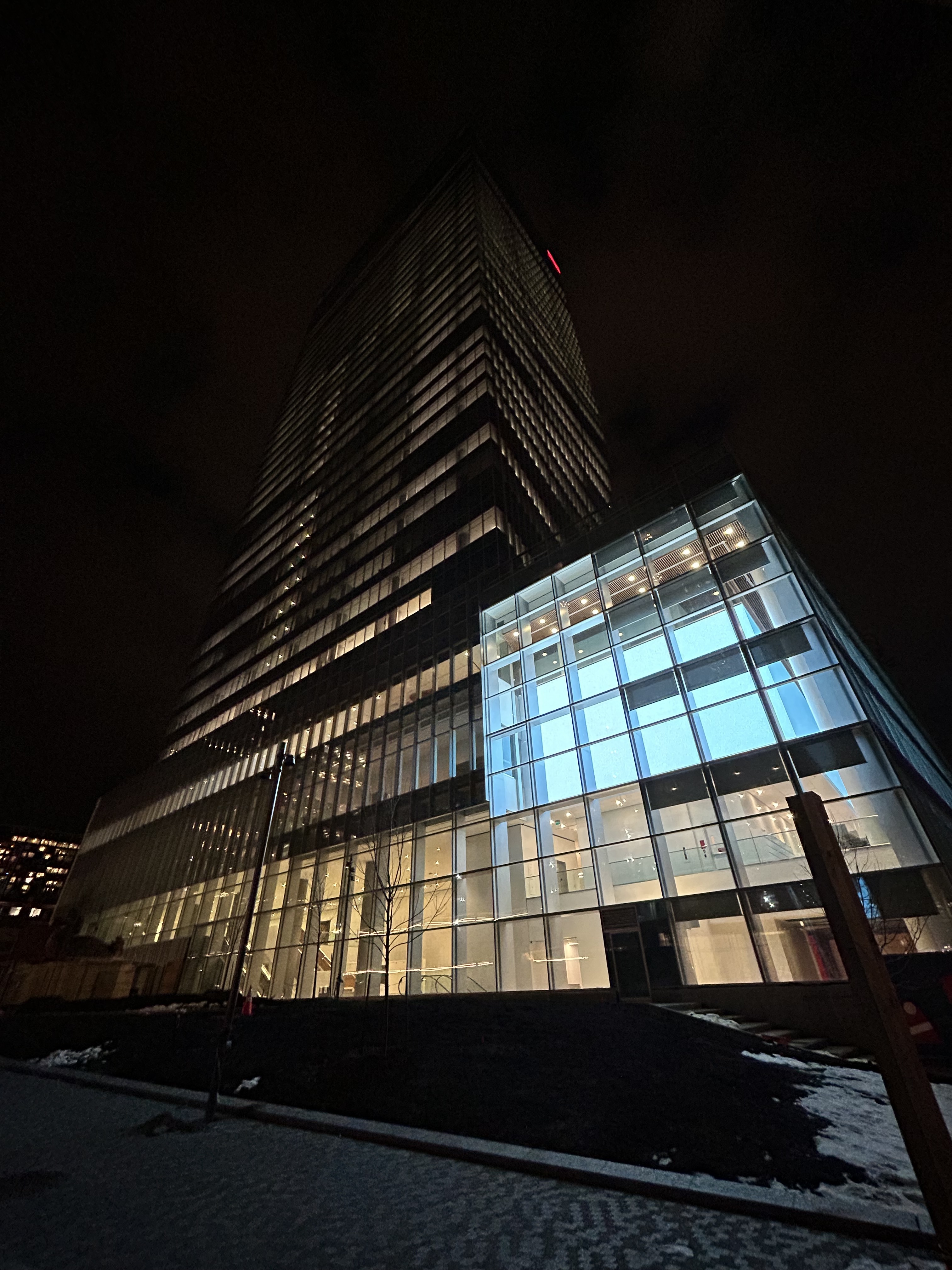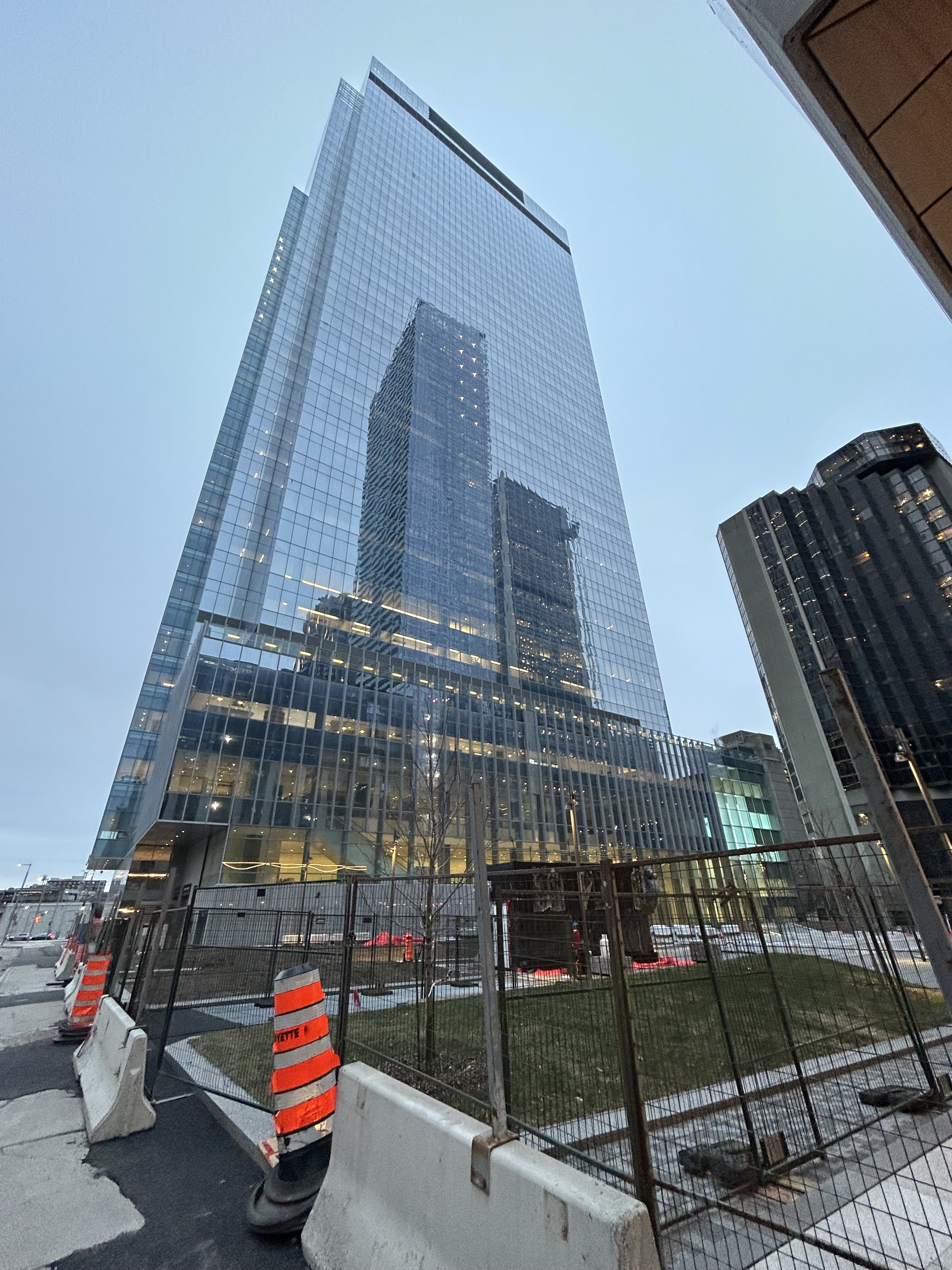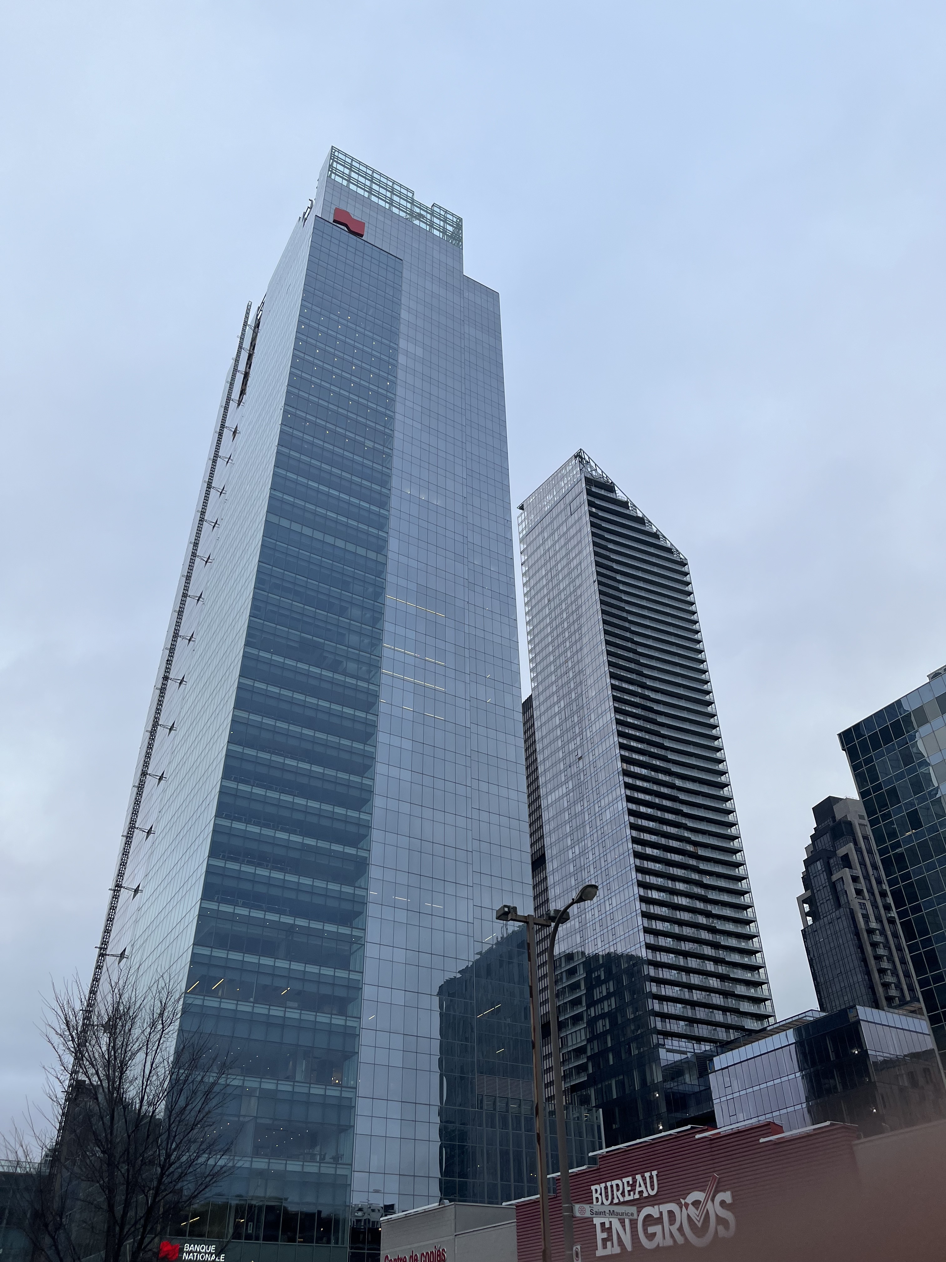 On voit sur cette photo de @Mondo_Grosso la partie arrière du Bureau en Gros qui pour le moment ne nuit pas à la luminosité du petit parc entre les deux tours. Toutefois la Ville devrait tout de suite penser à protéger le court ensoleillement et surtout la luminosité de ce petit espace public. En effet il serait directement menacé d’ombrage permanent si on ne décalait pas un peu plus vers l’ouest le volume d’un futur immeuble qui remplacerait éventuellement le BeG comme on peut le voir sur Google Maps