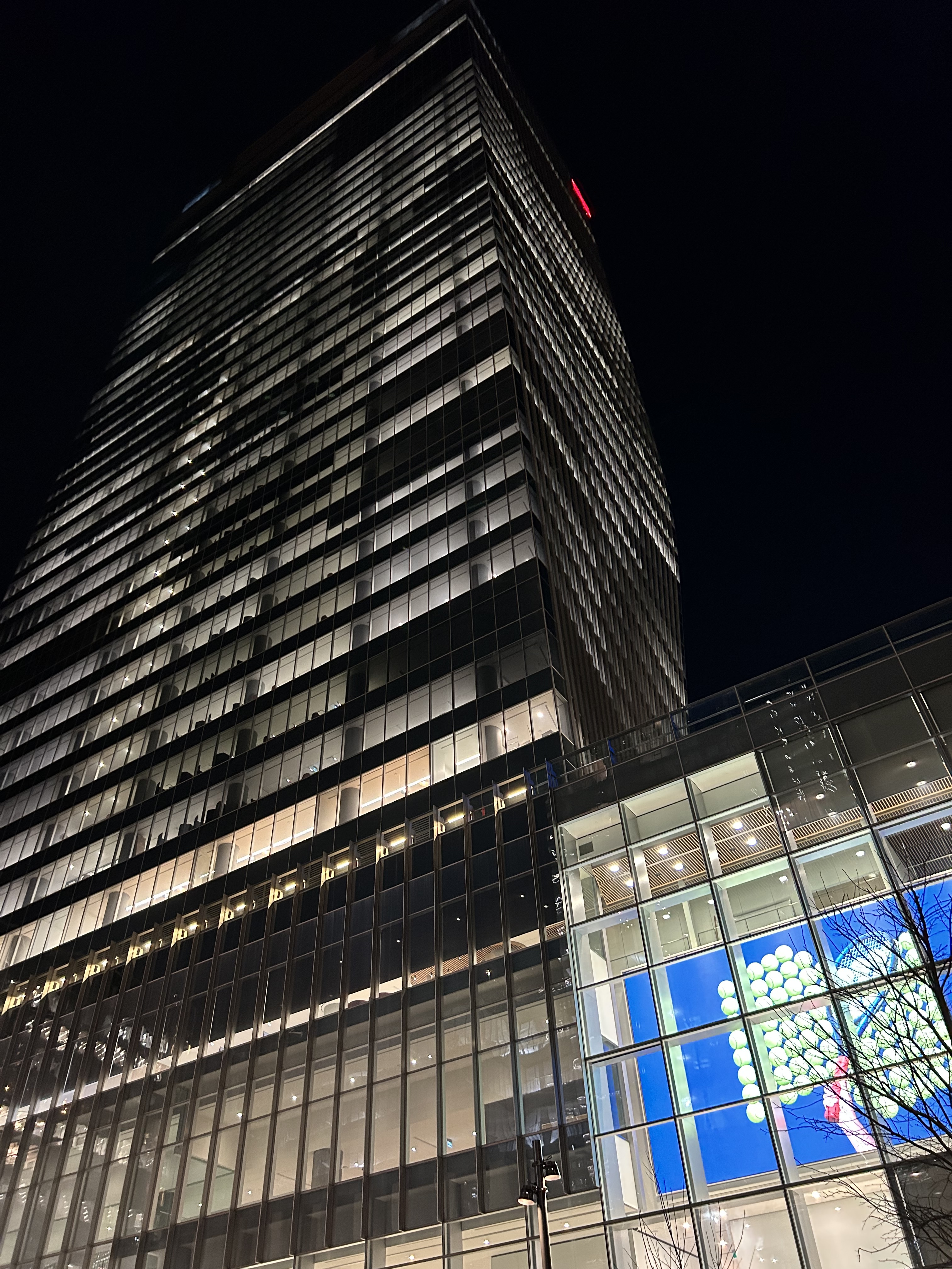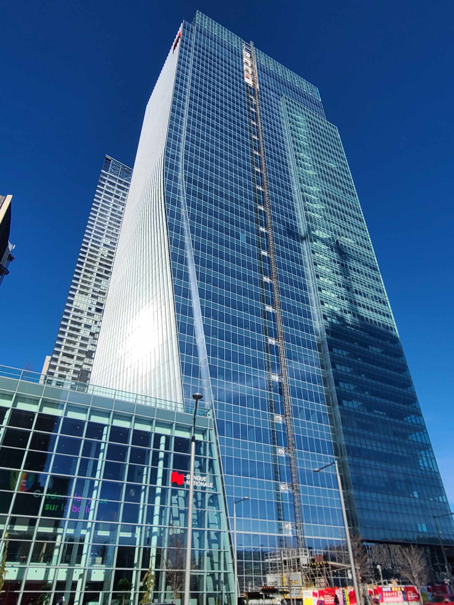 Je regardais la forme de sa base et ce qui aurait fait vraiment original aurait été d’avoir des coins arrondies sur St-Jacques. En particulier, si on circule vers le Sud sur Robert-Bourassa, cela aurait permis de mieux mettre en valeur l’écran intérieur!