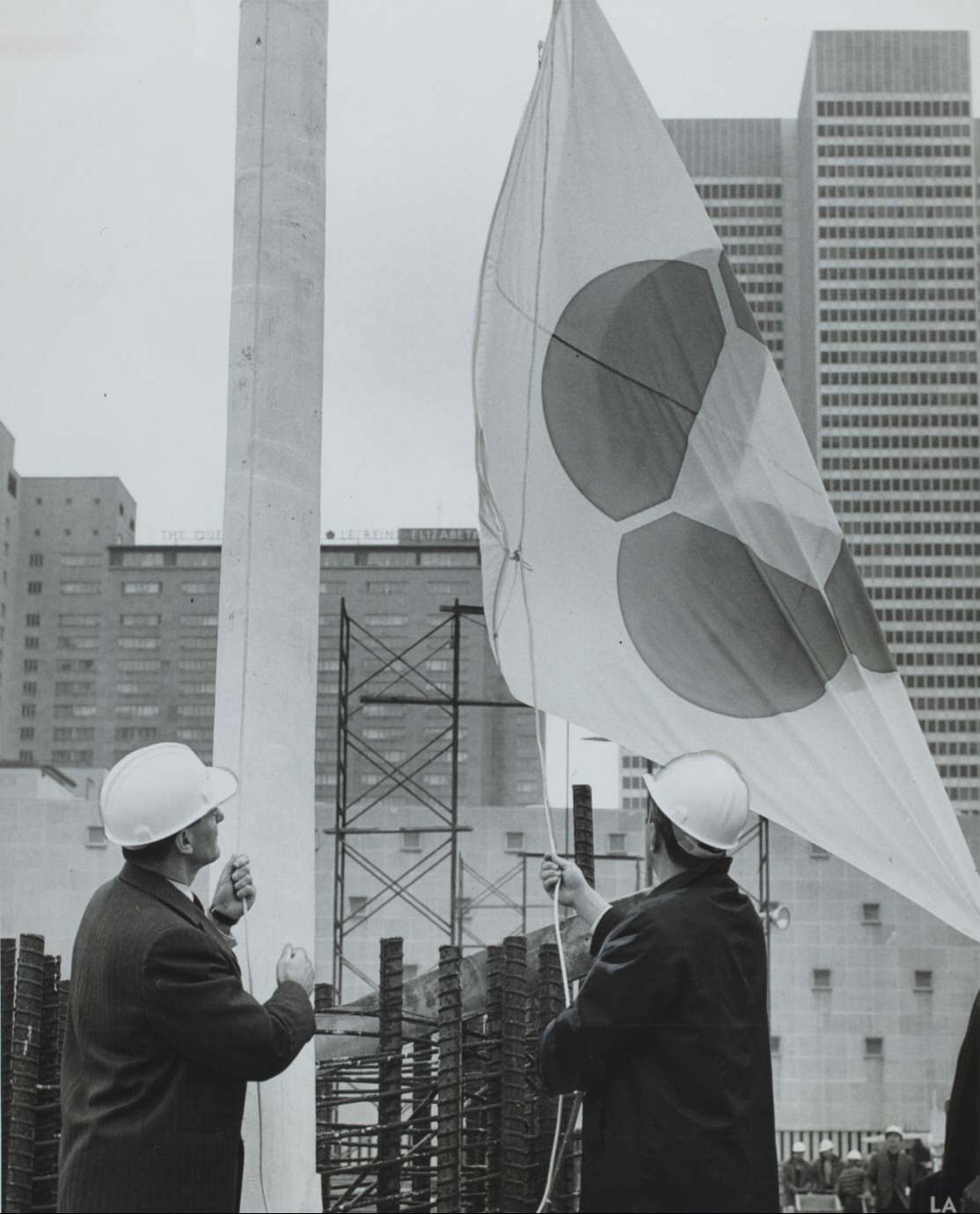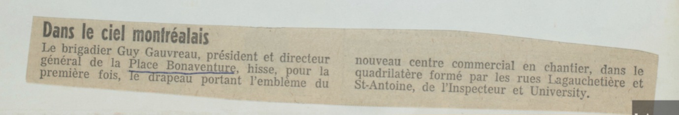 Premier lever officiel du drapeau portant le logo de la Place Bonaventure le 3 mai 1965, alors que la construction de l’immeuble battait son plein. Ce logo semble aujourd’hui disparu.