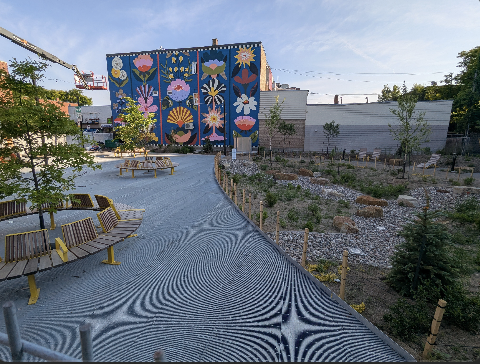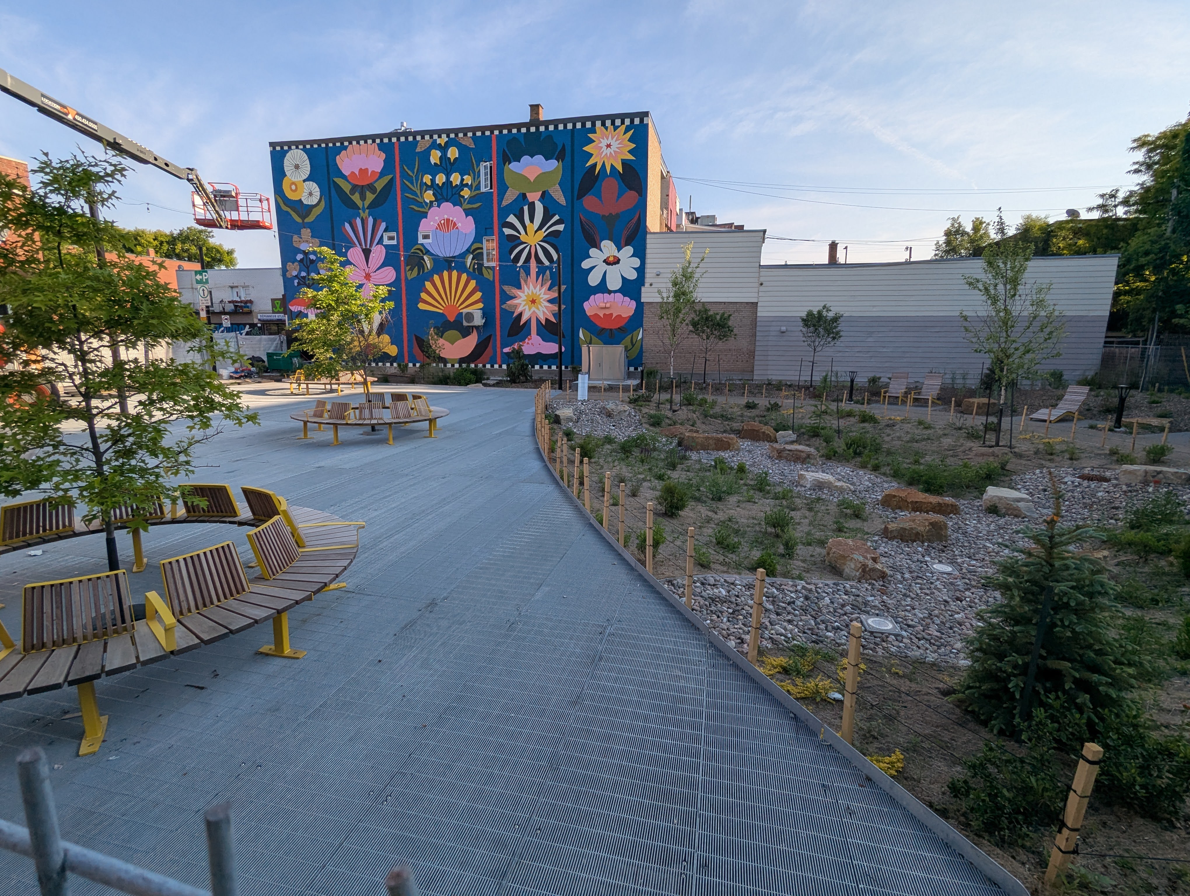 C’est magnifique! Le mobilier est superbe, l’accessibilité universelle est au cœur de l’aménagement. La magnifique murale de l’artiste rosemontoise Marie-Claude Marquis progresse à grand pas!