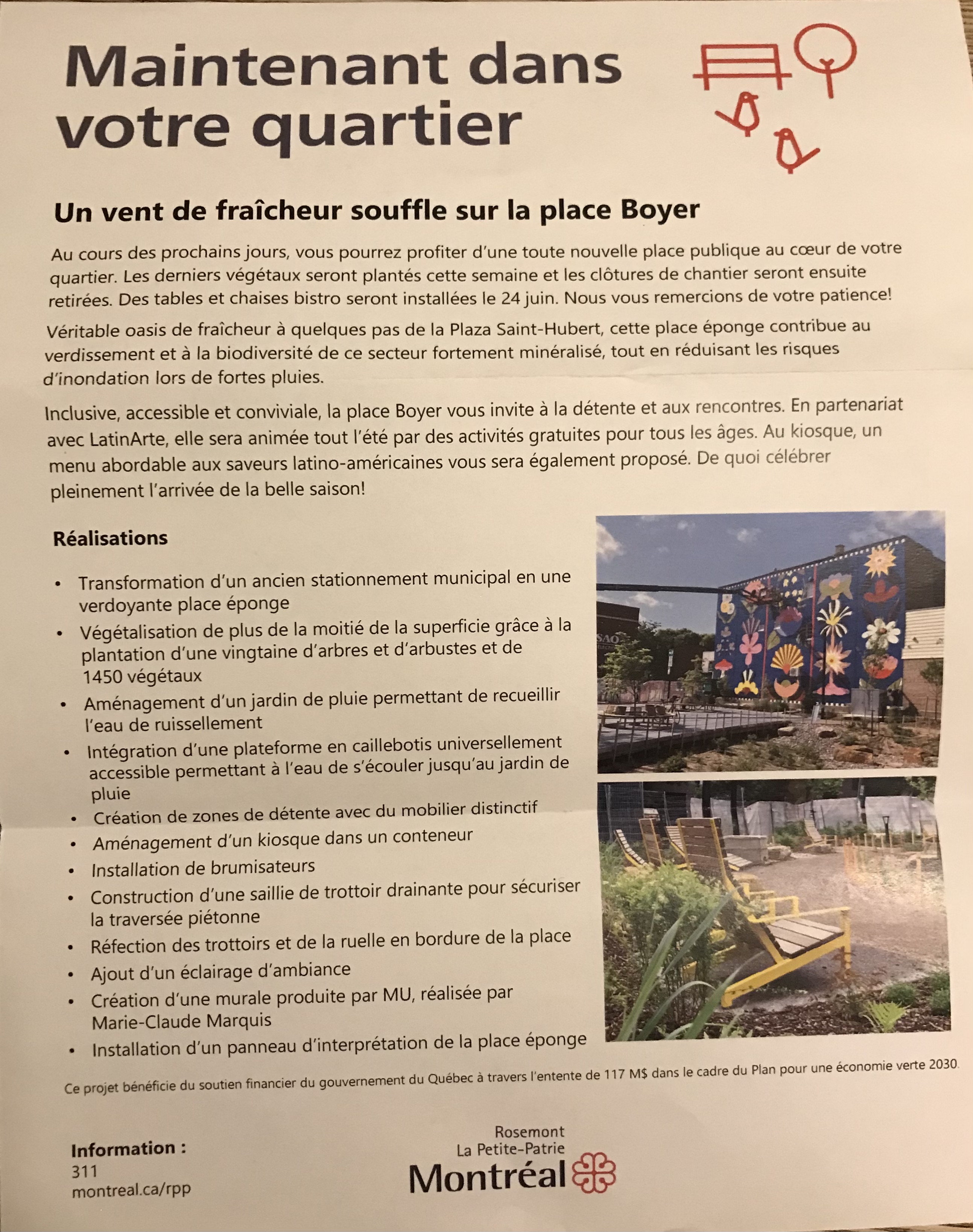 Au cours des prochaines semaines, les touches finales seront apportées à la place Boyer. Réalisation d’une murale, dernières plantations, installation du mobilier amovible et préparation d’une programmation culturelle gratuite sont notamment au programme. Une petite oasis à découvrir à la fin juin!