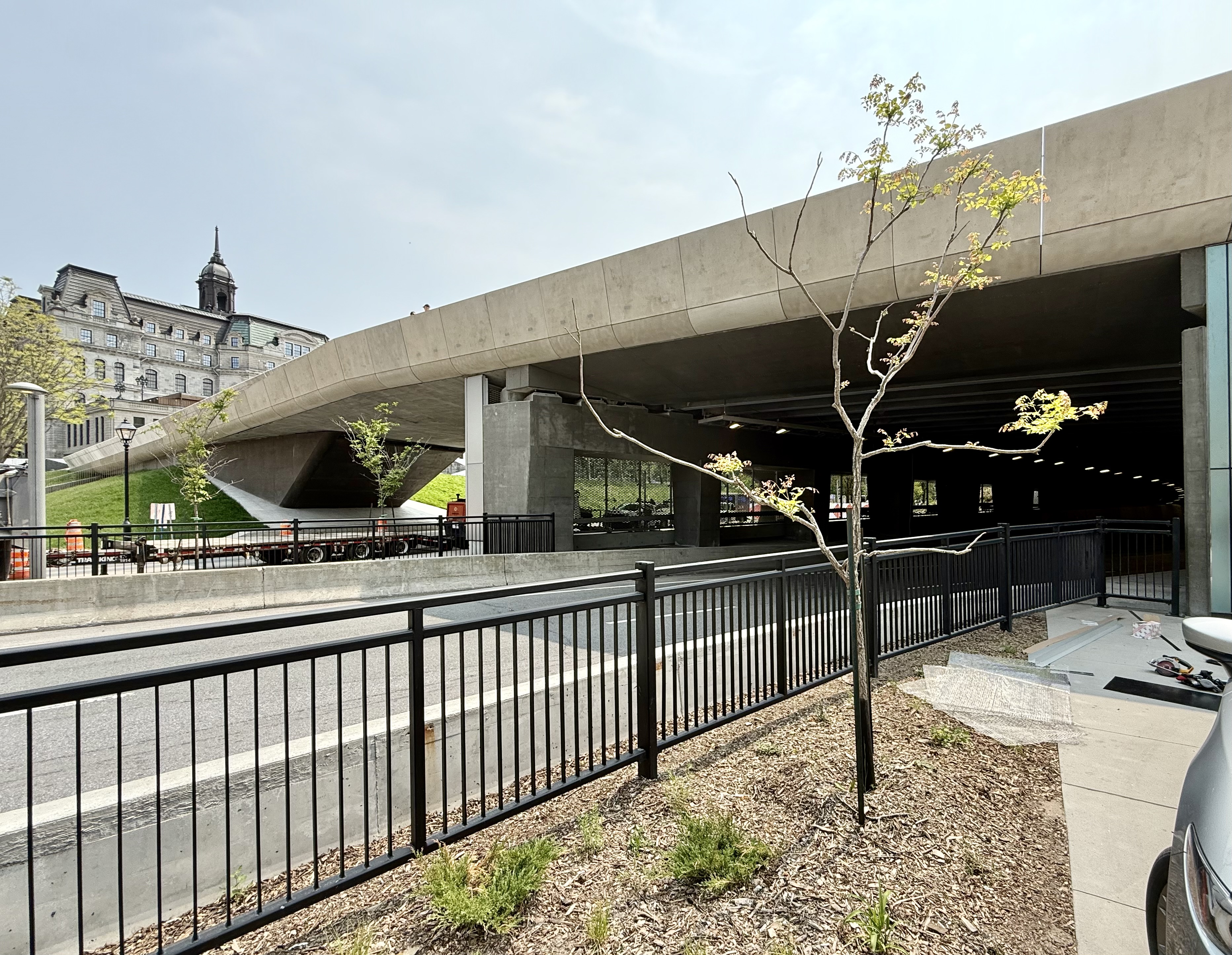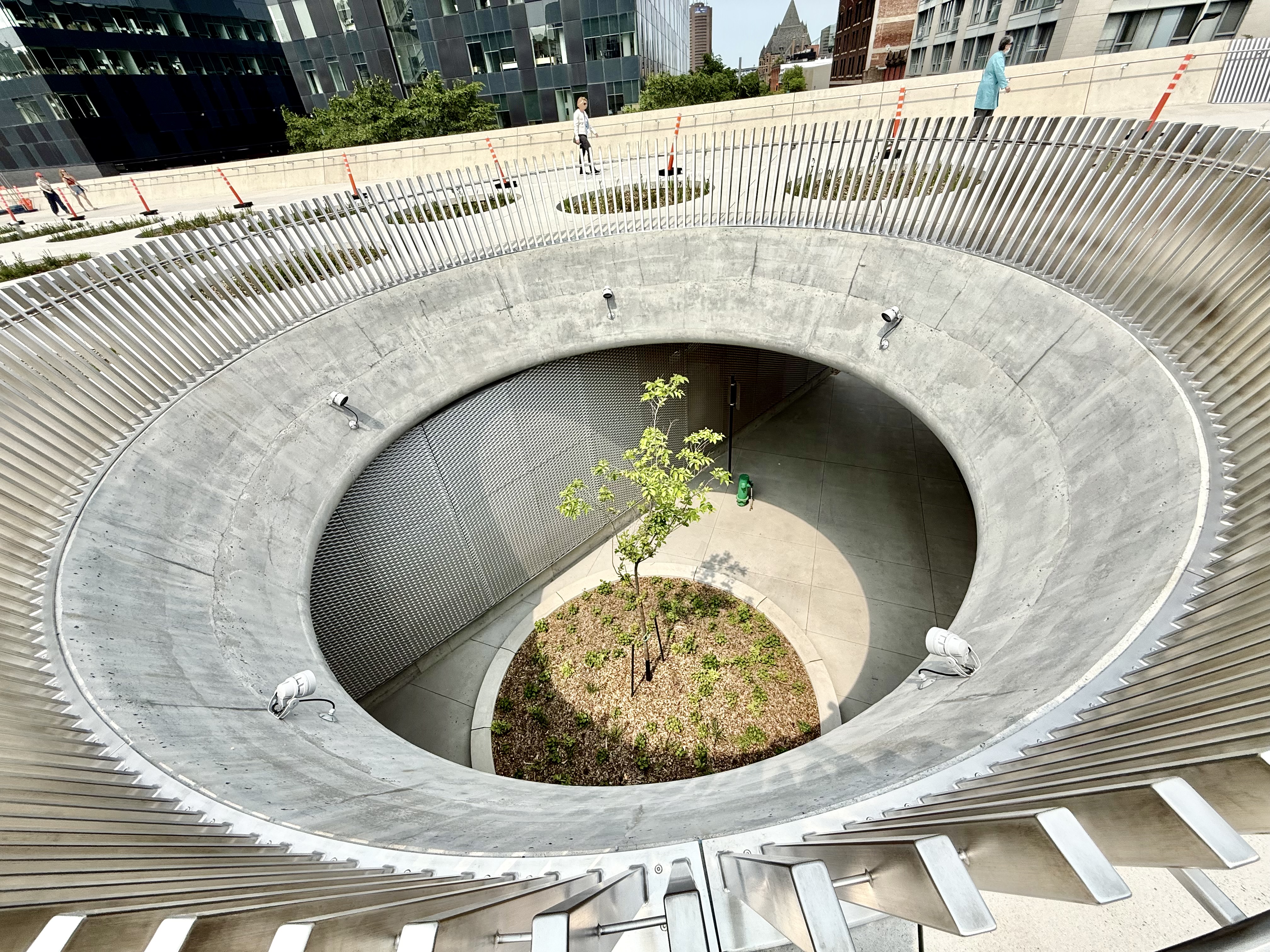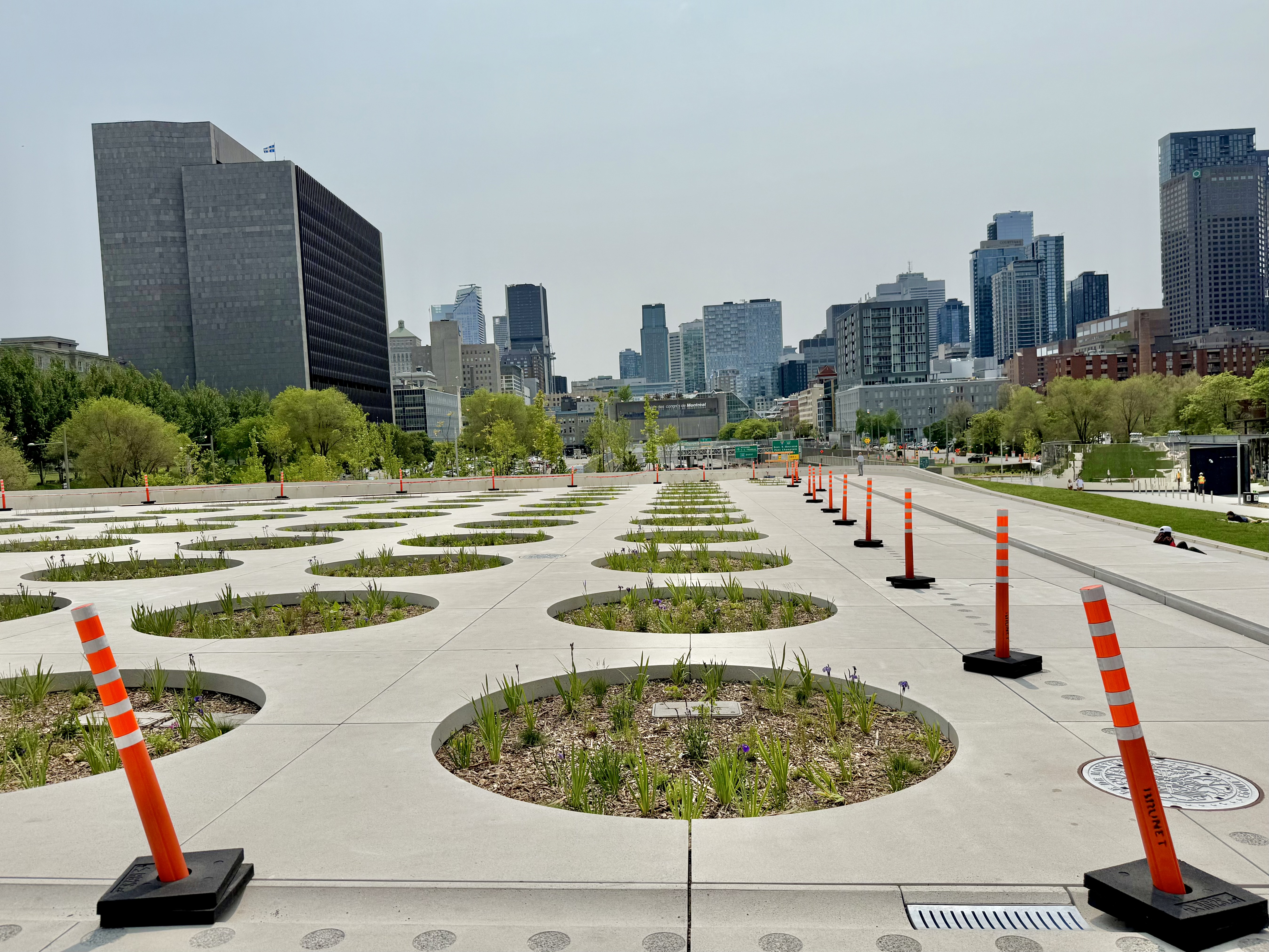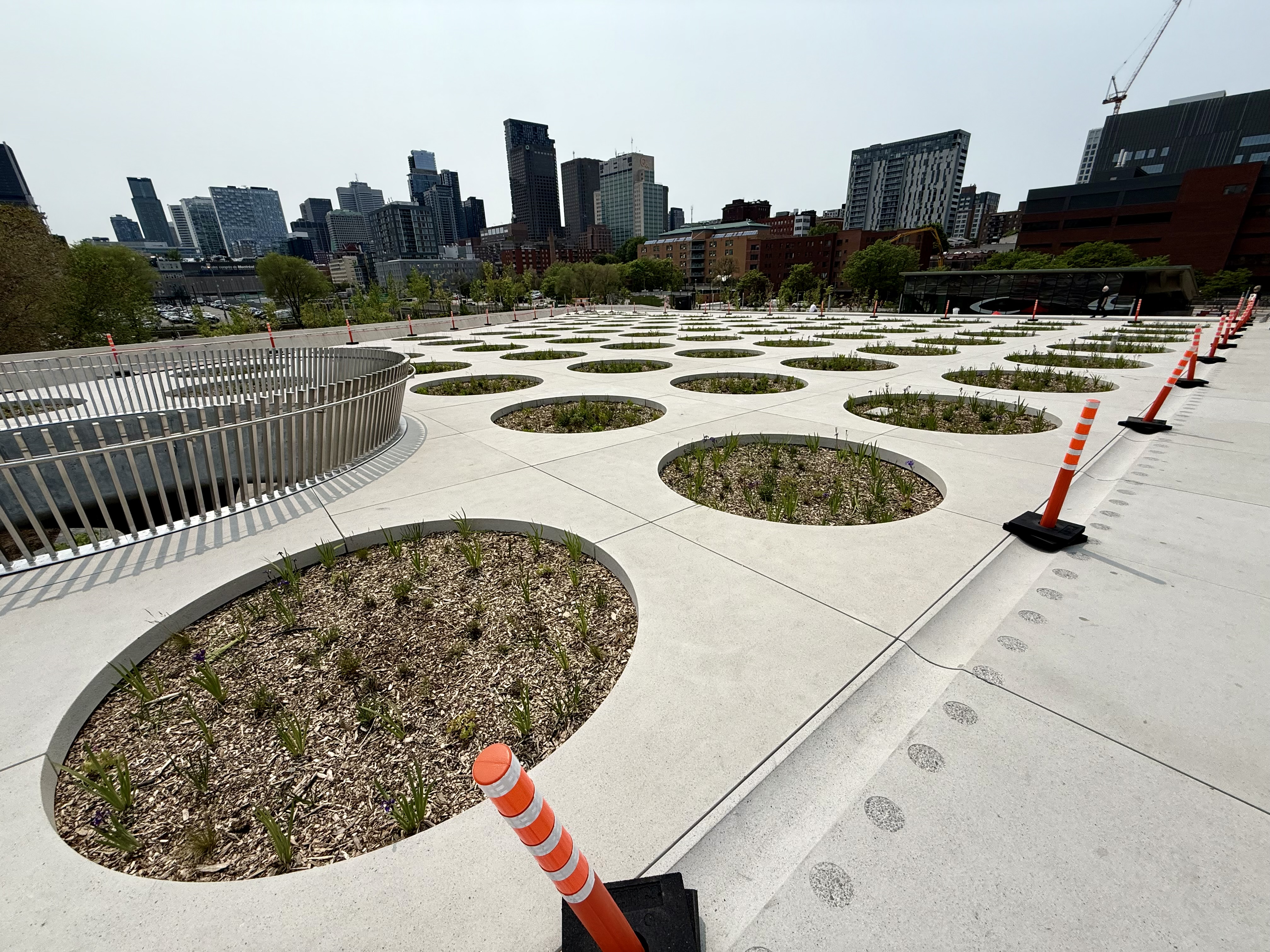 Je ne suis pas architecte, mais c’est vrai que j’y suis aller mardi soir et je suis trouve ça dangereux. Vraiment je ne comprends pas les trous ronds avec des Iris… C’est beau oui, mais quand les fleurs et les herbes vont pousser et remplir les trous, ils vont devenir presque invisibles. Ils manque des clôtures à certains endroit et surtout tous est BLANC se qui rends les rigoles et marches d’escaliers.