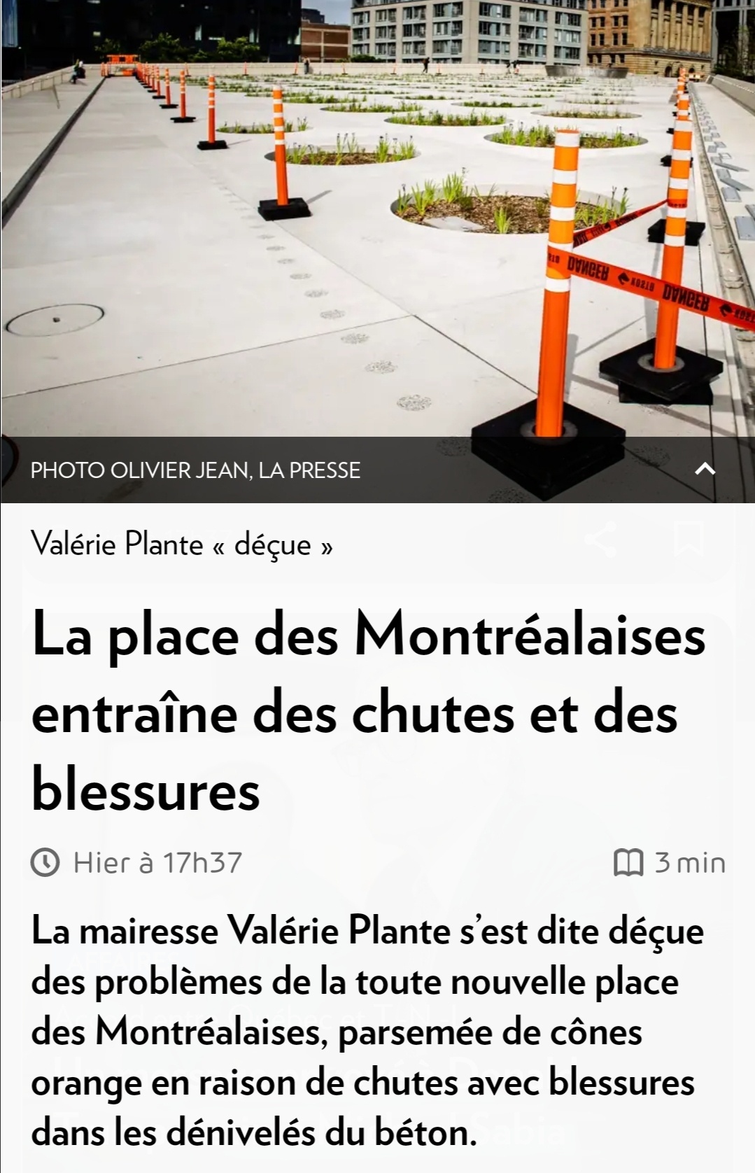 Oui je comprends mais avec cette mentalité là on va fermer tout les espaces publiques de Montréal. Je ne suis pas insensible aux gens qui se blessent mais de là à faire un article de journal sur des gens qui trébuchent dans une rigole c’est un peu extrême. Et puis des gens vont tomber dans les gros trous / bacs à fleur ? Give me a break.
