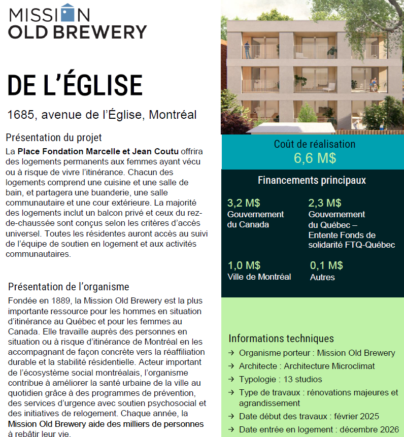 Le projet vise l’agrandissement du bâtiment existant ainsi que la restauration de la façade principale selon les composantes architecturales d’origine pour permettre l’aménagement de 13 petits logements destinés aux femmes qui sortent de l’itinérance.