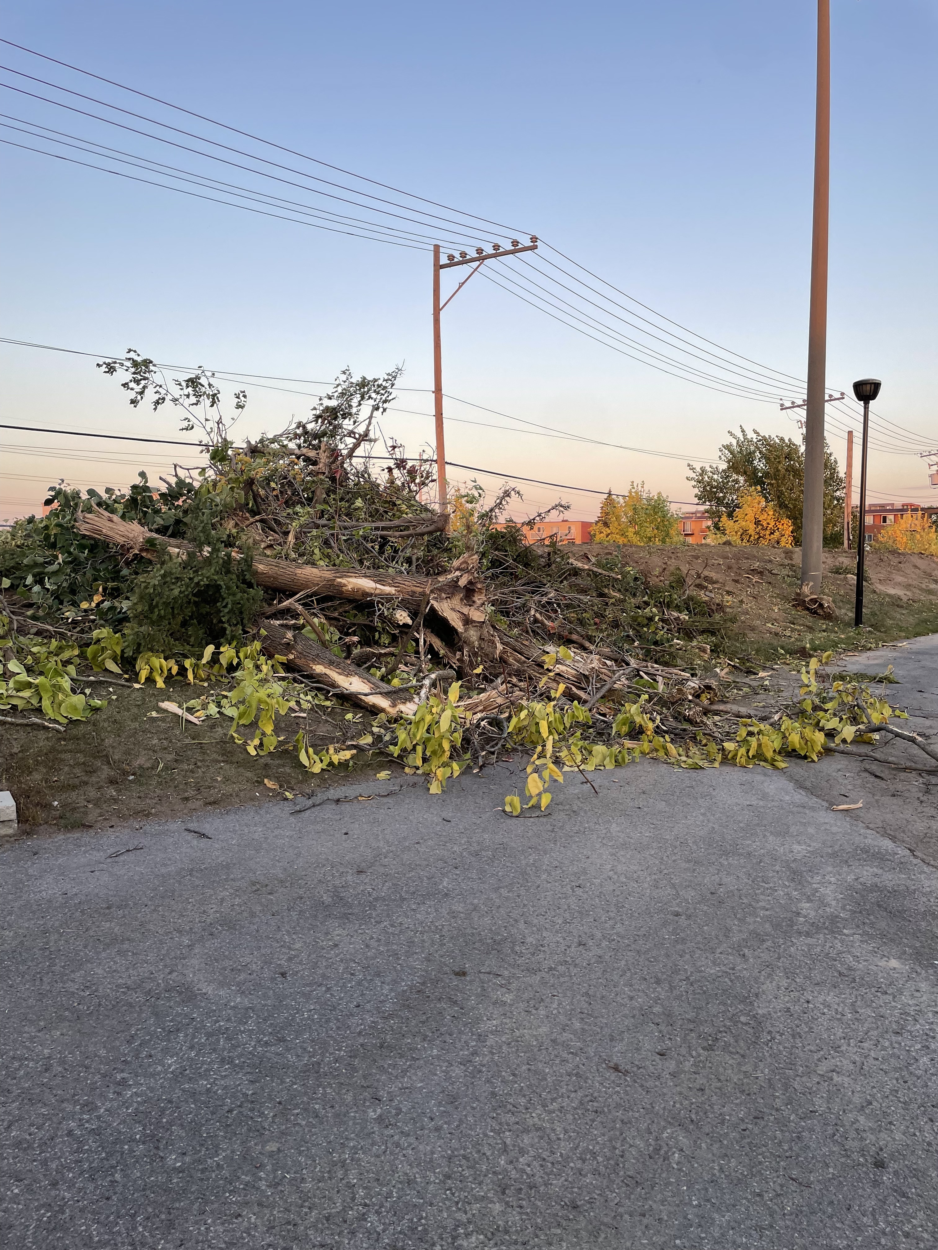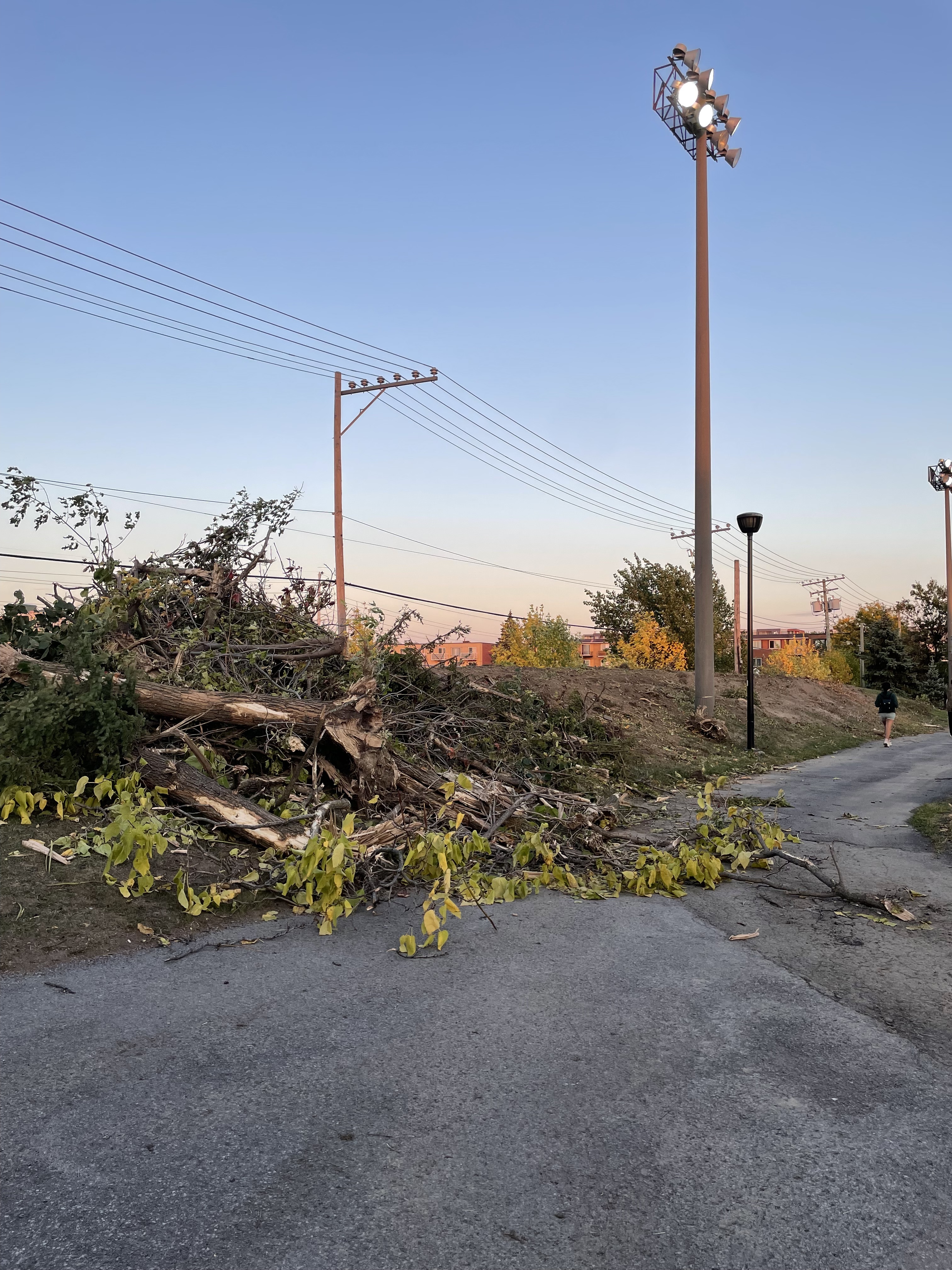 Pelles mécaniques et chantier déployés sur le parc voisin. Plusieurs arbres ont été coupés entre le parc et le site. Je ne suis pas certain, mais j’ai fortement l’impression qu’il s’agit de travaux préparatoire en amont de la mise en chantier du complexe résidentiel.