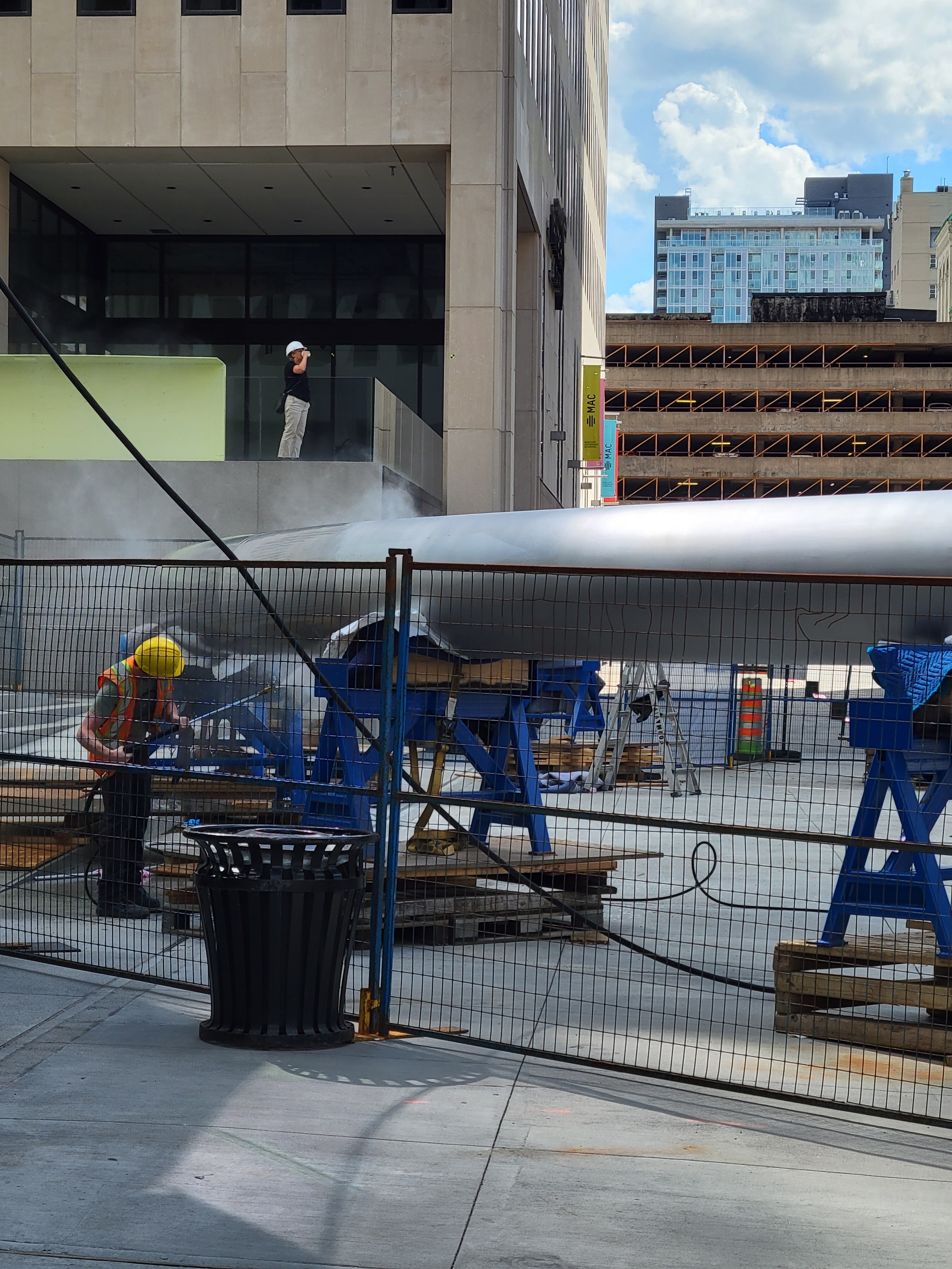 J’ai réalisé qu’ils doivent d’abord assembler la grue et ils viennent de commencer le lavage à pression de l’anneau; de plus le vent est assez fort présentement. J’ai l’impression qu’ils ne monteront pas l’anneau avant plus tard ce soir ou même cette nuit ou demain.