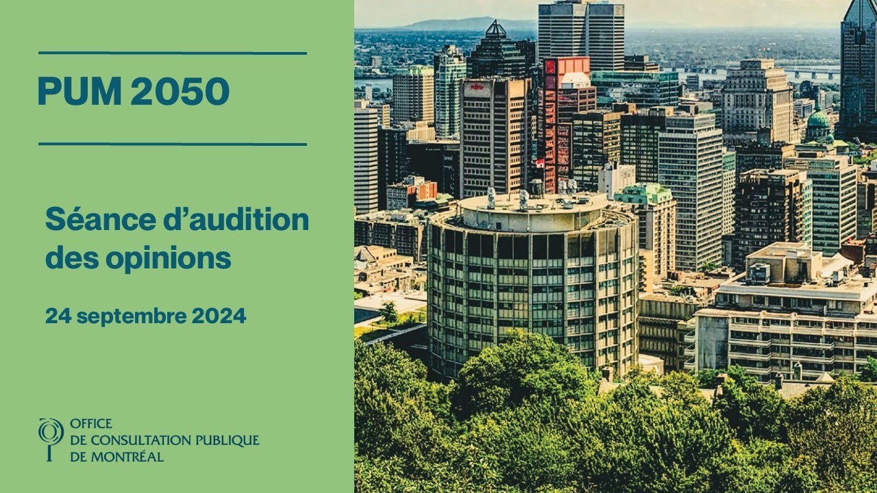 Les séances d’audition des opinions de la consultation publique sur le projet de plan d’urbanisme et de mobilité (PUM) 2050 de la Ville de Montréal ont été lancées mardi 24 septembre. Elles sont webdiffusées sur le site de l’OCPM.