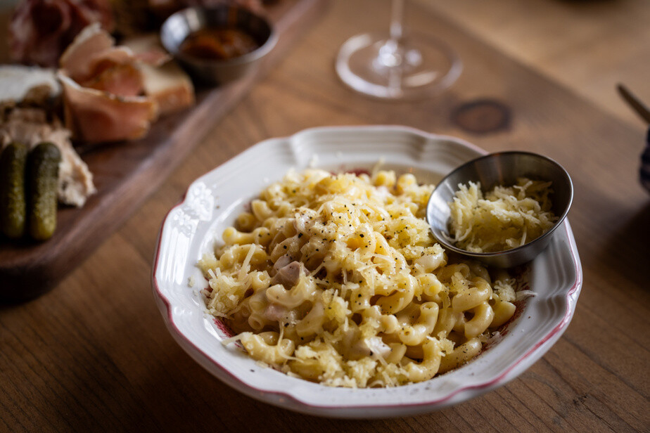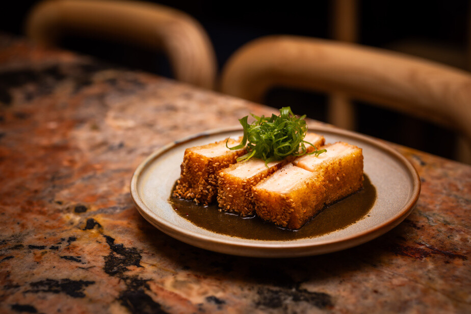 L’idée d’ouvrir un barbecue coréen et japonais haut de gamme a traversé l’esprit du propriétaire. Or, les besoins en ventilation étaient trop complexes pour le local. Il n’a toutefois pas abandonné l’idée du grill. En cuisine, le chef Emil Montgrain et le sous-chef Joseph Beaucage manient le binchotan, une variété japonaise de charbon, pour insuffler des notes fumées aux plats – dont la focaccia. Même le nom de l’adresse provient du nom de ce charbon particulier.