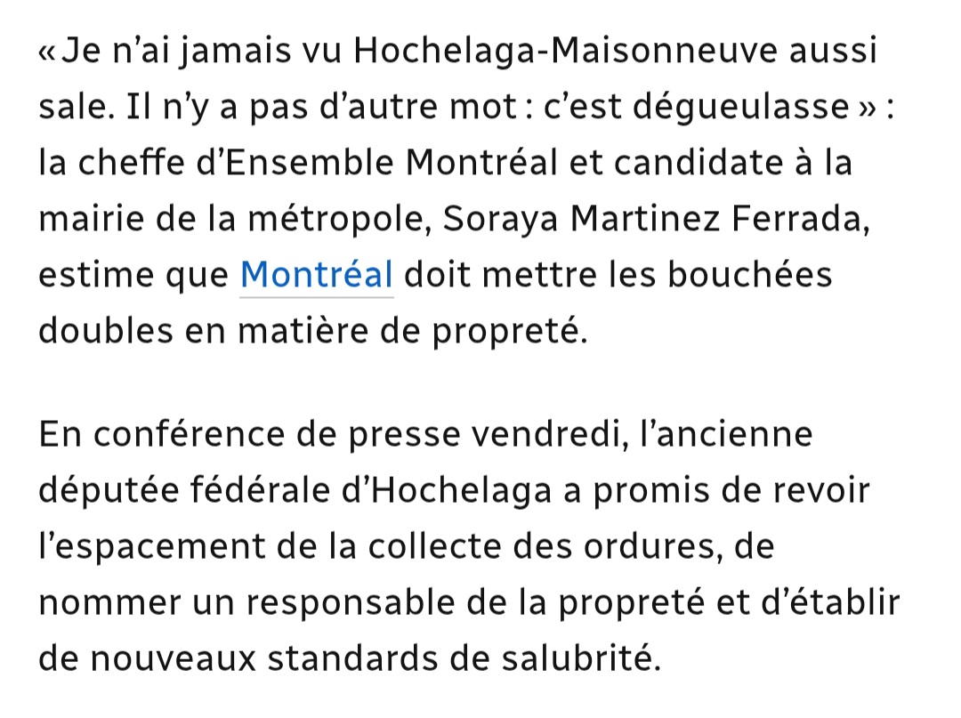 Peut-t-on ne pas embarquer dans ce jeu et parler de propreté, de crime, du niveau de taxation qui augmente sans hausses de services, des déficits chroniques de la STM etc.