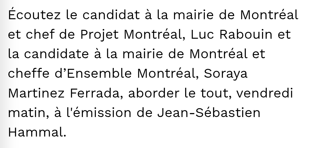L’aspirante à la mairie semble monopoliser le débat municipal actuellement. Bien hâte d’entendre les prises de position de Luc Rabouin et de Craig Sauvé sur cet enjeu. On ne les entend pas beaucoup.