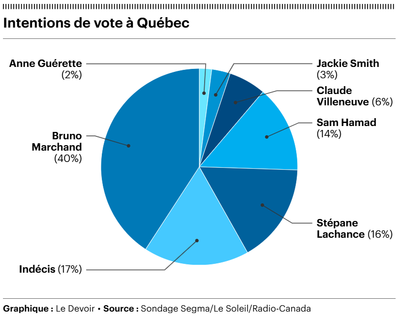 Sam Hamad, de son côté, perd un titre qu’il détenait depuis plus d’un an : celui d’adversaire naturel de Bruno Marchand. Son parti récoltait 22 % des suffrages en mai et n’avait qu’un seul point de pourcentage de retard sur les troupes du maire sortant. Cinq mois plus tard, Leadership Québec confirme sa descente et doit, désormais, combler un écart de 26 points de pourcentage pour espérer conquérir la mairie.