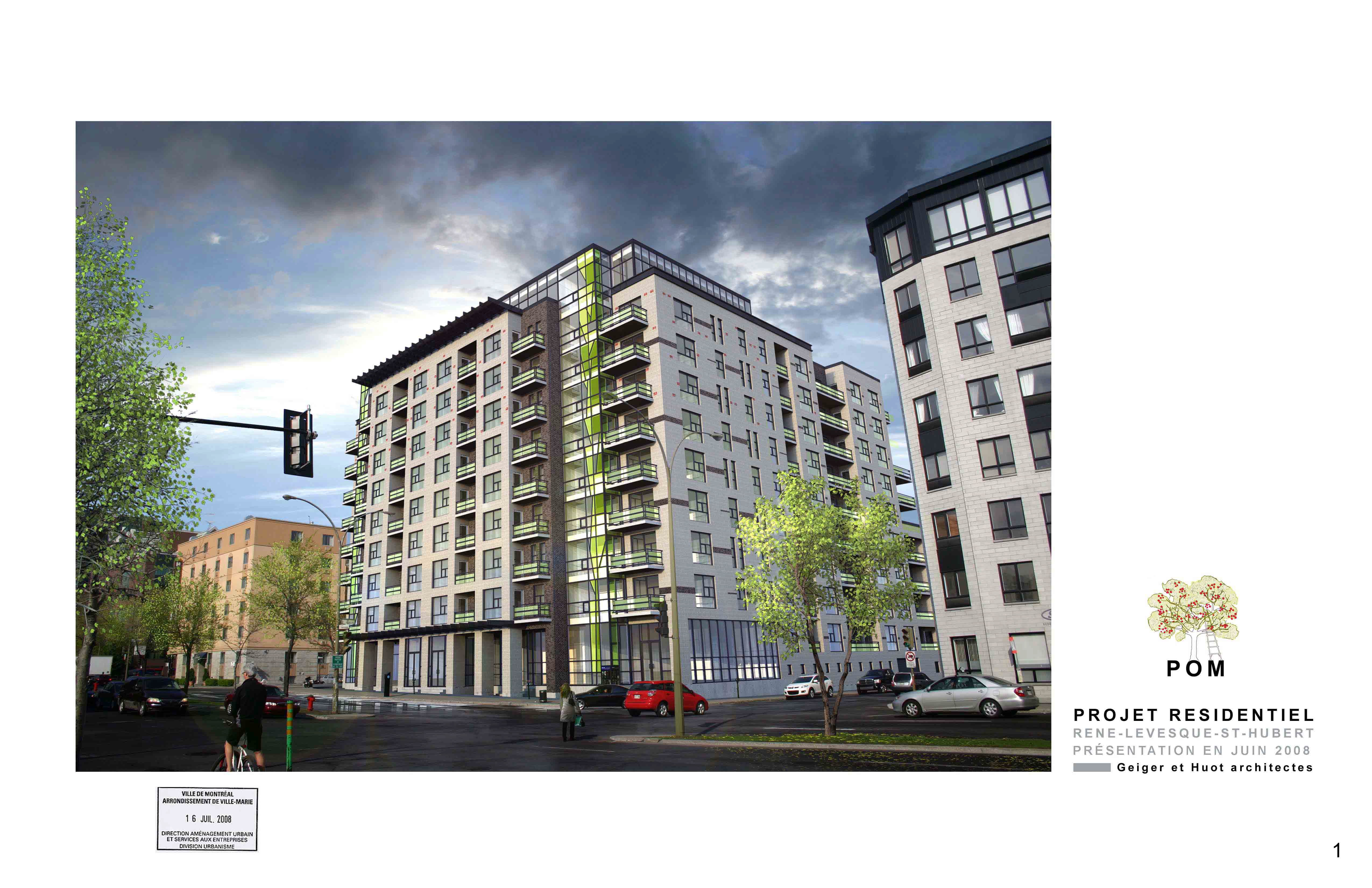 Édifice comptant 138 condominiums réalisé par Canvar à l’angle de la rue Saint-Hubert et du boulevard René-Lévesque, à proximité de la station de métro Berri-UQAM.