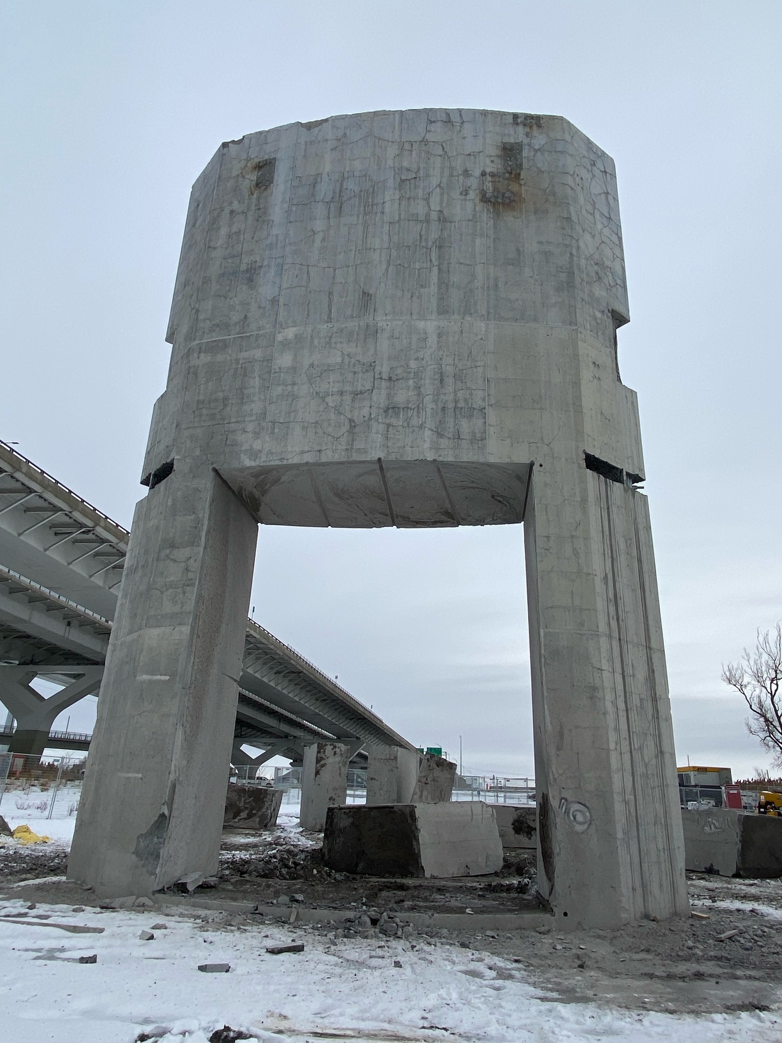 DÉVELOPPEMENT DURABLE | Les travaux avancent bien pour le projet #HéritageChamplain. Du côté de Brossard, la pile qui demeure en place pour commémorer le pont Champlain d’origine a été préalablement renforcée, puis percée à l’aide d’une scie à câble afin de retirer le bloc de béton avec une pelle hydraulique.