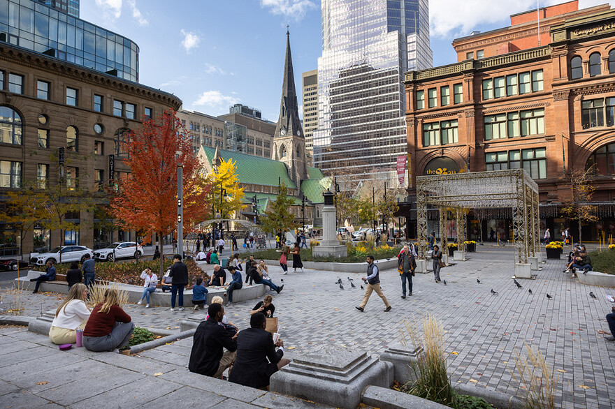 Le square Phillips, au coin de la rue Sainte-Catherine Ouest et de l’avenue UnionLes esplanades projetées dans la rue Sainte-Catherine, qui s’apparentent à des parcs urbains avec leur mobilier pour s’asseoir et se prélasser, pourraient subir un sort similaire, craint-il. D’autres partagent cette inquiétude.