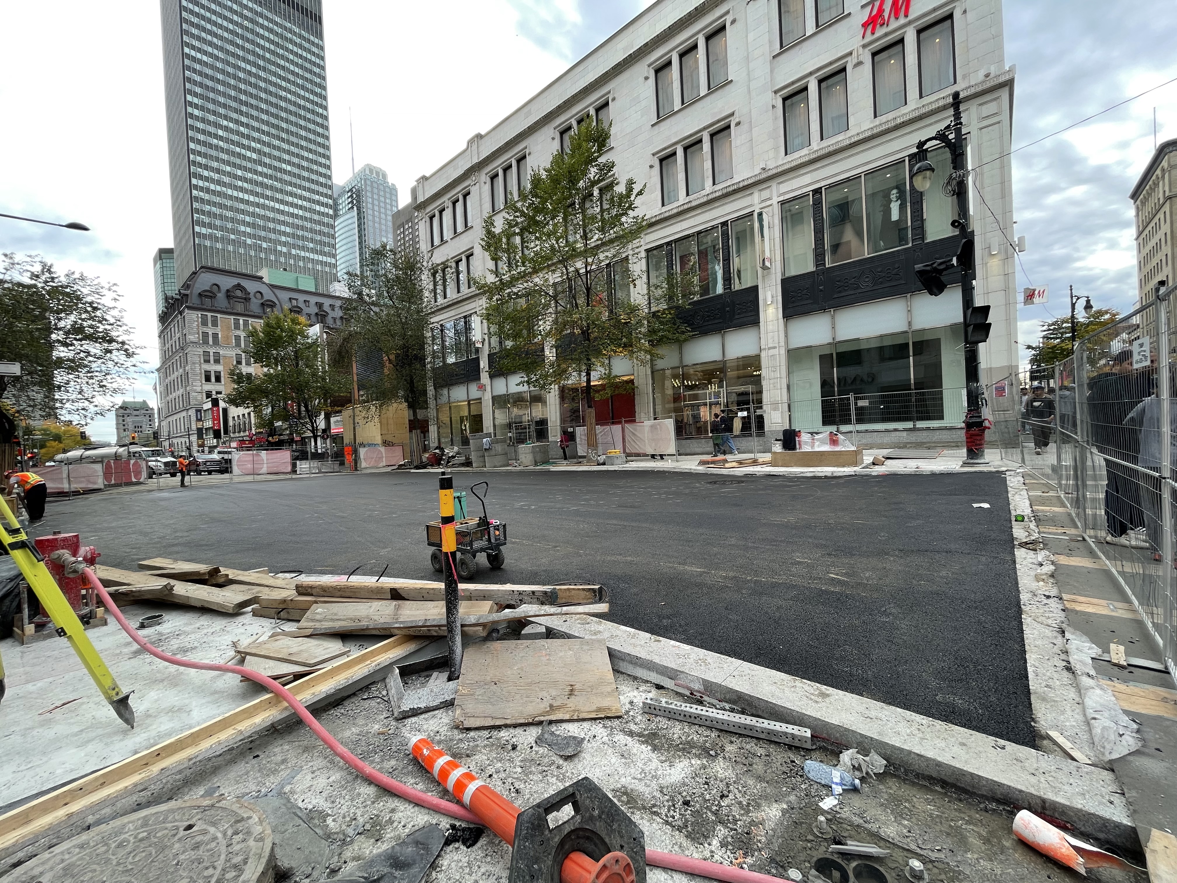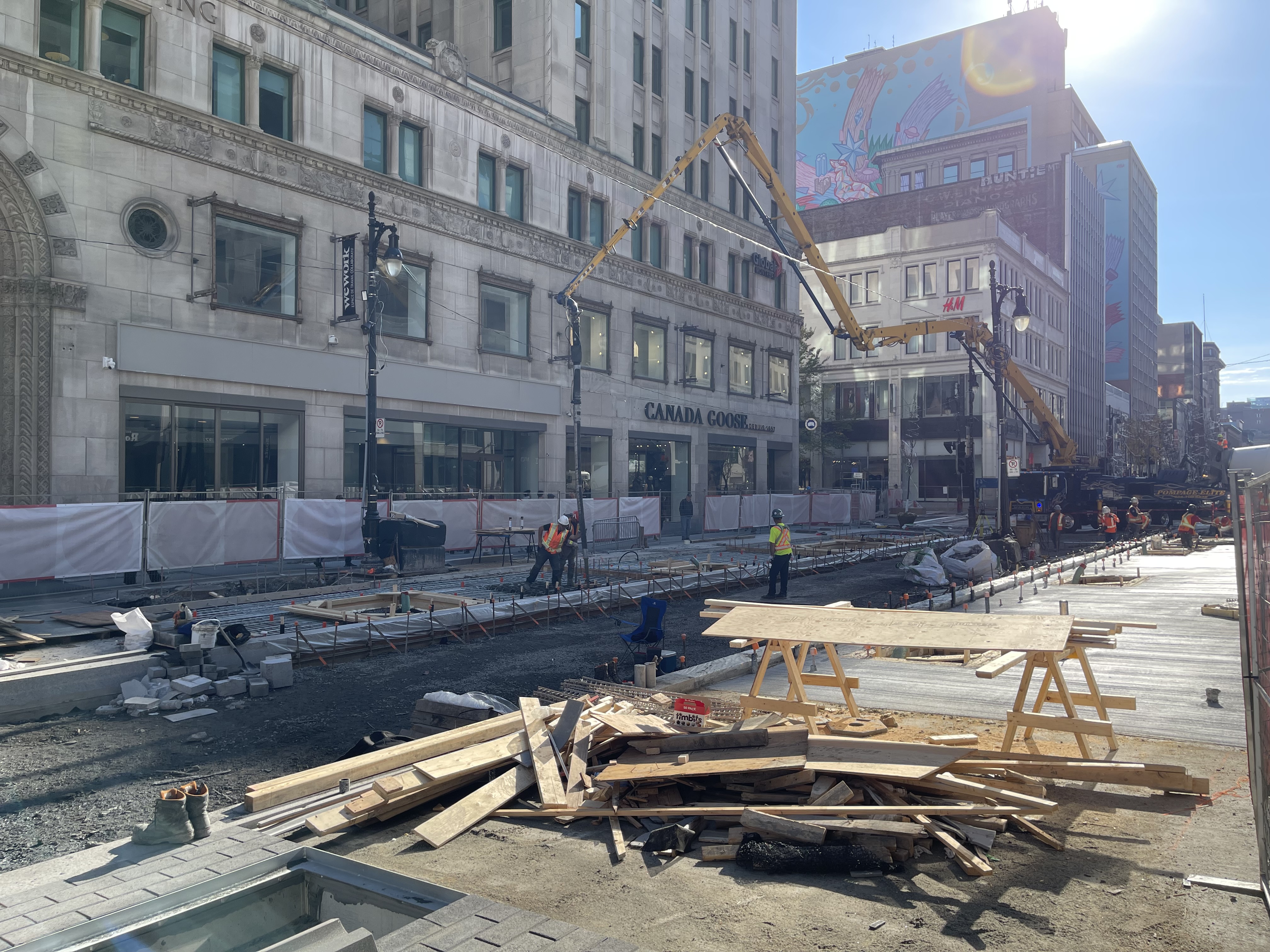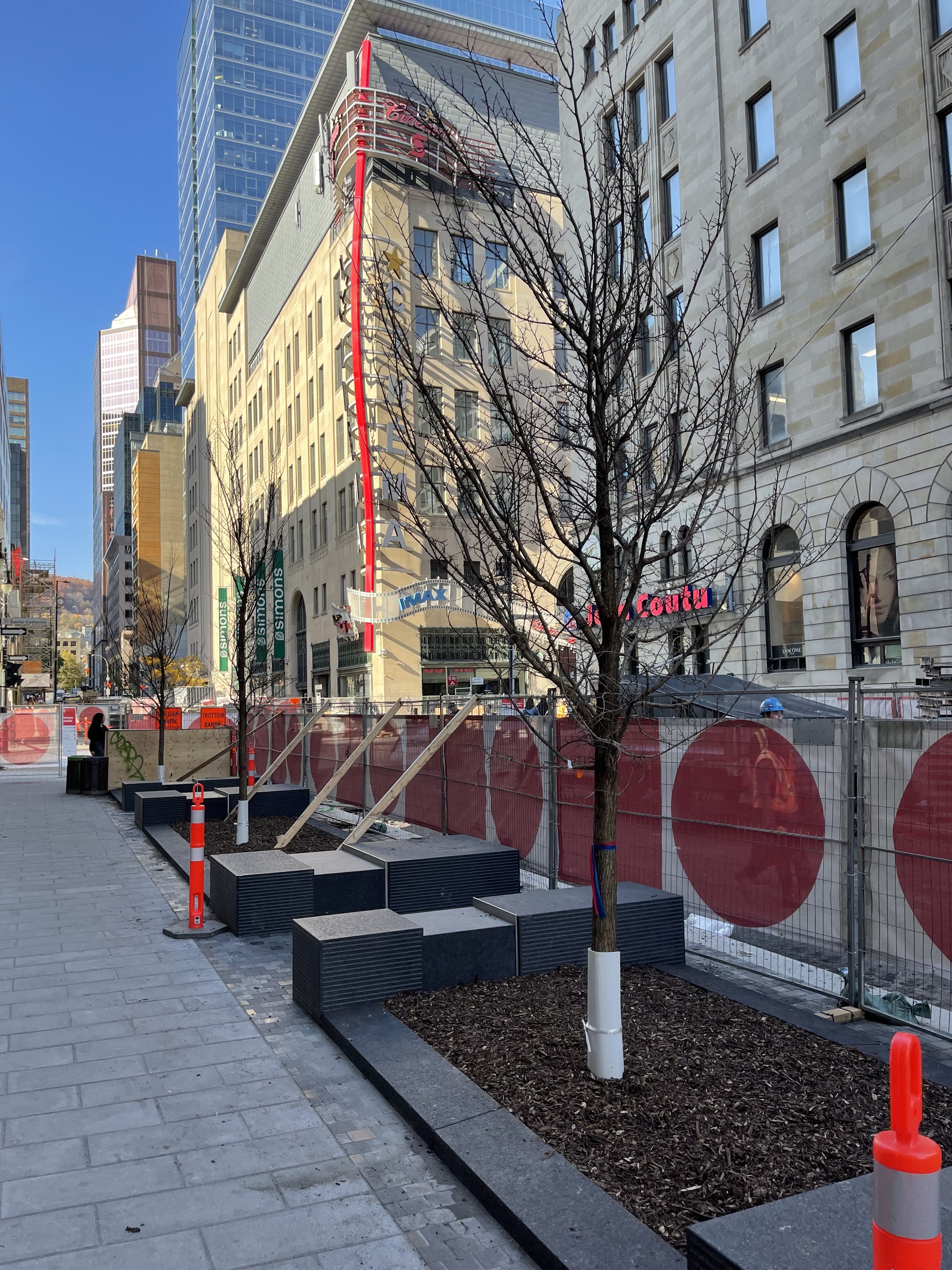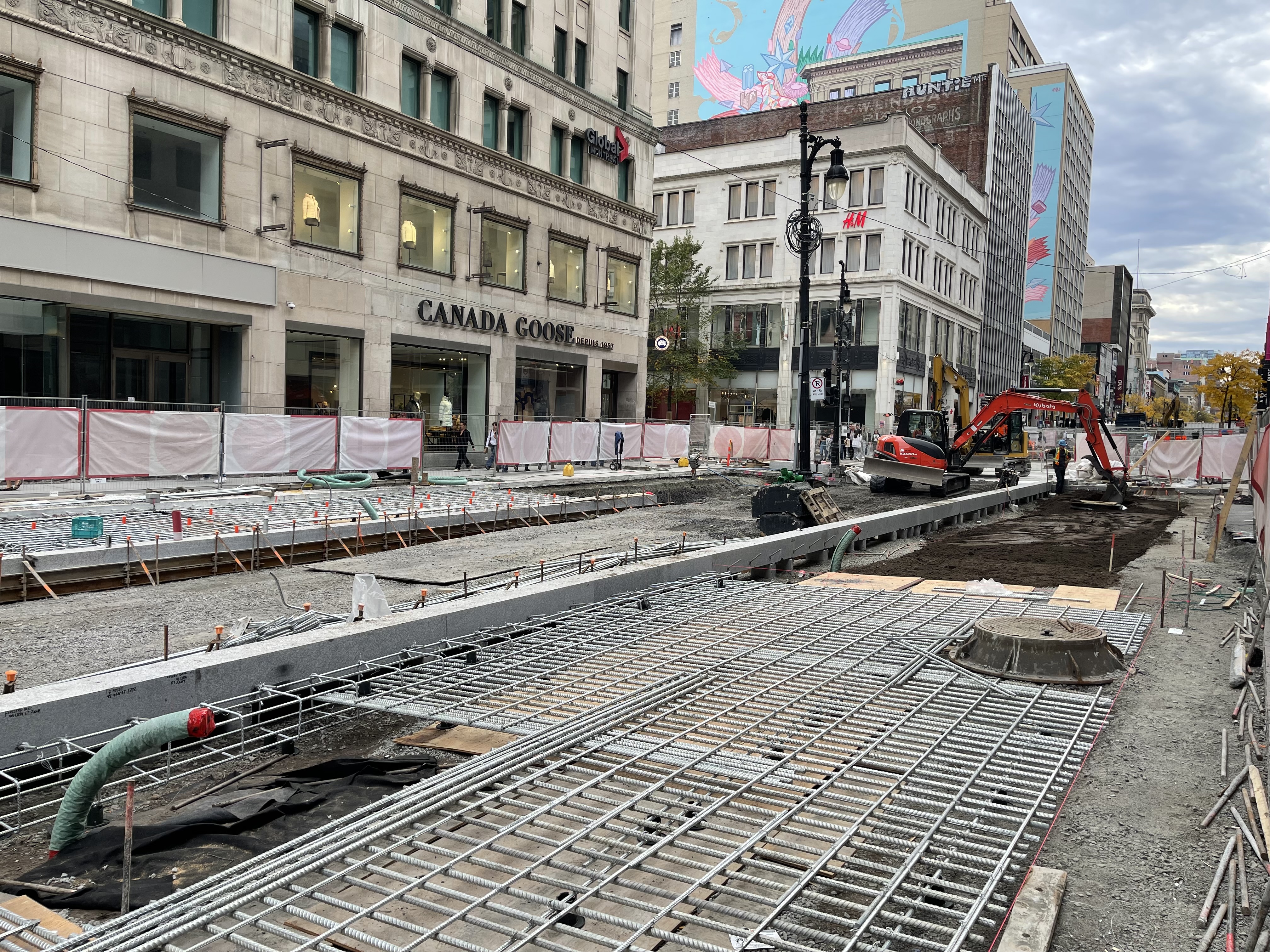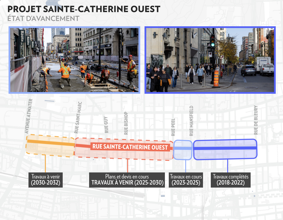 La rue Sainte-Catherine Ouest sera en chantier au moins jusqu’en 2032. Réfection des infrastructures souterraines, élargissement des trottoirs, verdissement : ces travaux changeront le visage de la mythique artère commerciale.
