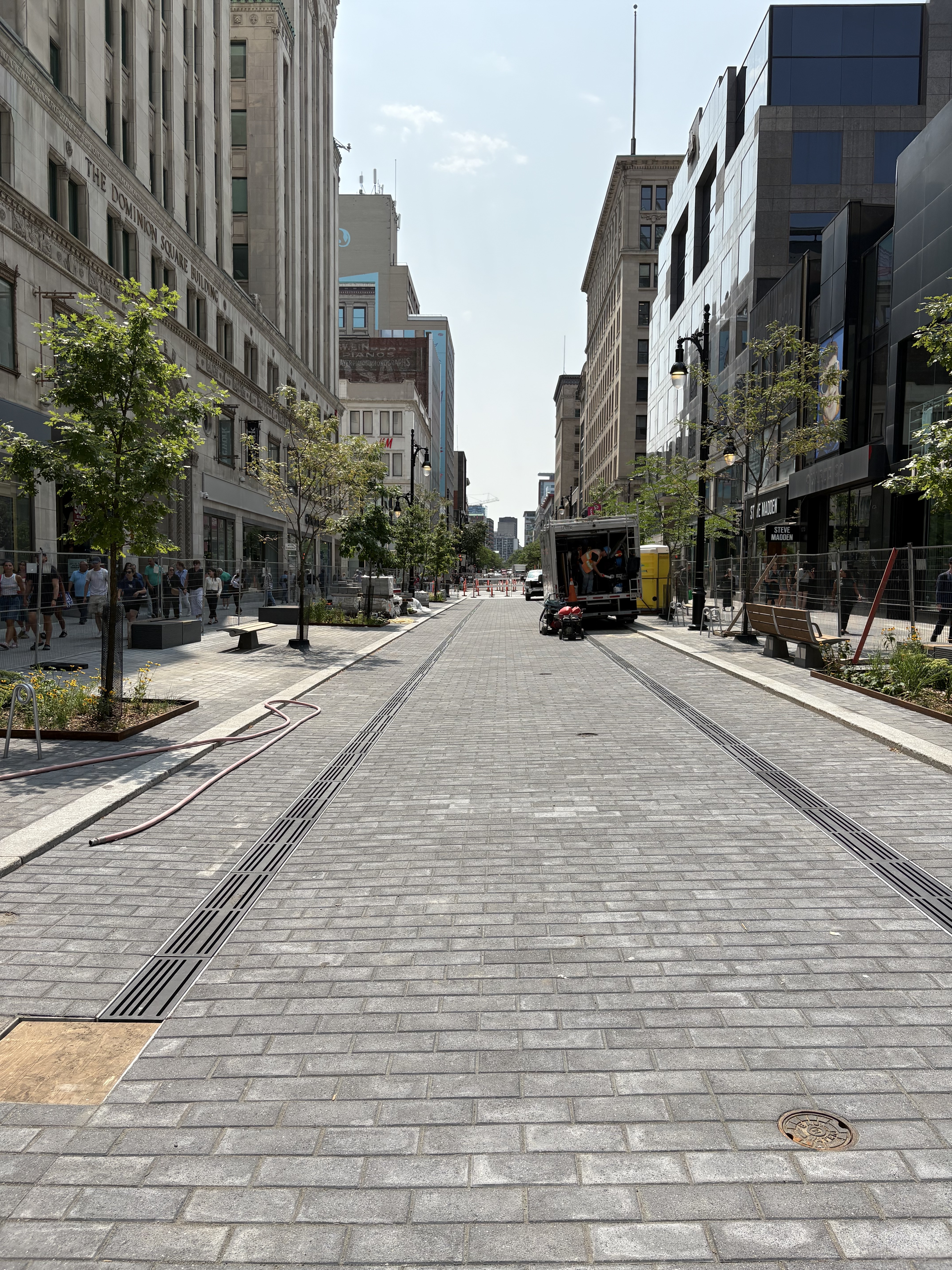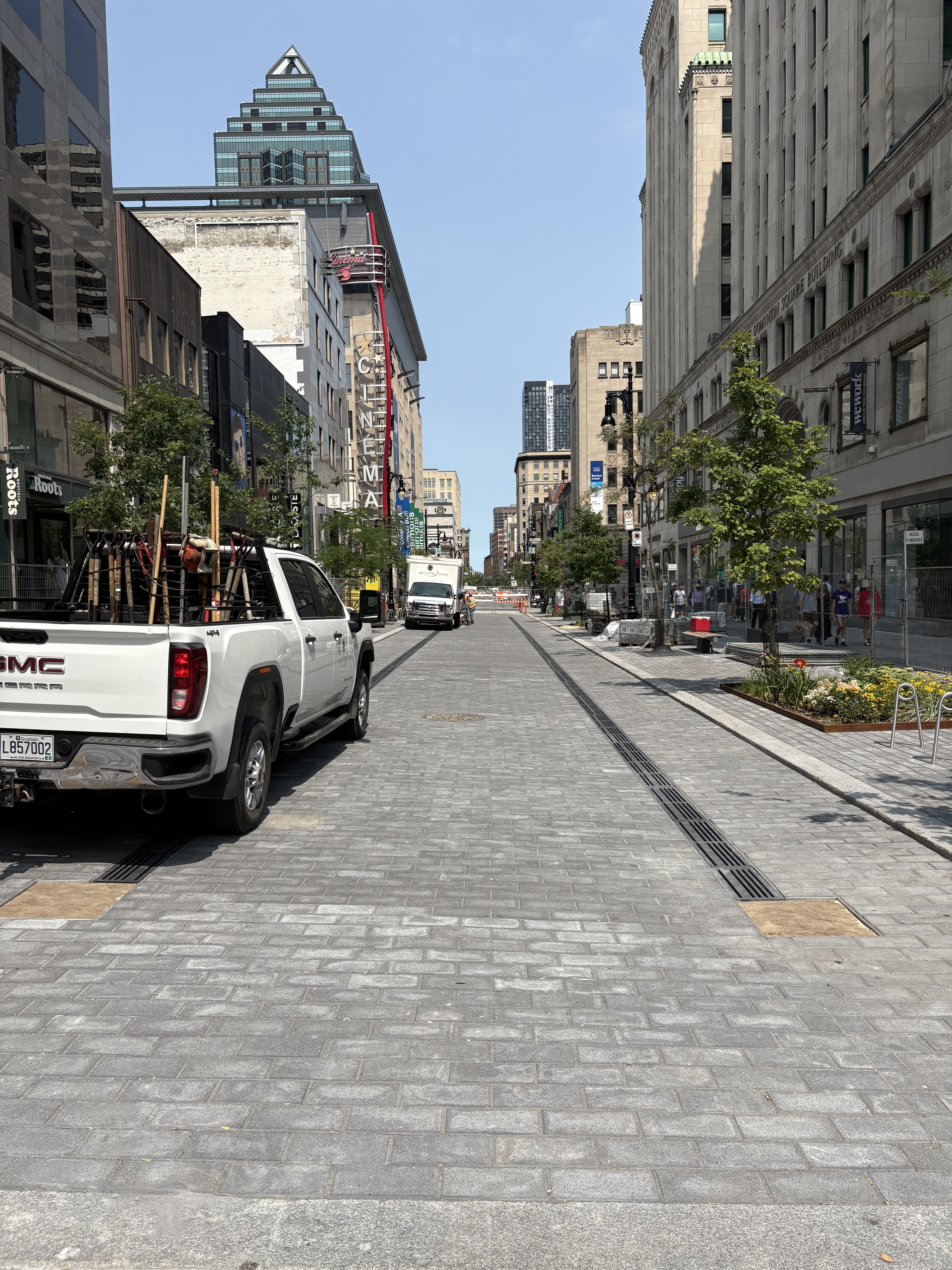 Le granite aux intersections ajoute vraiment de la classe à cette phase. J’ai marché de Peel à Place-des-Arts hier soir et on voit vraiment la différence avec la phase 1. La phase 2 est plus raffinée, plus réfléchie. La phase 1 fait vraiment cheap et les intersections sont déjà toutes cassées. Architecture jetable comme on dit si bien par ici…