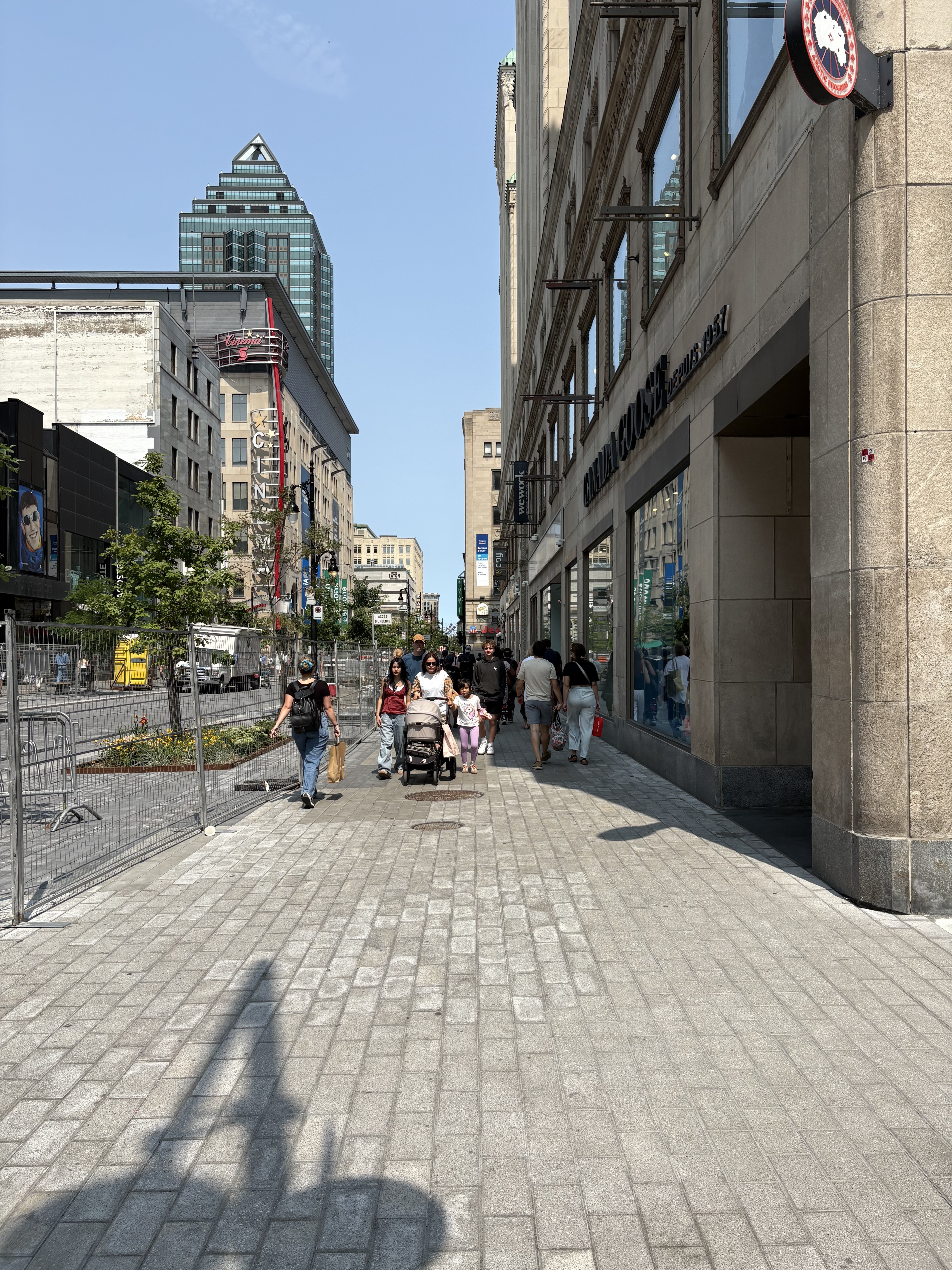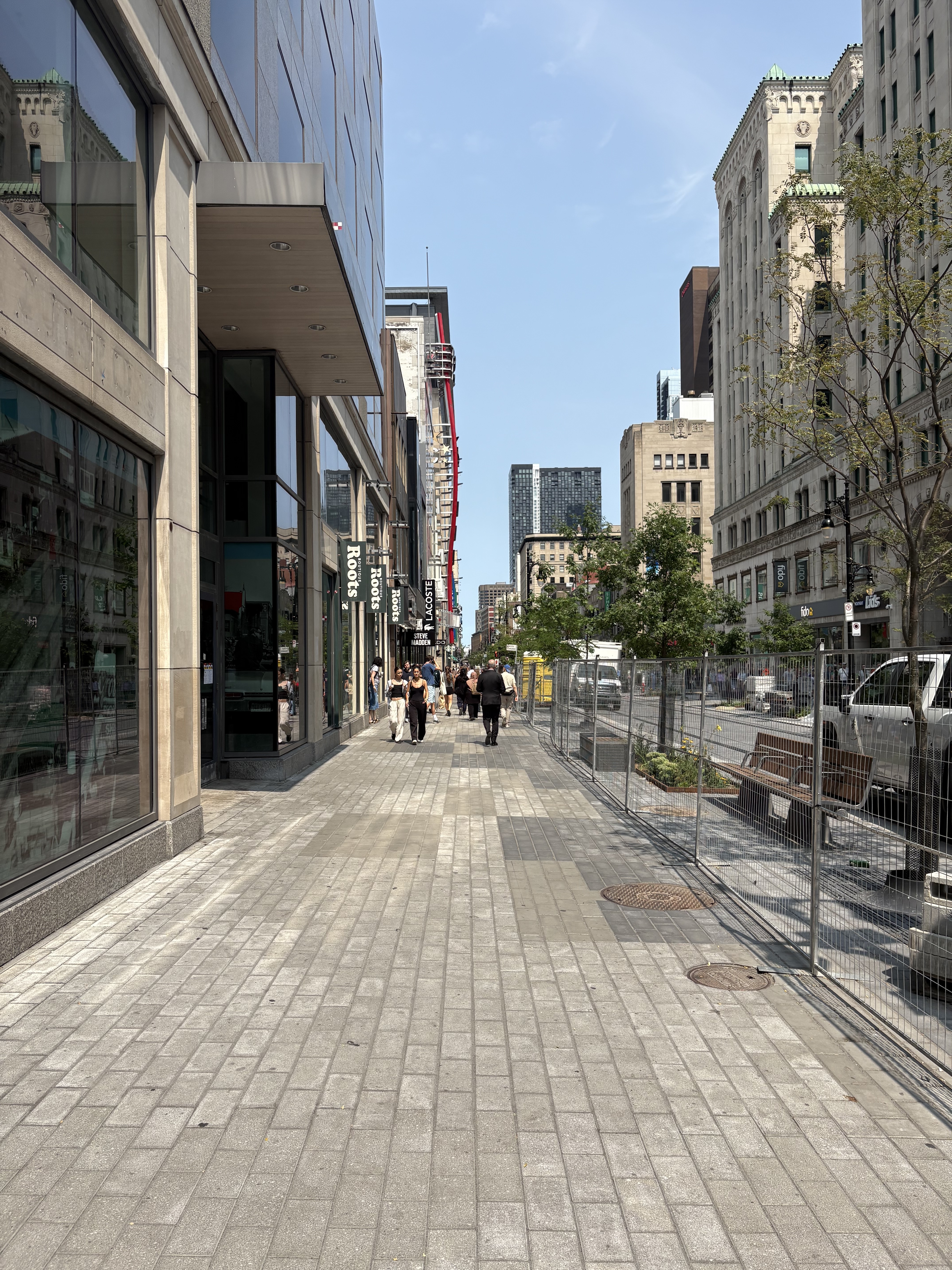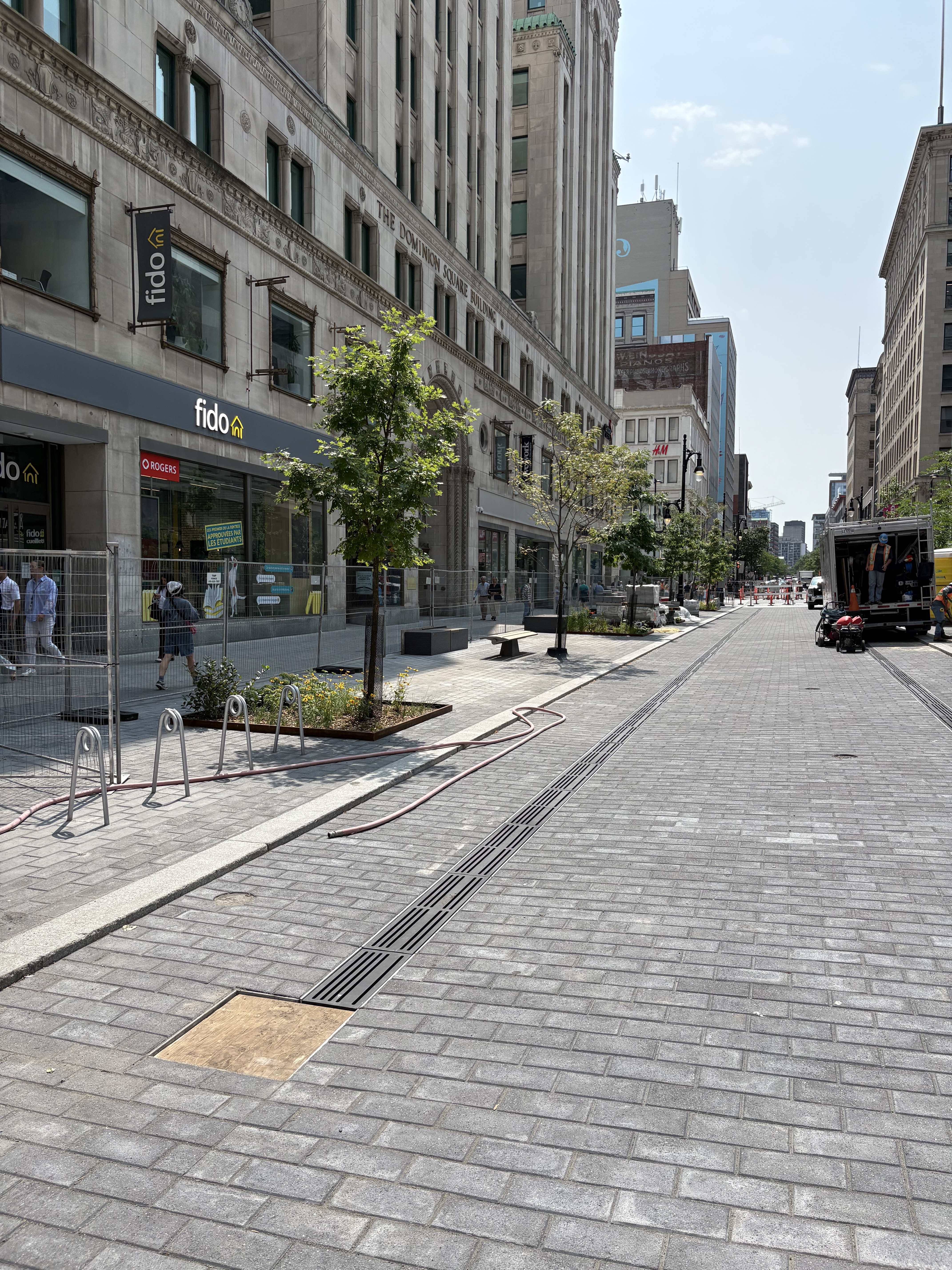We should be prioritizing pedestrian space over plans that prevent the flow of all the pedestrians. Trees are perfect, they can go above and create a canopy over time, but with the limited space on a street I think planters on the main commercial artery should be used for pedestrians to walk through. I like plants a lot, especially on streets just off of Sainte-Catherine which is lacking downtown here especially on side streets like de la Montagne, Crescent, Mackay, etc.