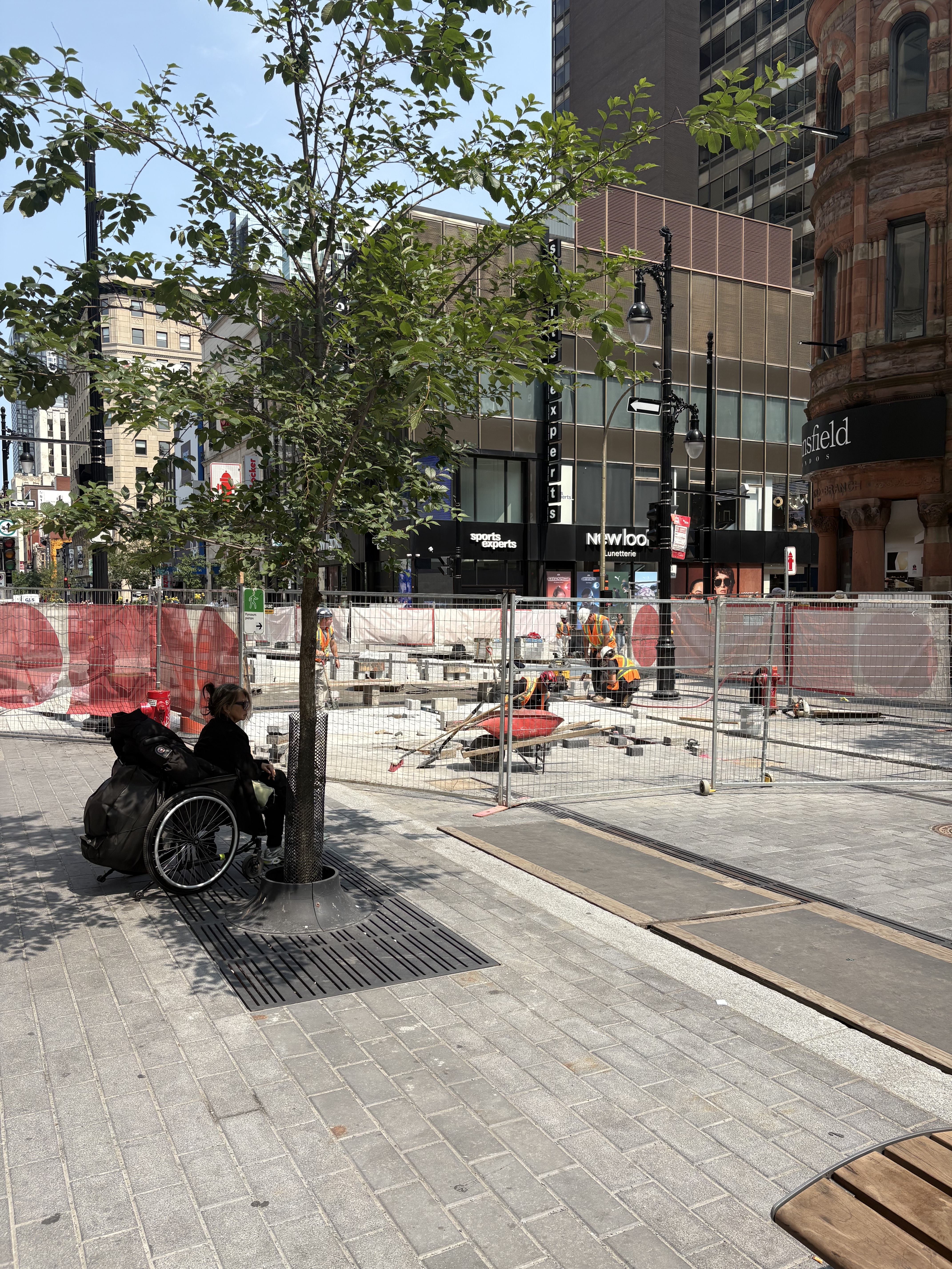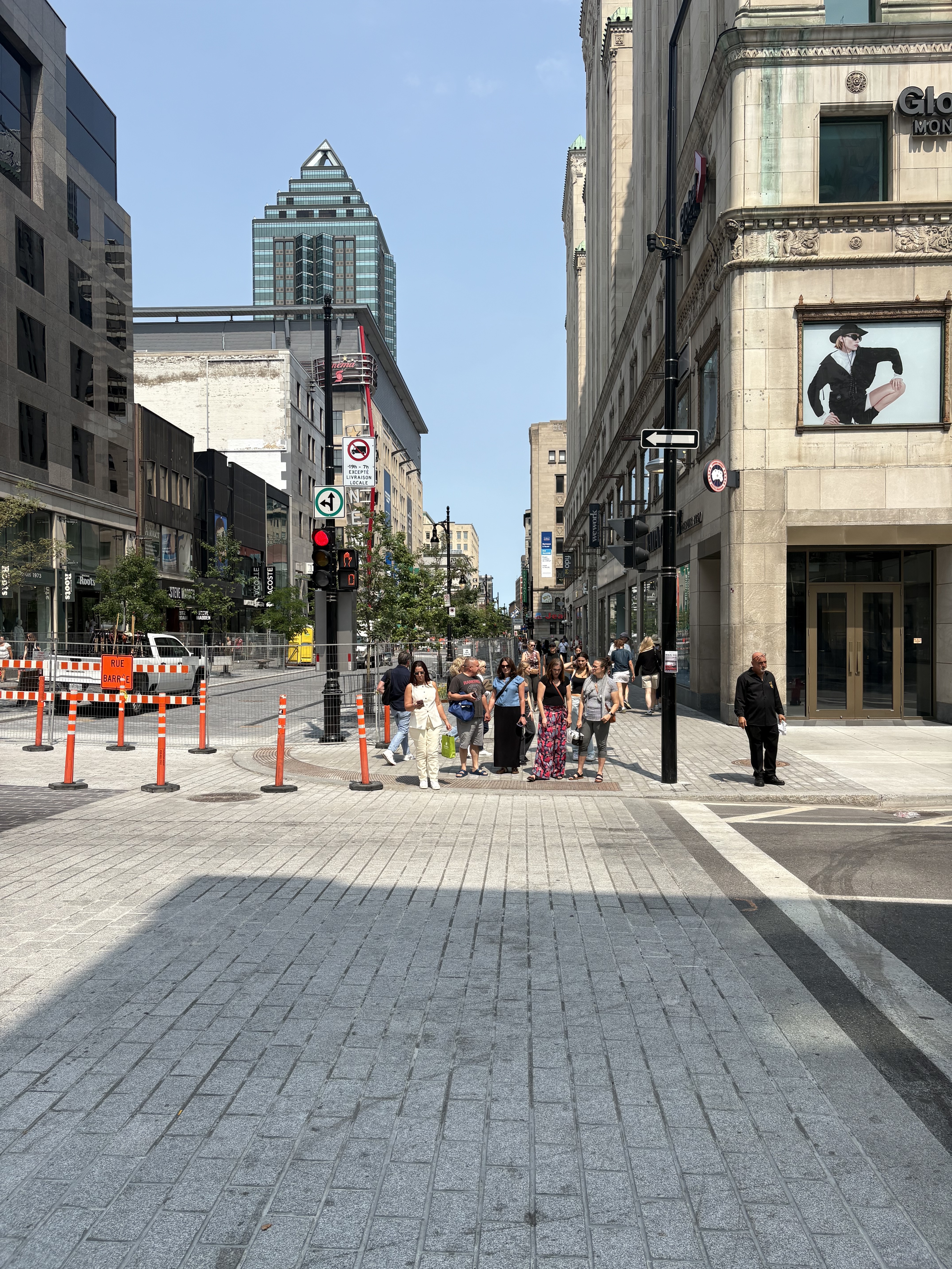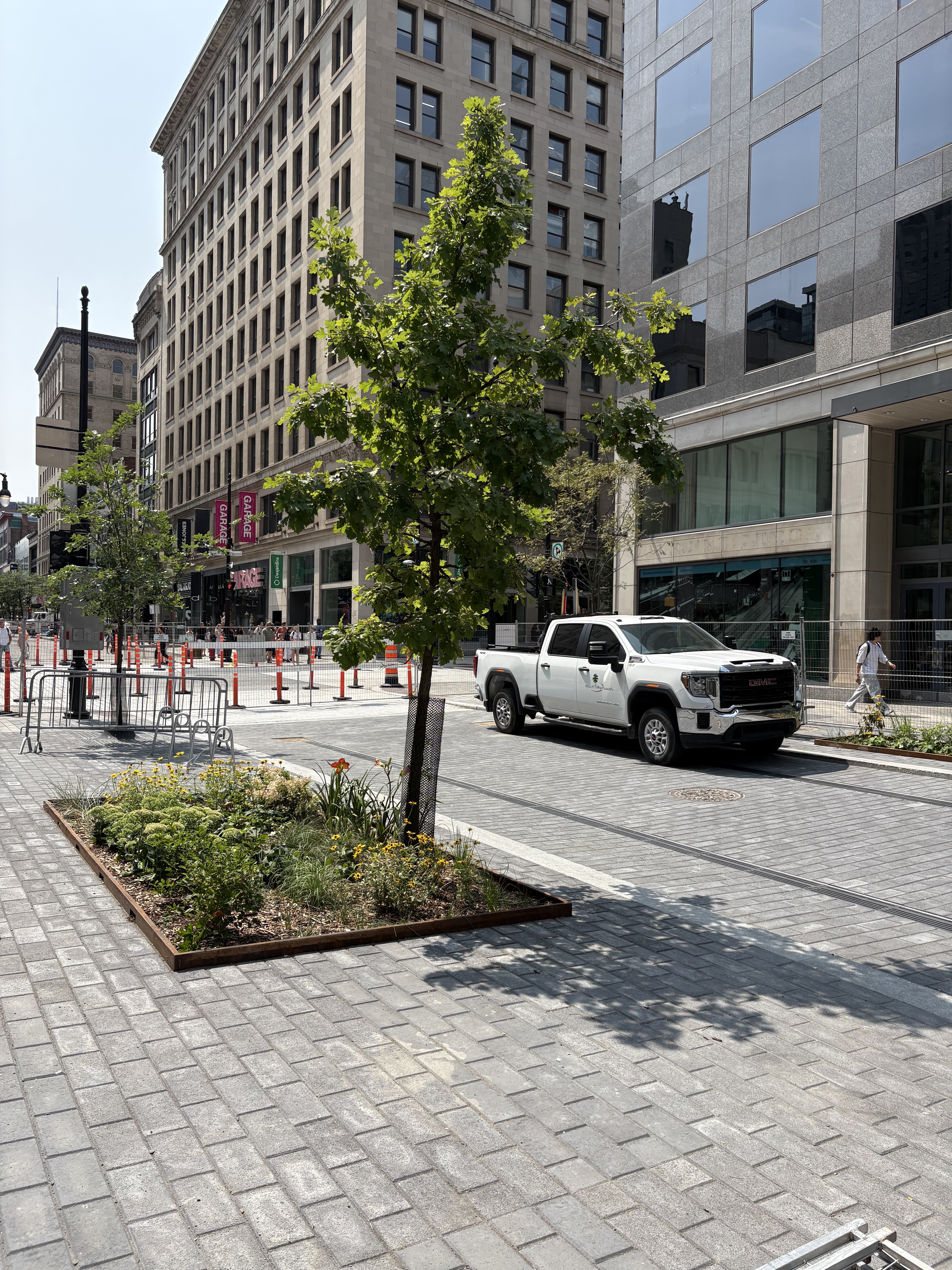 We should be prioritizing pedestrian space over plans that prevent the flow of all the pedestrians. Trees are perfect, they can go above and create a canopy over time, but with the limited space on a street I think planters on the main commercial artery should be used for pedestrians to walk through. I like plants a lot, especially on streets just off of Sainte-Catherine which is lacking downtown here especially on side streets like de la Montagne, Crescent, Mackay, etc.